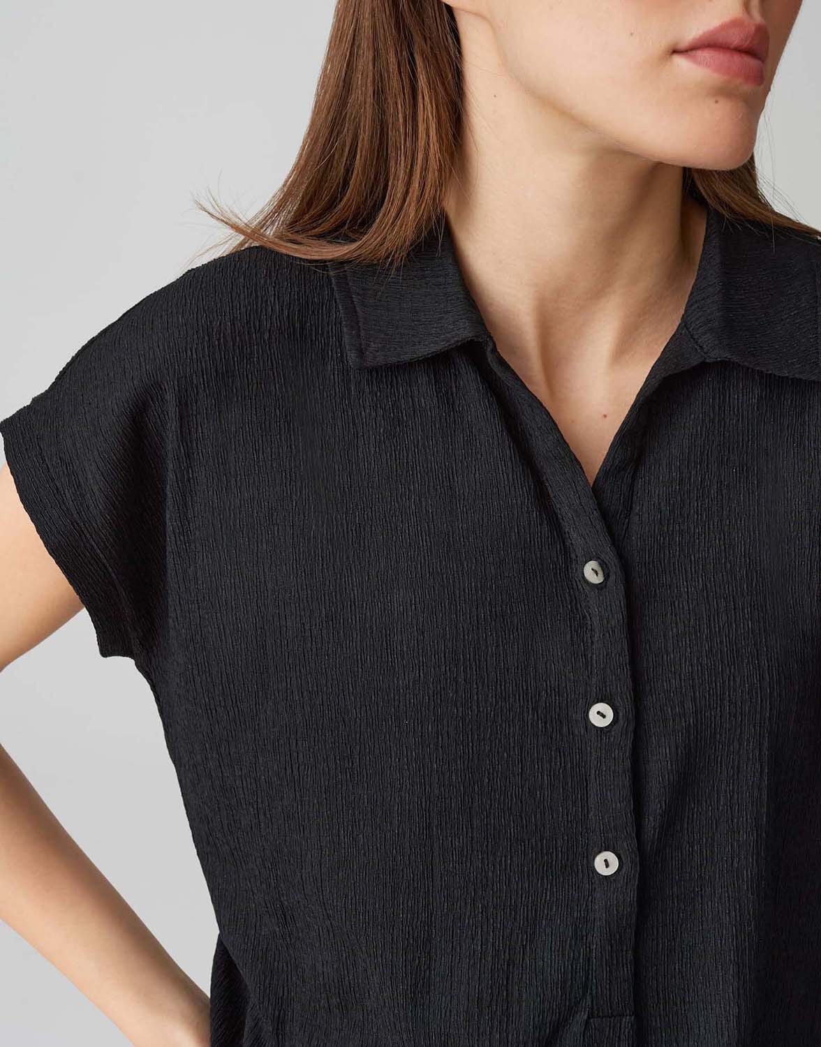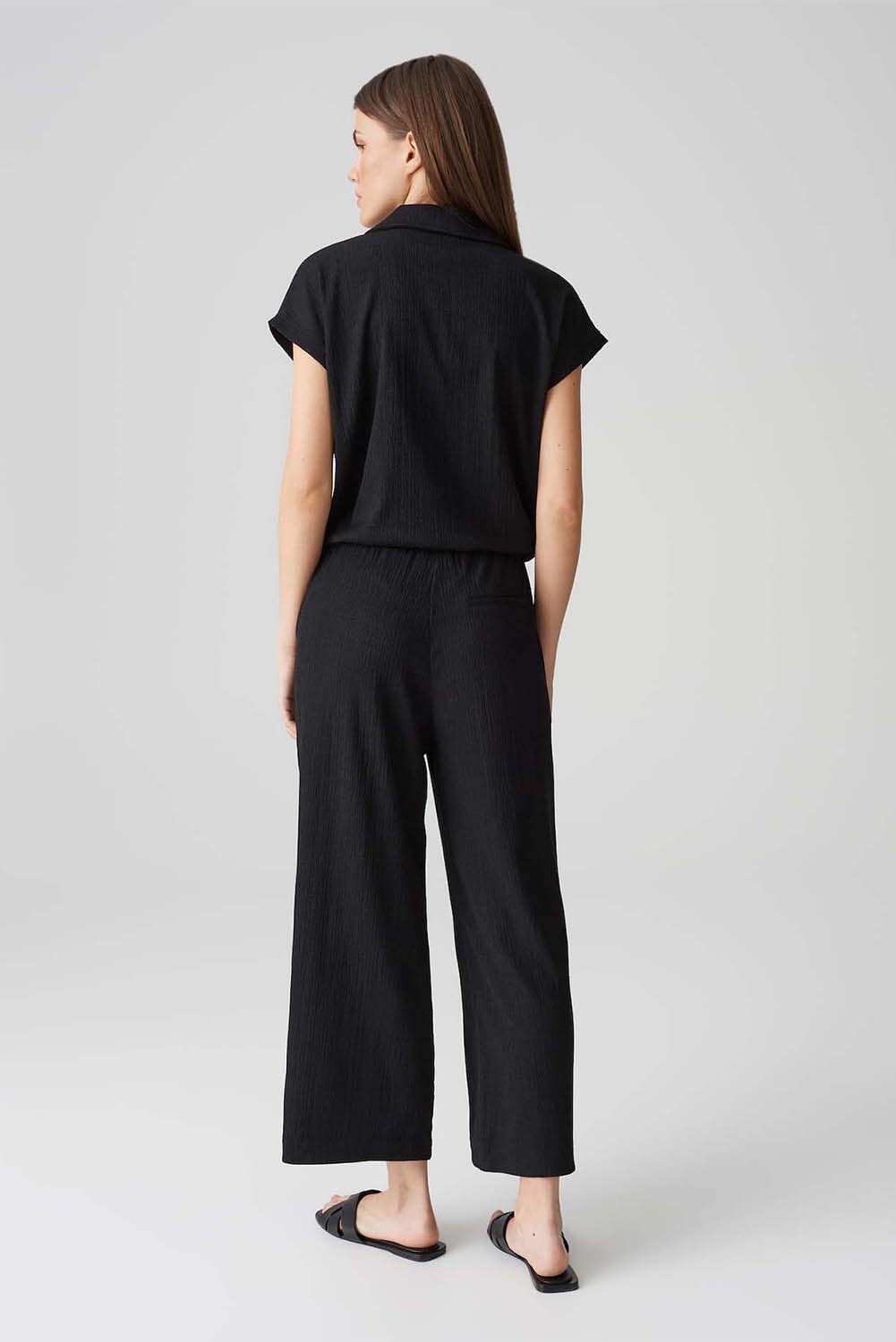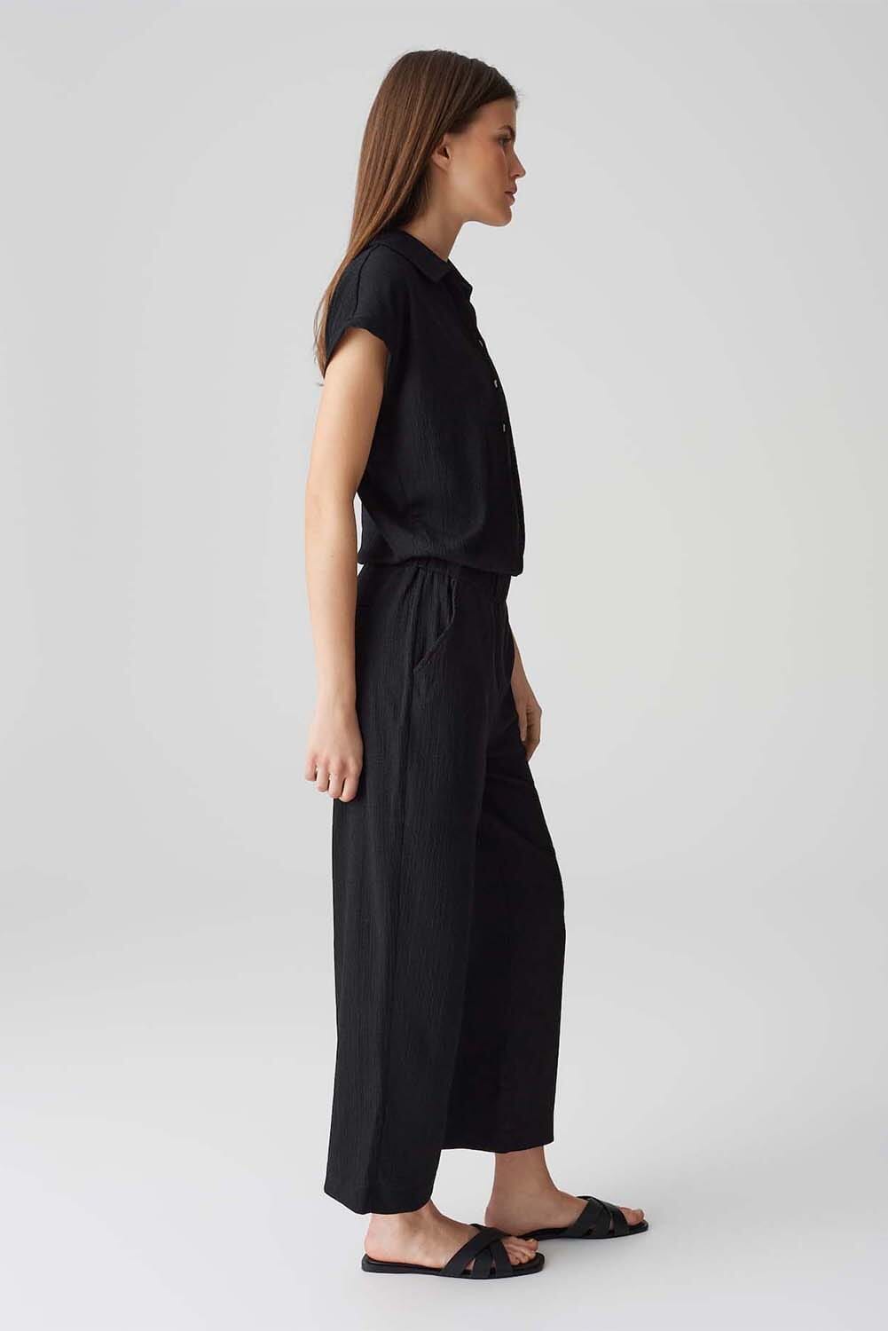 De dames jumpsuit van Opus biedt een minimalistische stijl met een elastische taille en zakken op de voorzijde. De puntkraag en korte mouwen geven een casual uitstraling, terwijl de effen patroon en knopen voor een stijlvolle afwerking zorgen.