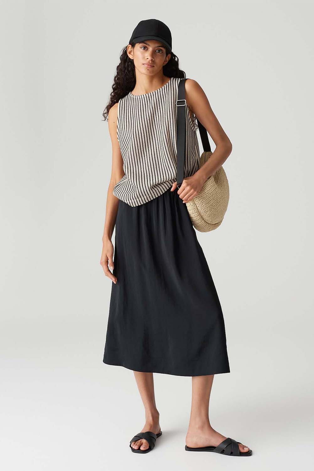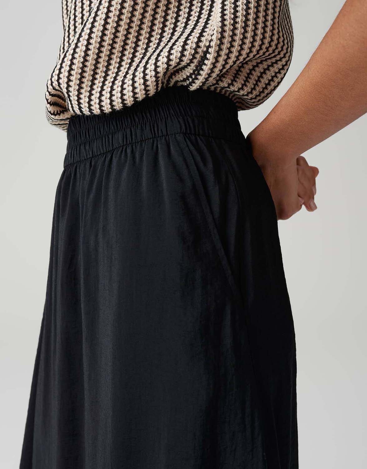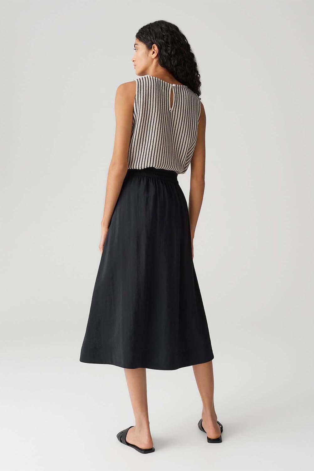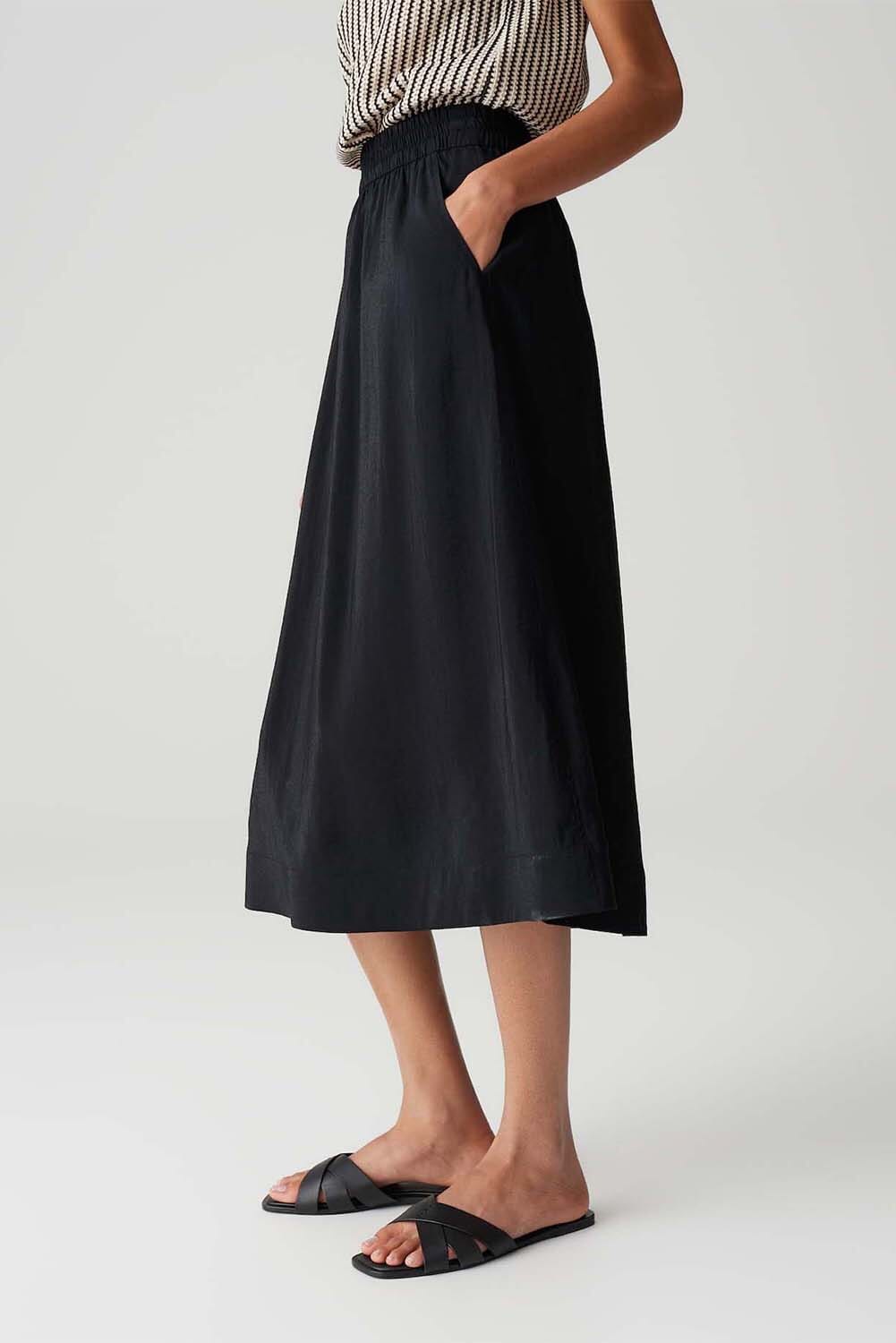 Rok Ronella van Opus is een stijlvolle midi rok met een casual uitstraling en een effen patroon. De rok heeft een comfortabele elastische taille die perfect past bij elke gelegenheid. Ideaal voor wie een eenvoudig maar elegant kledingstuk zoekt dat veelzijdig te combineren is.