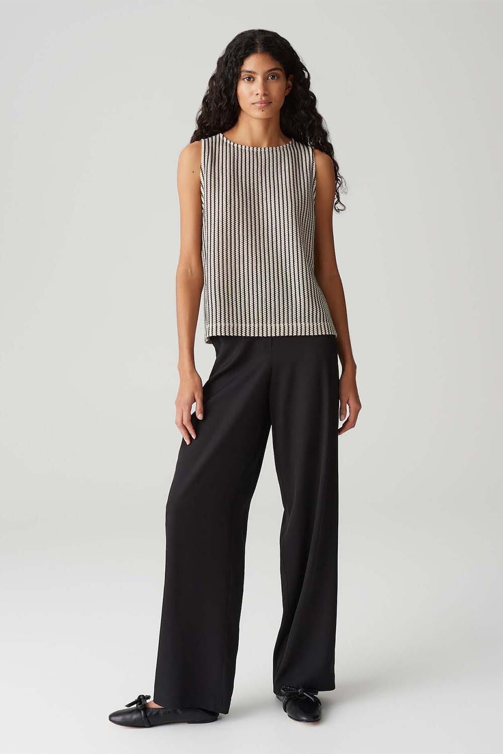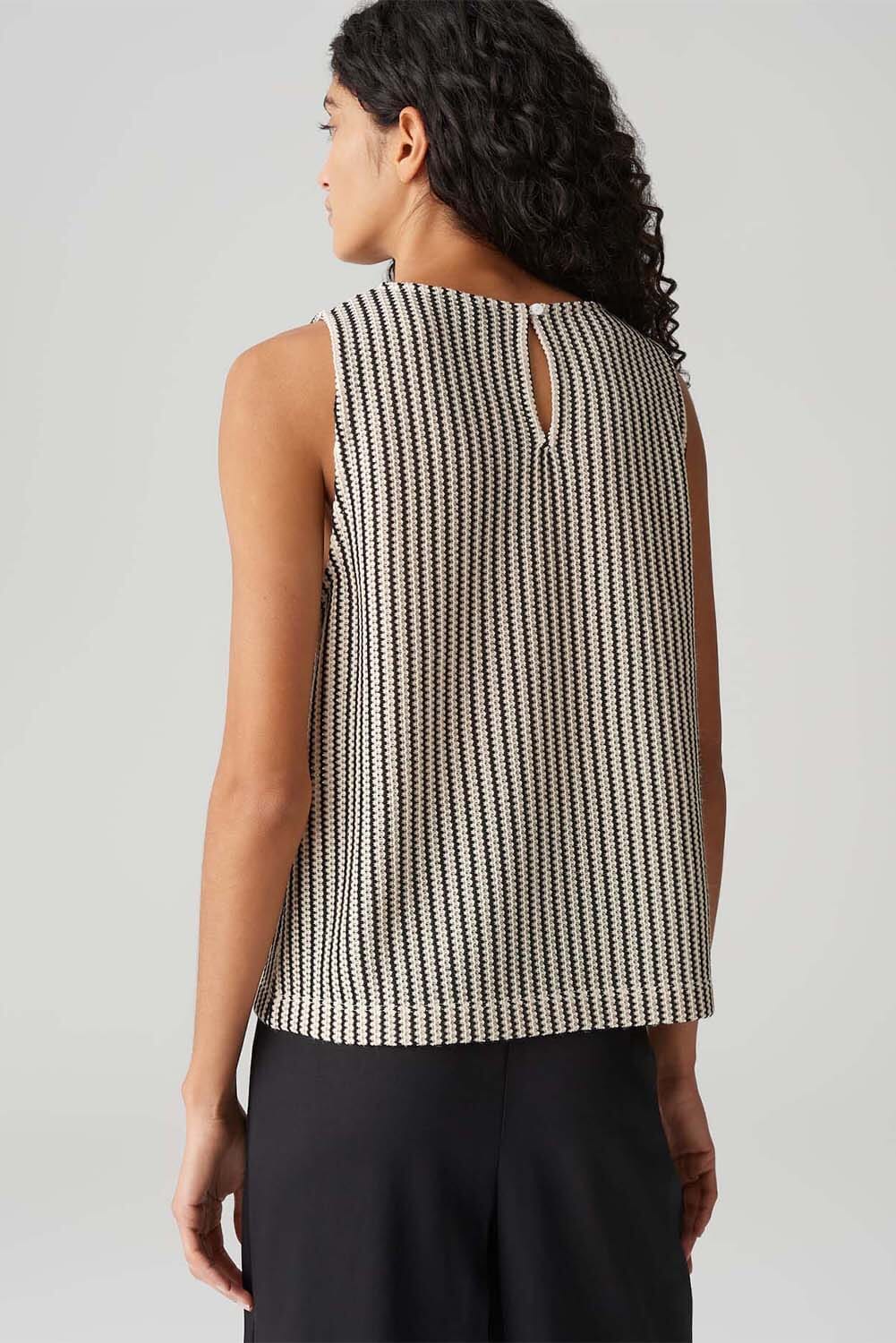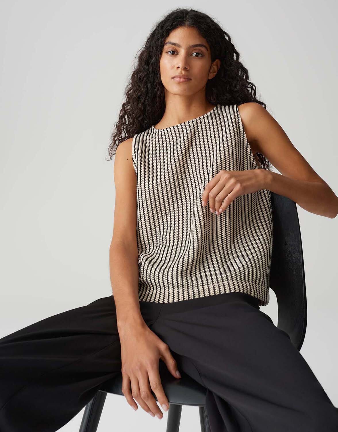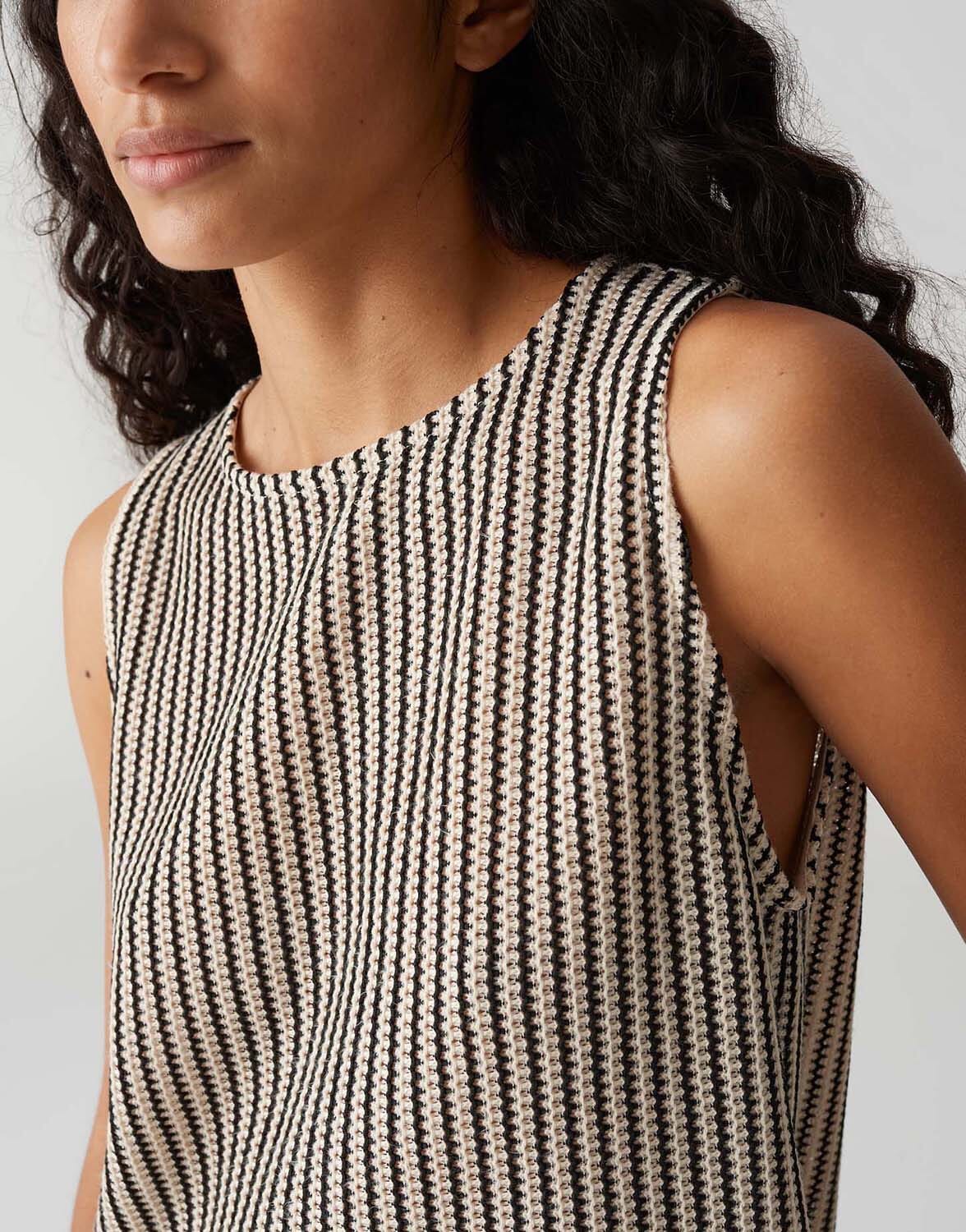 De top van Opus is een stijlvolle top met een minimalistisch streepontwerp. De ronde halslijn en mouwloze stijl maken het veelzijdig en comfortabel. Perfect voor een modieuze, toch eenvoudige uitstraling, ideaal te combineren met diverse kledingstukken voor elke gelegenheid.