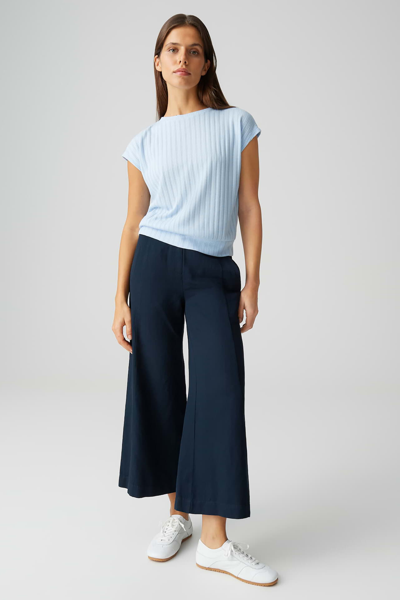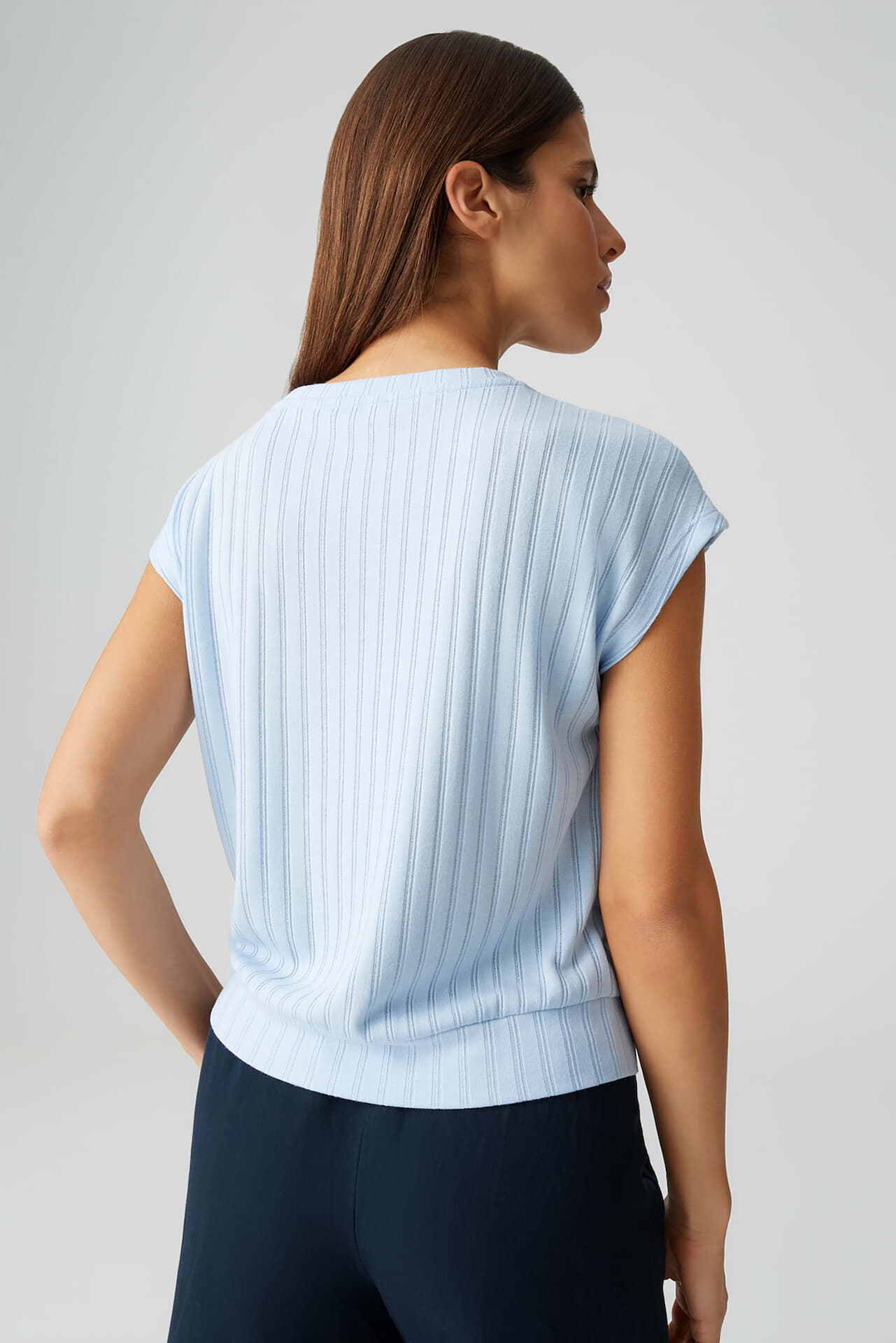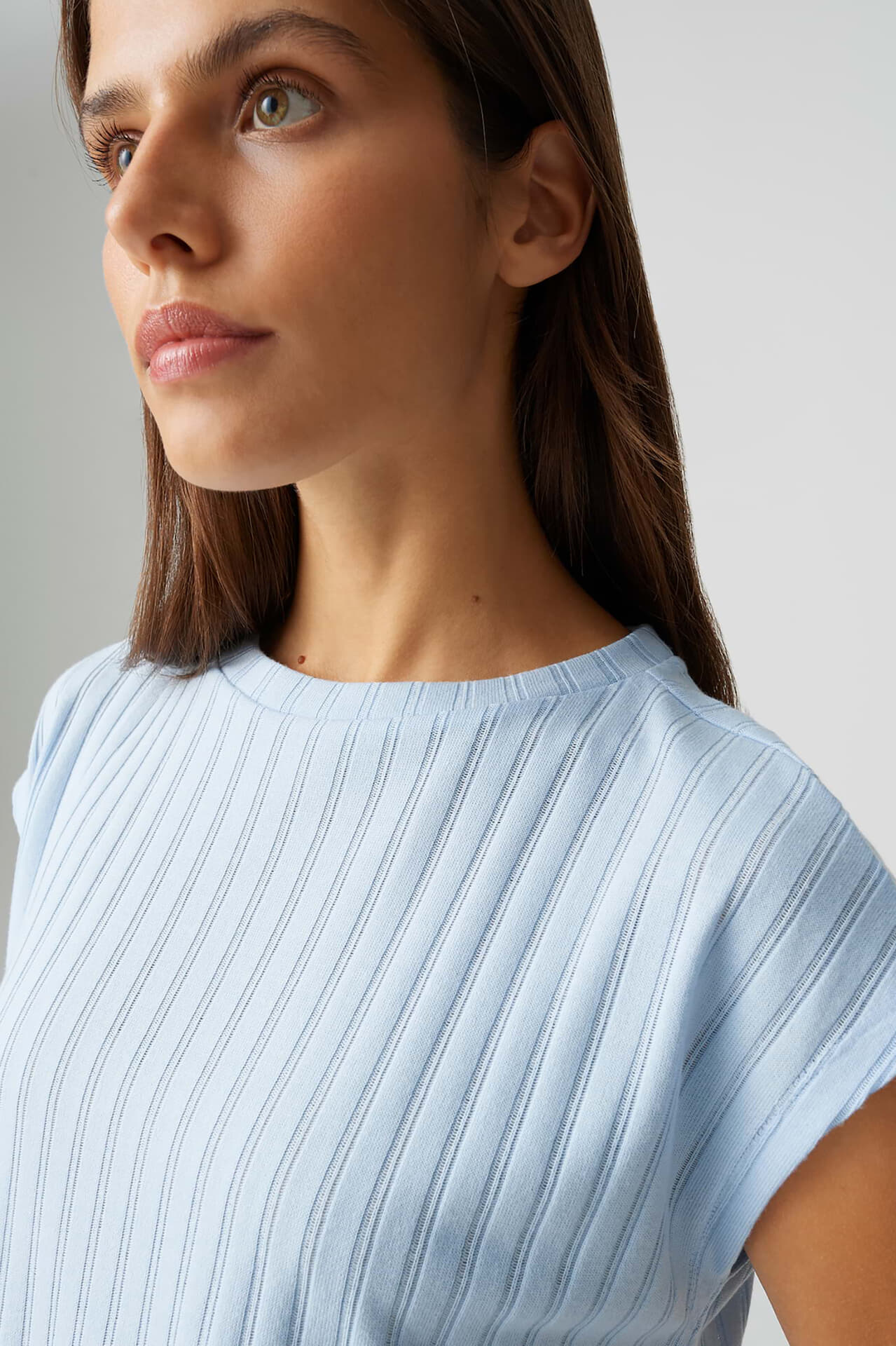 Het delicate samenspel van strepen wordt gekenmerkt door de licht open textuur en creëert zachte doorkijkjes die de Sapino top een luchtige lichtheid geven. Gecombineerd met wijde culottes of een vloeiende Marlene-broek creëert het een moderne city-look die transparantie en silhouet stijlvol in balans brengt.
