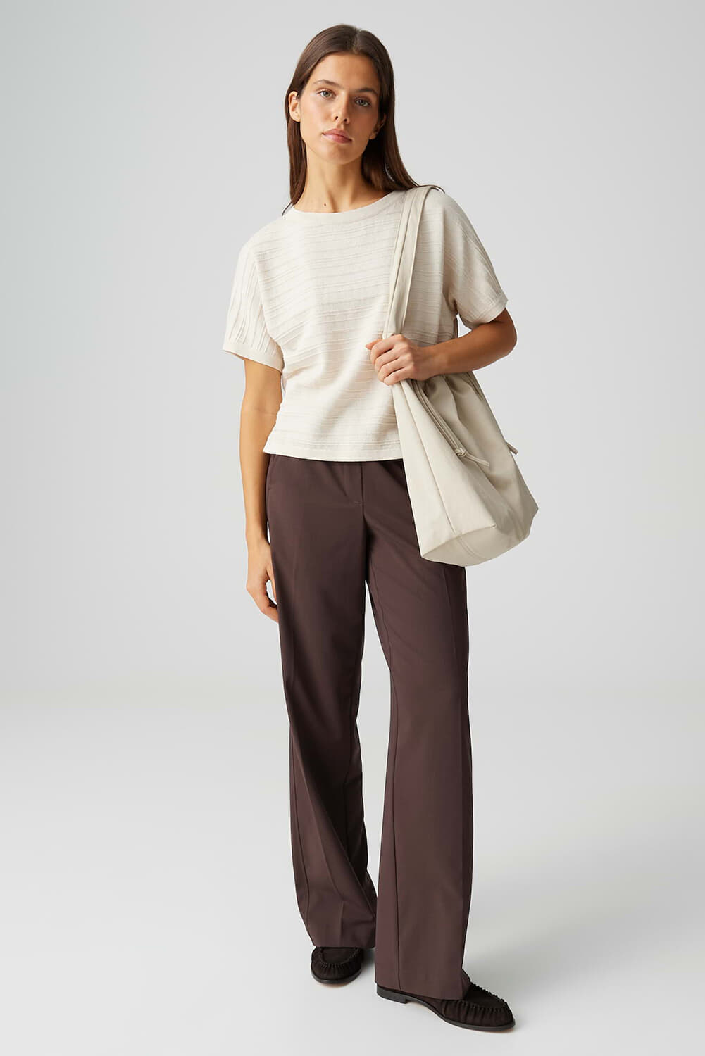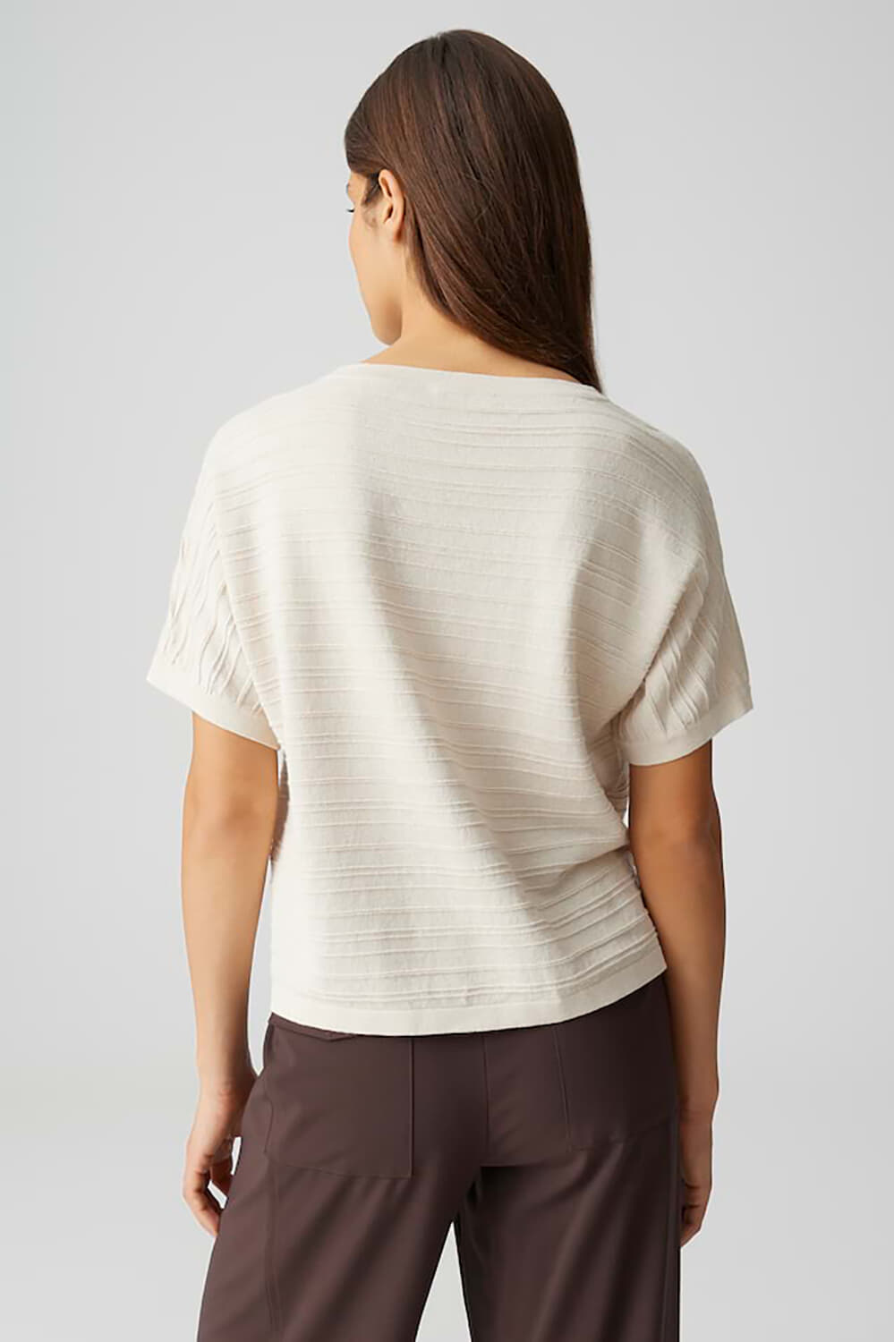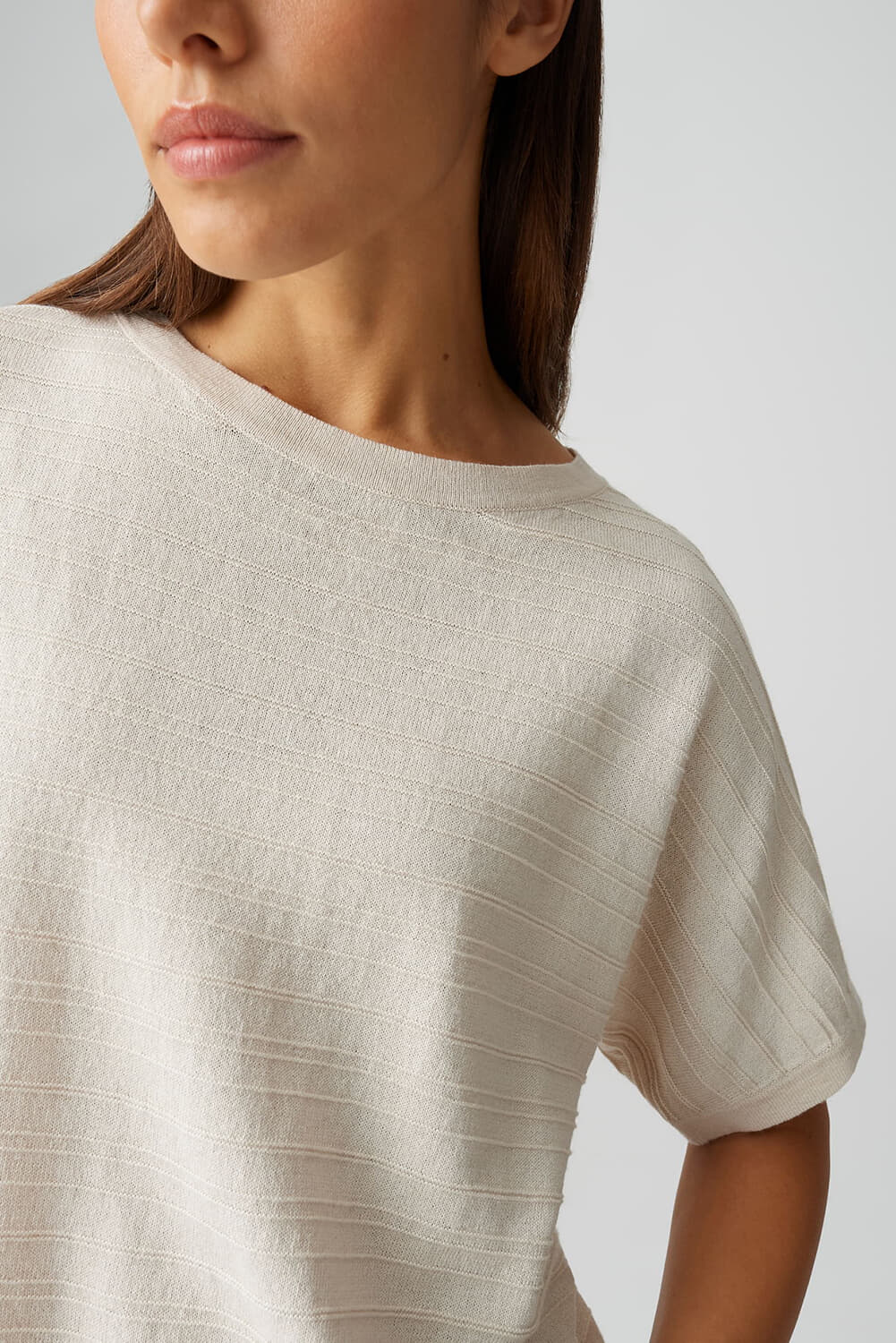 Trui Parzi van Opus heeft een minimalistische, casual uitstraling met ronde hals, korte mouwen en boxy fit. De effen stof toont subtiele, horizontale structuurlijnen en een rechte, licht cropped zoom. Draagt comfortabel en combineert makkelijk met een pantalon of denim voor een rustige, tijdloze set.
