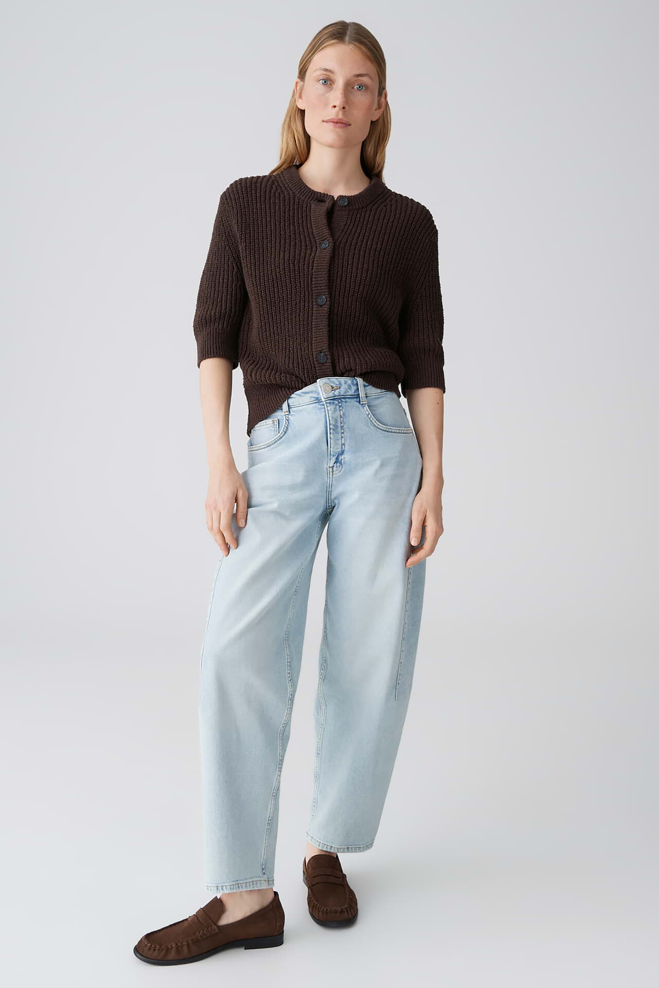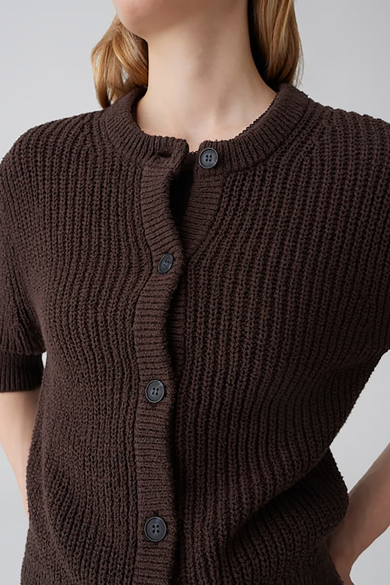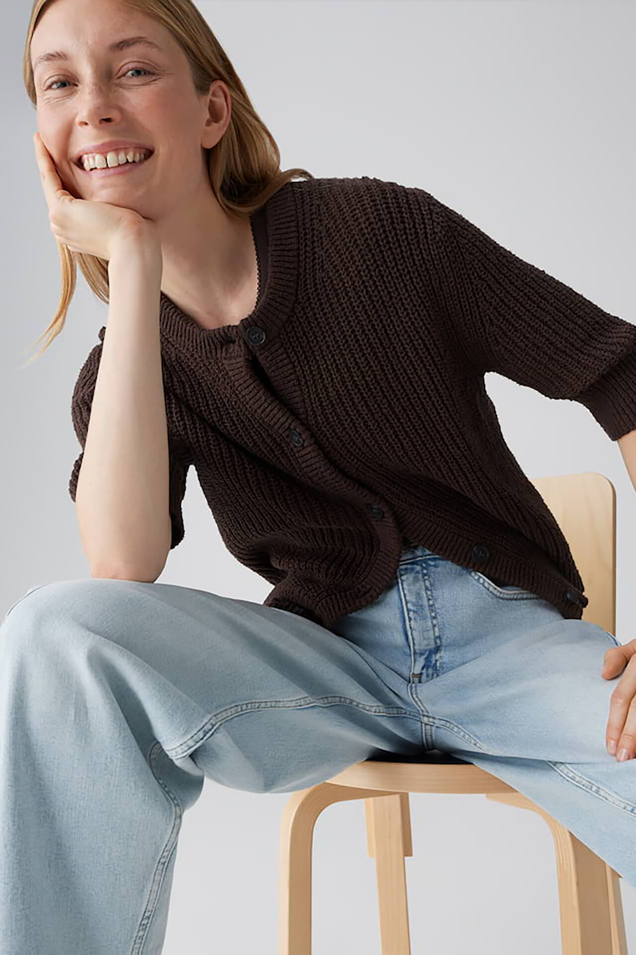 Vest donousa van Opus is een casual, minimalistische vest met ronde hals, knoopsluiting en regular pasvorm. De effen, grofgebreide structuur geeft een stevig gevoel, met ribboorden aan hals, mouwen en zoom. De 3/4 mouwen vallen comfortabel. Draag open over een top of gesloten bij een pantalon.