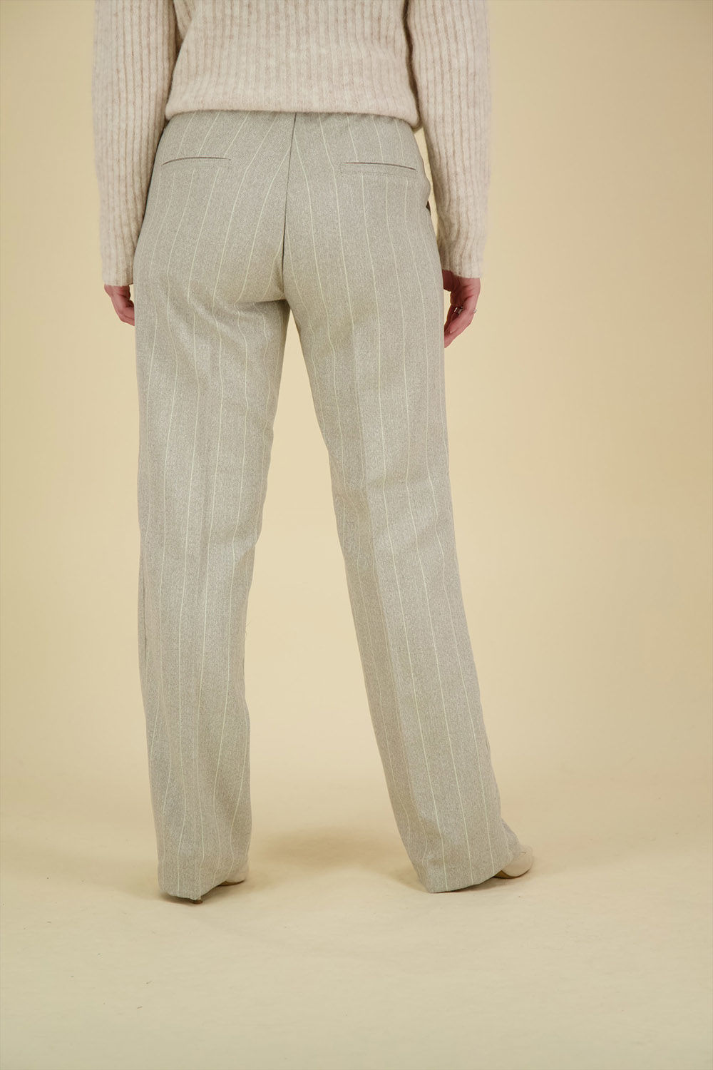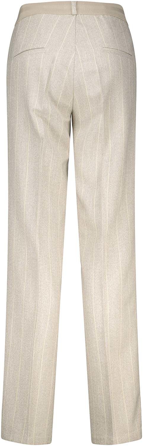 Hannah is een broek met een hoge elastische taille en een rechte wijde pijp. Deze broek zit wijd bij de bovenbenen en loopt recht naar beneden. Het is een broek die zowel een sportieve als een classy uistraling heeft. Met hakken maak je hem chic, met sneakers wordt hij meer casual. Deze Hannah is gemaakt van een mooie soepele stof met lurex wat de broek een luxe en glinsterende uitstraling geeft. Het streepdesign geeft deze broek een classy look.