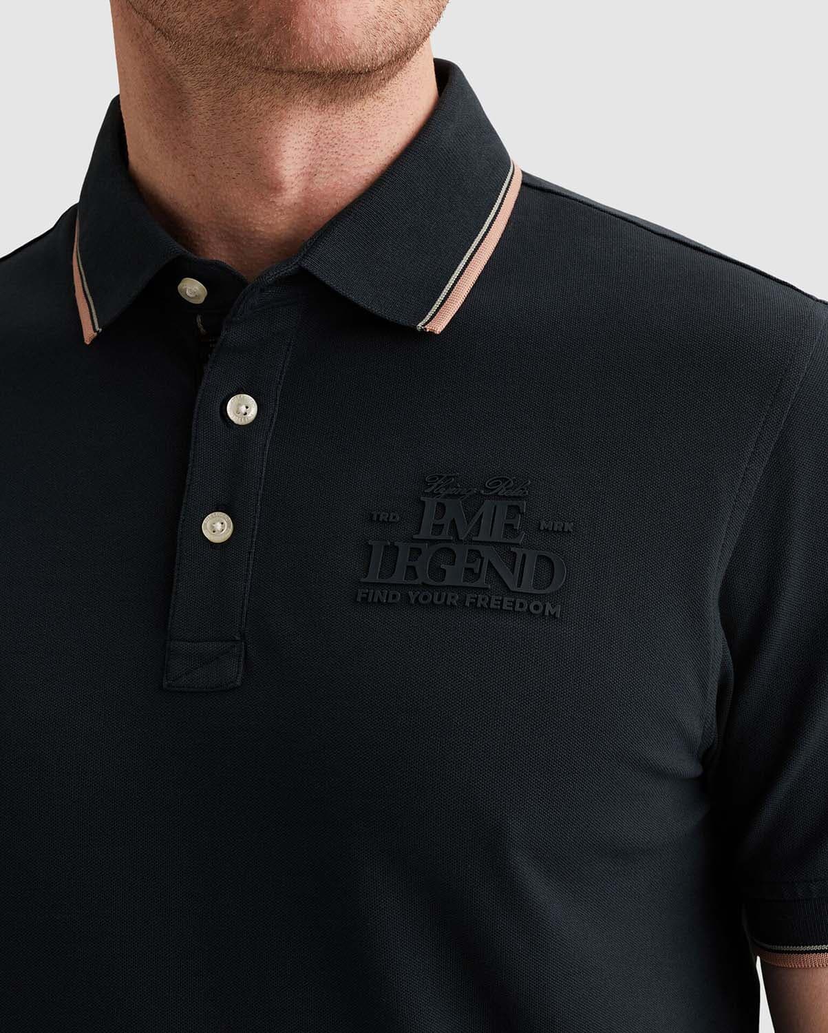 Polo van Pme Legend met polokraag, knoopsluiting en korte mouwen. De regular pasvorm draagt prettig en beweegt makkelijk. Effen uitvoering met subtiel logo op de borst en contrasterende bies langs kraag en mouwboord. Combineer met een chino of jeans voor casual, sporty stijl.