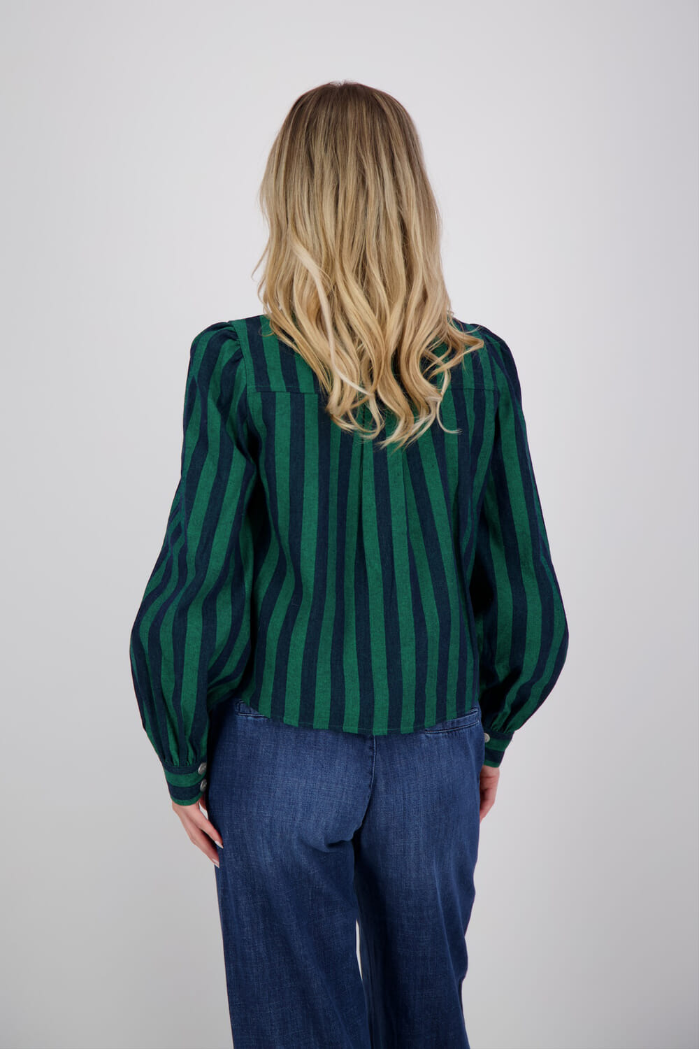De Blouse Striped van Pom Amsterdam is een elegante dames blouse met lange mouwen, ontworpen voor een stijlvolle uitstraling. Deze blouse heeft een speels streeppatroon in rijke tinten groen en blauw, afgewerkt met een subtiele strik bij de kraag voor een verfijnde touch.