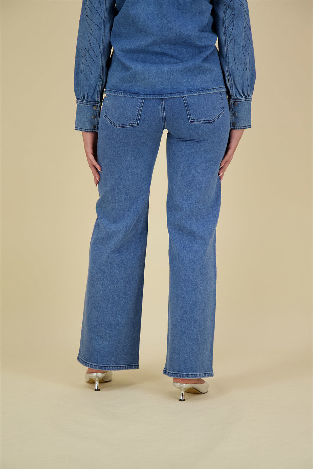 De Jeans Wide Leg Denim Rhinestones van Pom Amsterdam combineert casual stijl met een moderne uitstraling. Deze jeans heeft een comfortabele pasvorm, is voorzien van subtiele rhinestones en is ideaal voor een stijlvolle, alledaagse look.