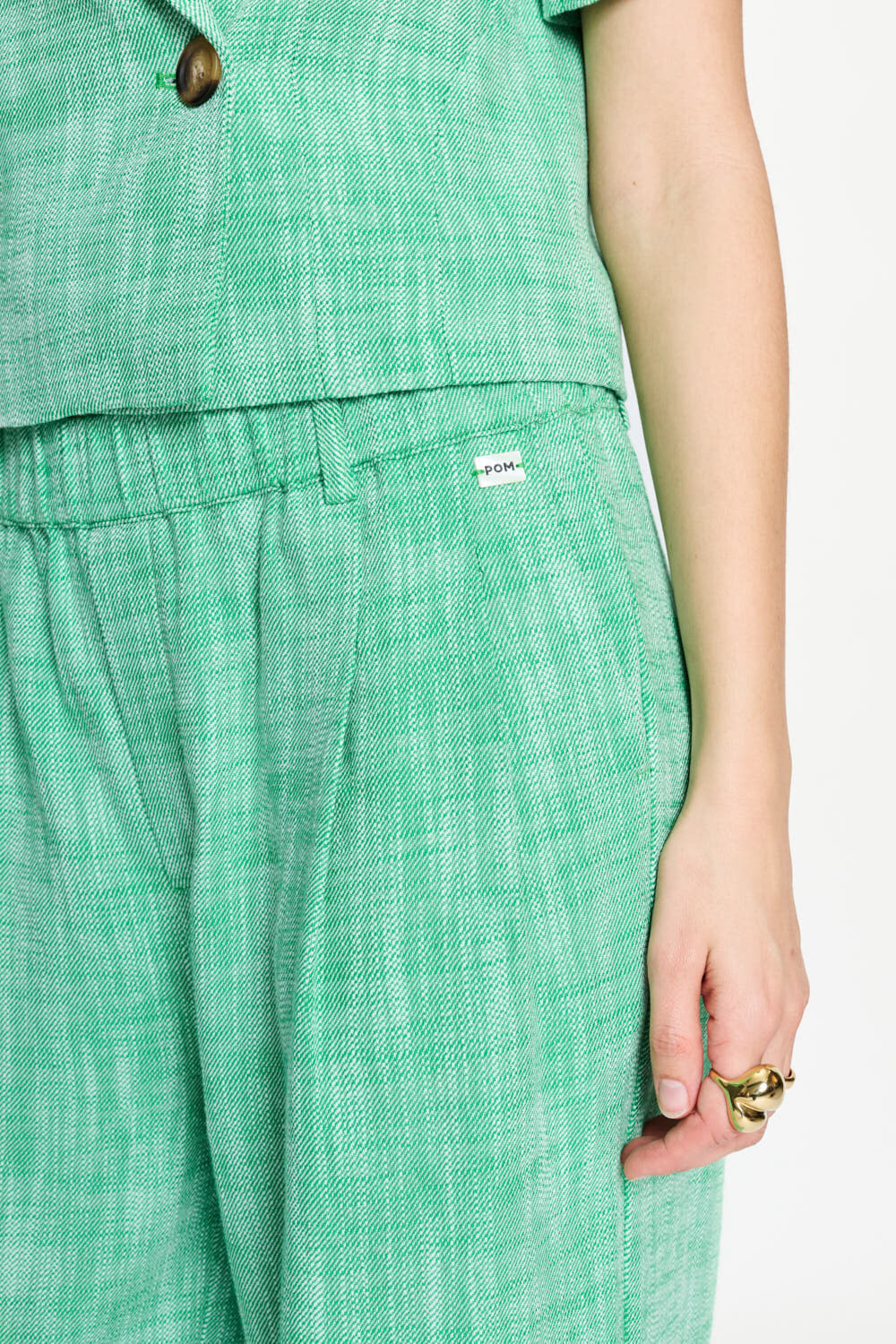 De Pantalon Palm van Pom Amsterdam combineert stijl en comfort met een wijde pijp en een normale taille. Deze effen pantalon biedt een verfijnde en comfortabele pasvorm, ideaal voor een modieuze uitstraling bij diverse gelegenheden.