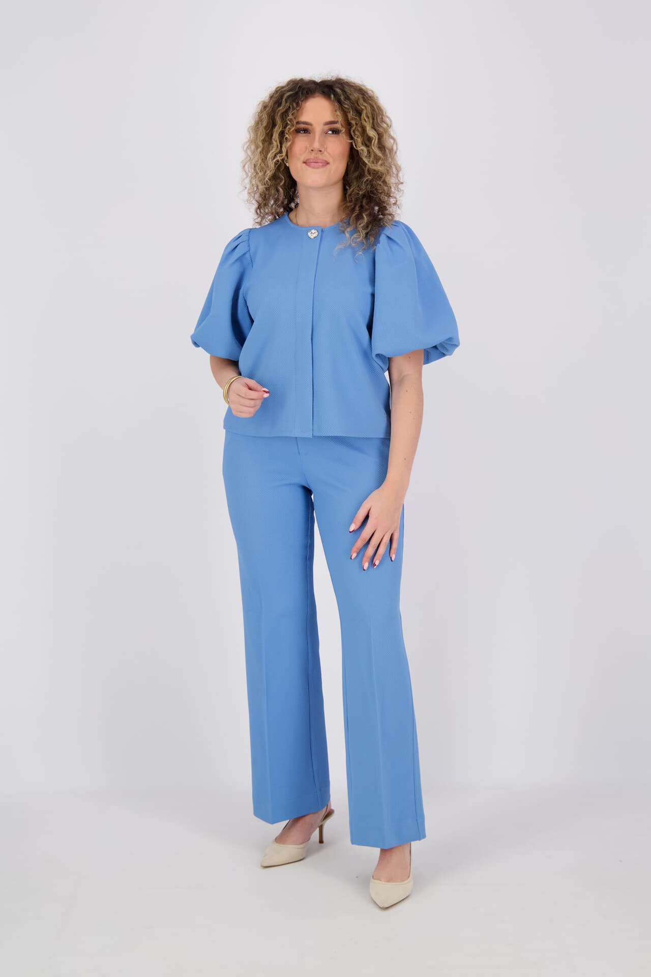 Top van Pom Amsterdam, een dames top lange mouw met een verfijnde stijl. De ronde hals en opstaande kraag worden geaccentueerd door een knoopsluiting, terwijl de lange mouwen zorgen voor een elegante uitstraling. Perfect voor een nette gelegenheid.