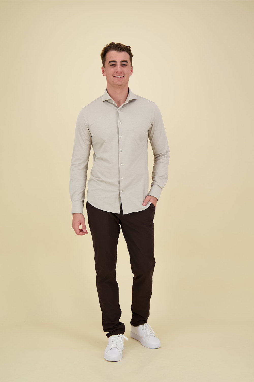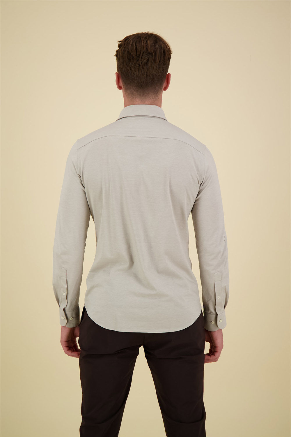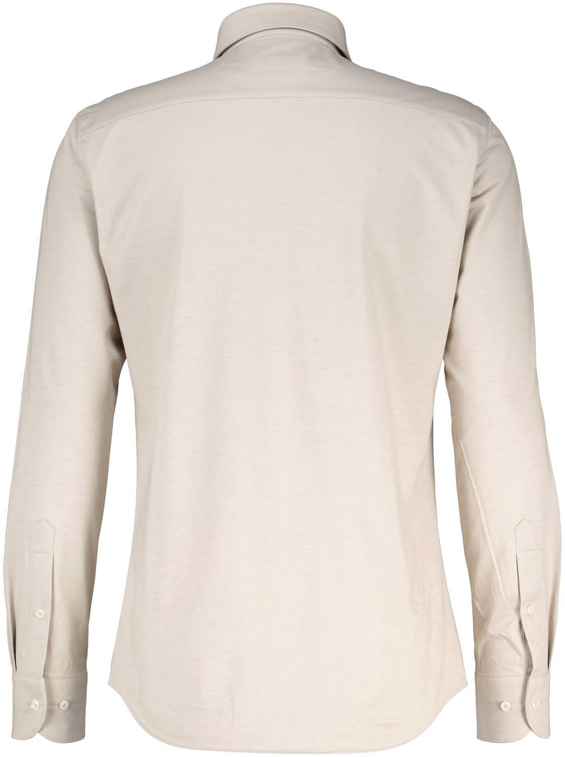 Dit beige Japanese knitted overhemd is gemaakt van een mix van katoen en hightech garen. Het gebreide overhemd combineert de elegantie van een overhemd met het comfort van een t-shirt. Een geweldig overhemd dat zowel formeel als casual gedragen kan worden. Aangezien het een gebreid overhemd is, is strijken niet meer nodig en kun je het iets rustiger aan doen in de ochtend.