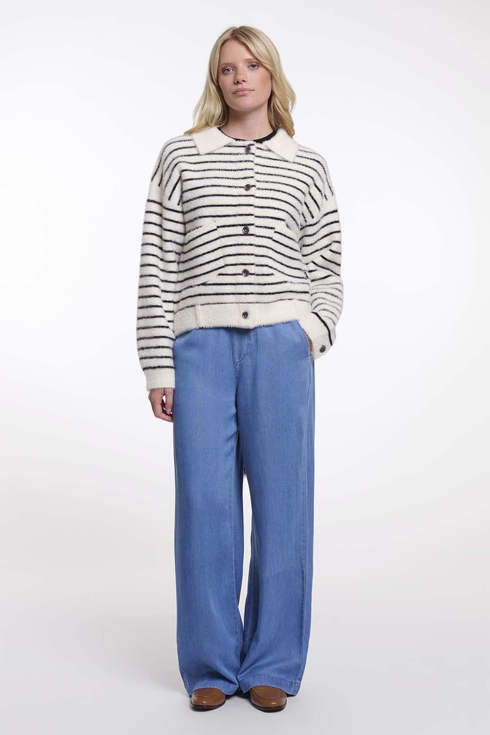 Vest Bubbly Boxy van Rino & Pelle is een casual dames vest met een boxy fit en een streeppatroon. Het heeft lange mouwen, een overhemdkraag, knopen als sluiting en praktische zakken aan de voorzijde, ideaal voor een ontspannen dagje uit.