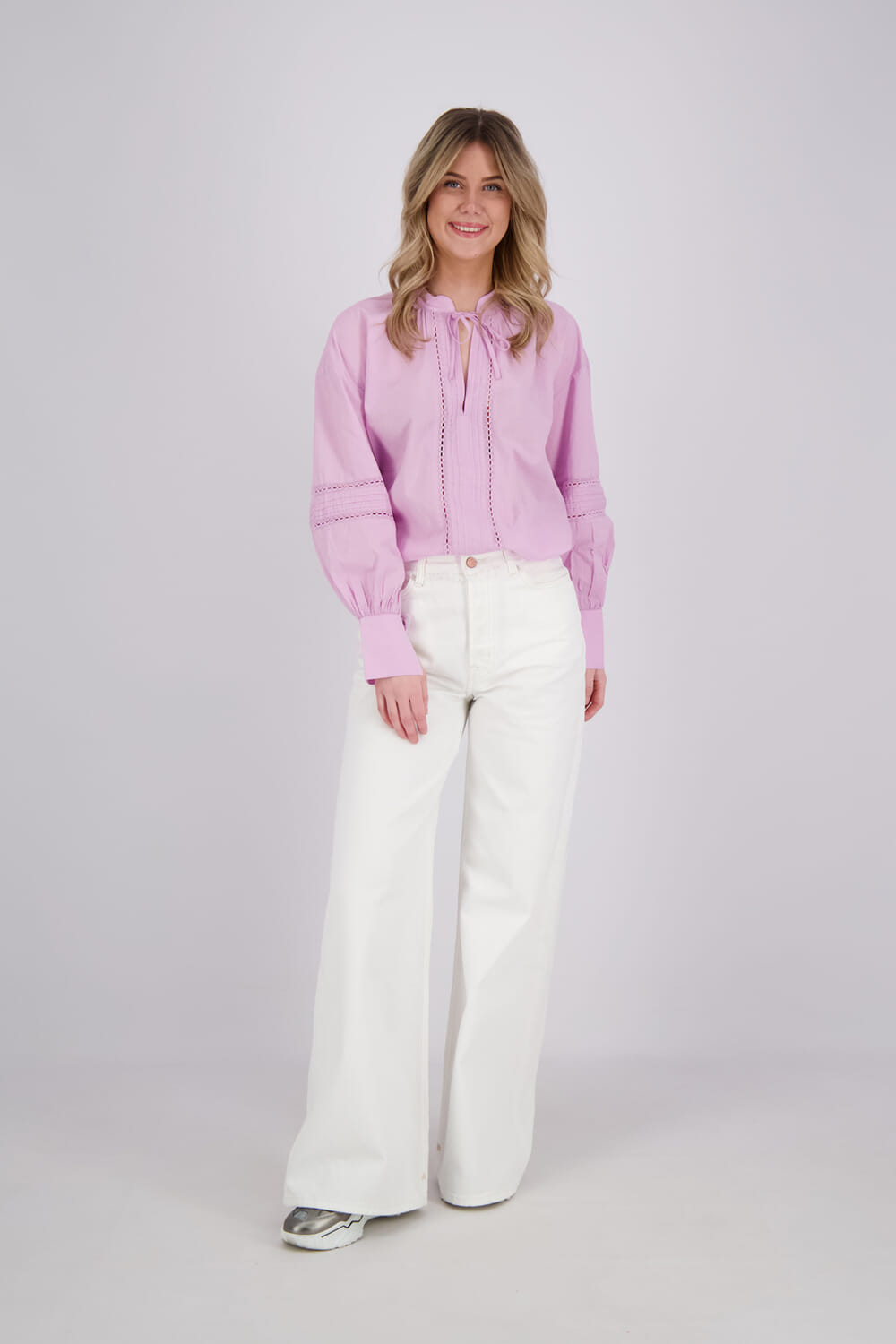 De Blouse Lace van Scotch & Soda is een elegante dames blouse lm met een losse pasvorm, ronde halslijn en lange mouwen. De mouwen zijn afgewerkt met knopen en een koordsluiting, terwijl het effen patroon zorgt voor een stijlvolle, vrouwelijke uitstraling.