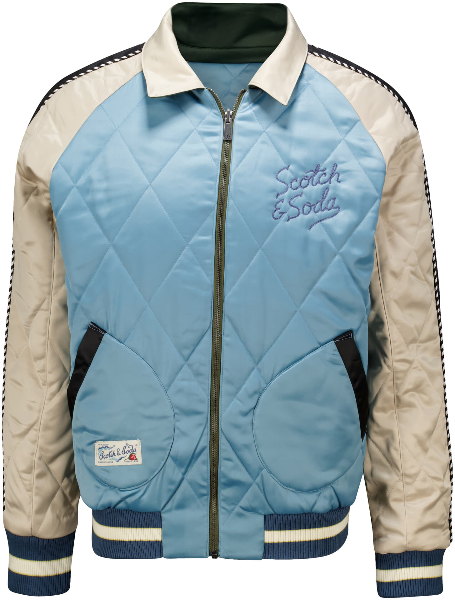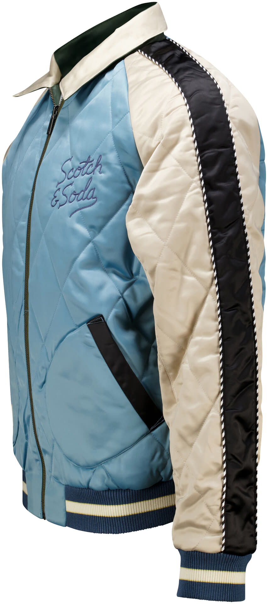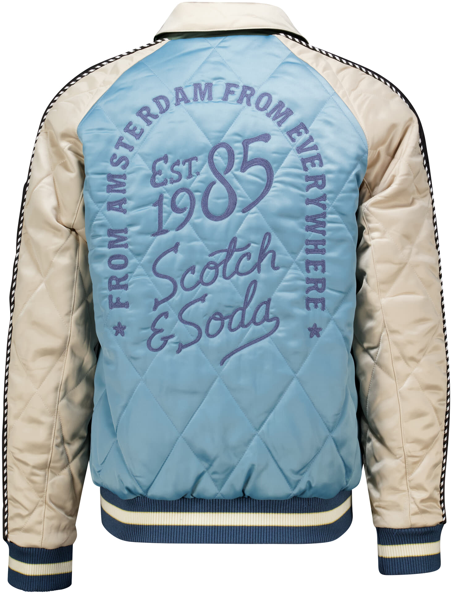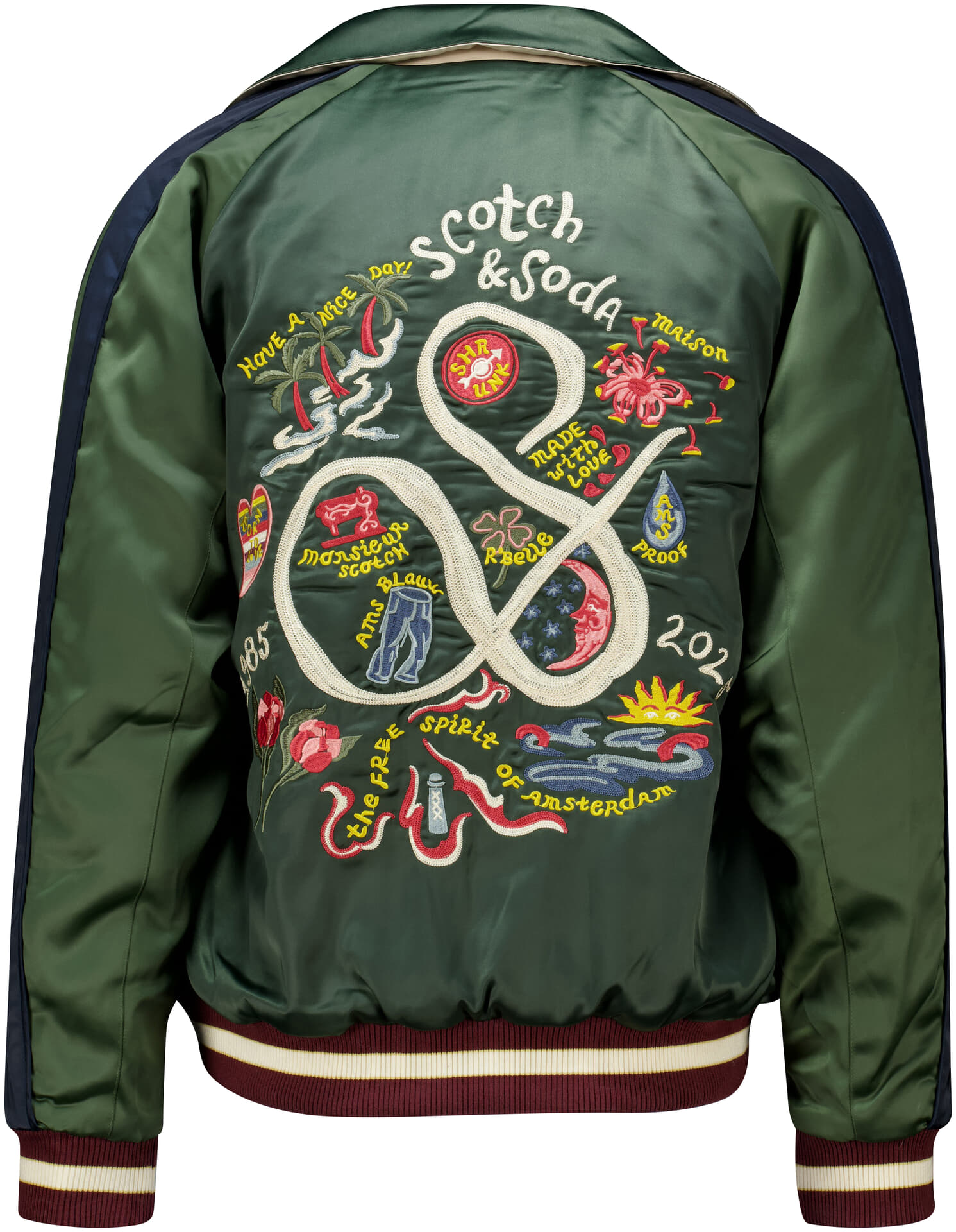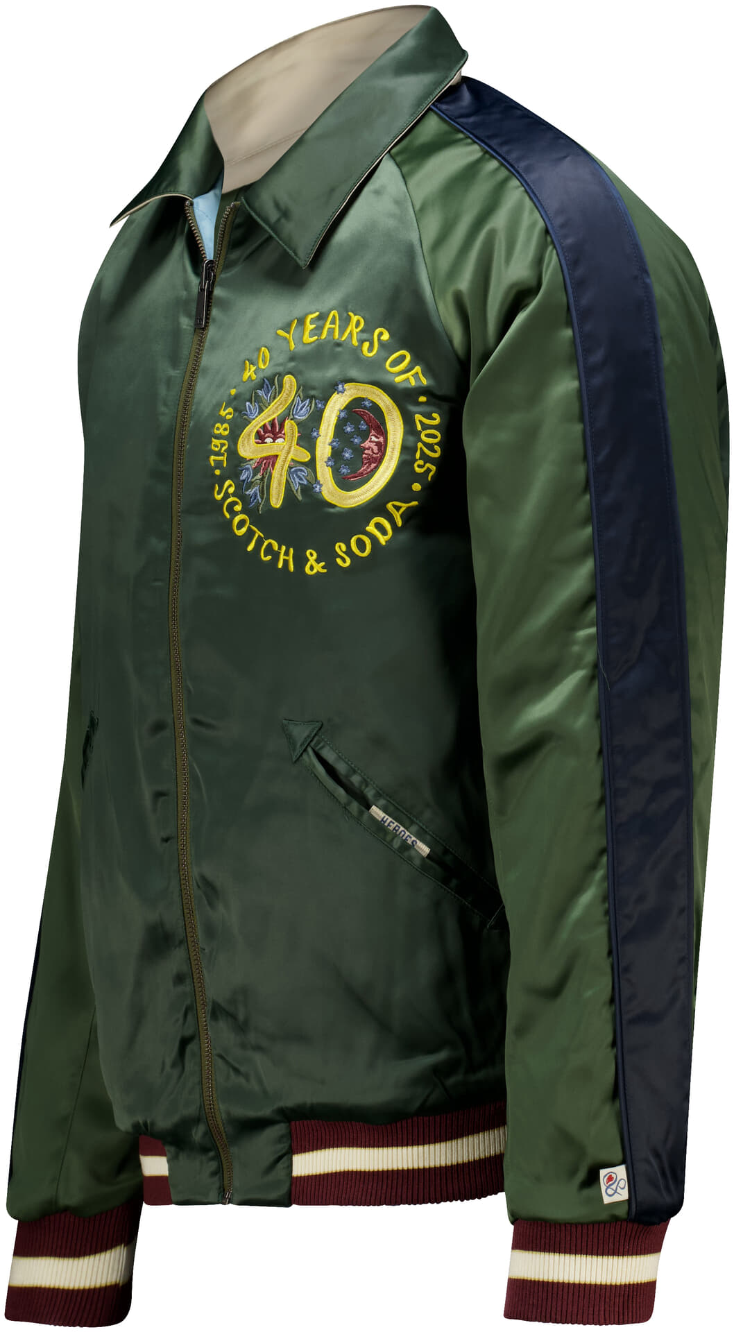 Bomberjack The 40th anniversary souvenir van Scotch & Soda biedt een sportieve stijl met een opstaande kraag en lange mouwen. Het logo-patroon en de contrasterende kleuren maken deze bomberjas een must-have in de categorie heren bomberjacket. Ideaal voor een modieuze, casual uitstraling.