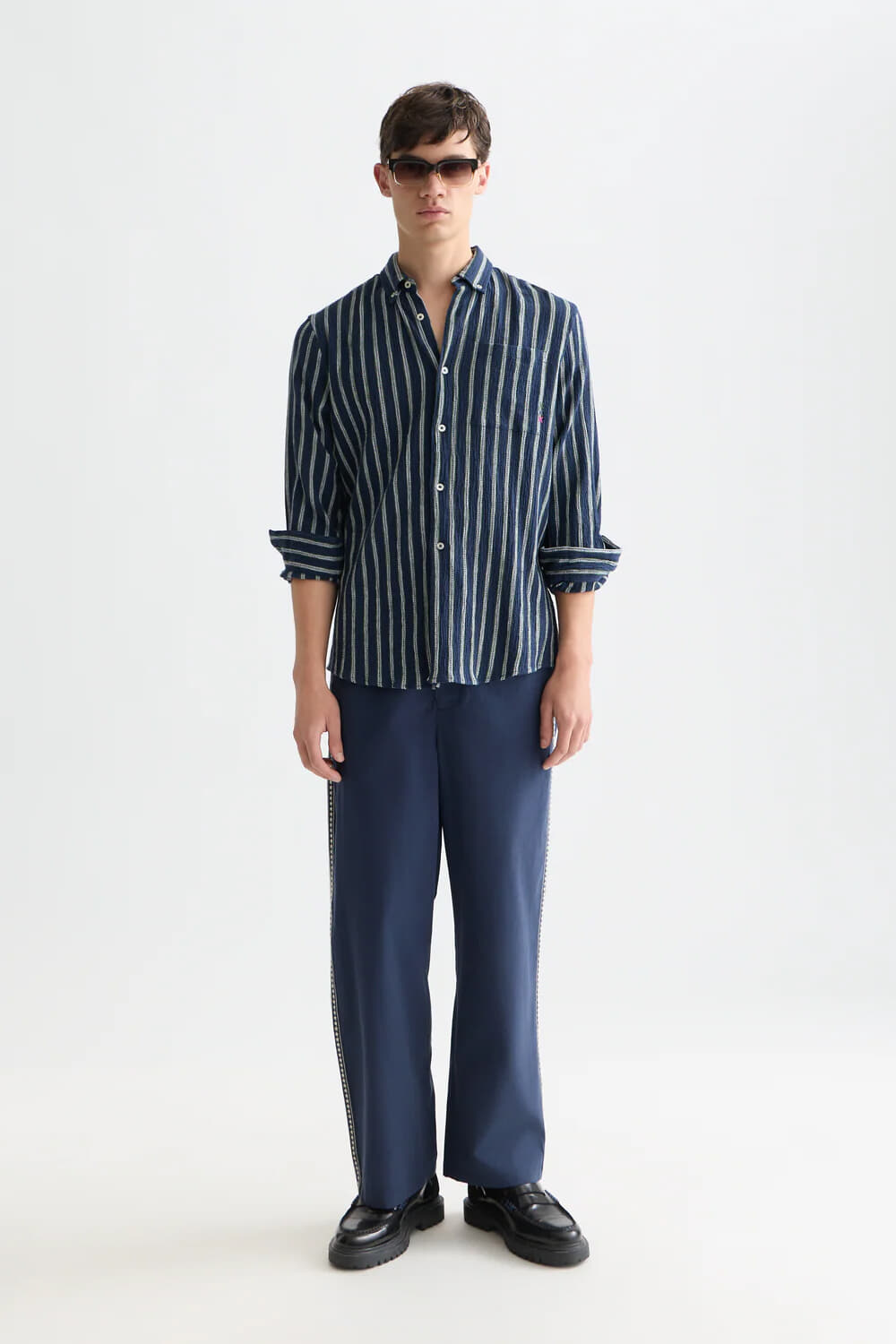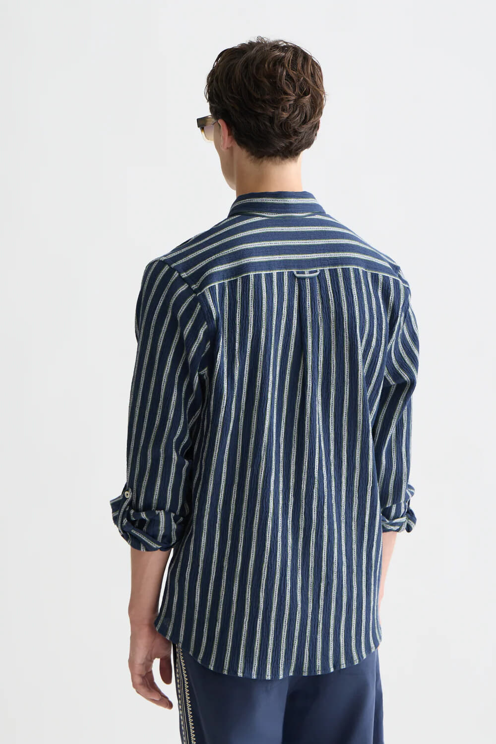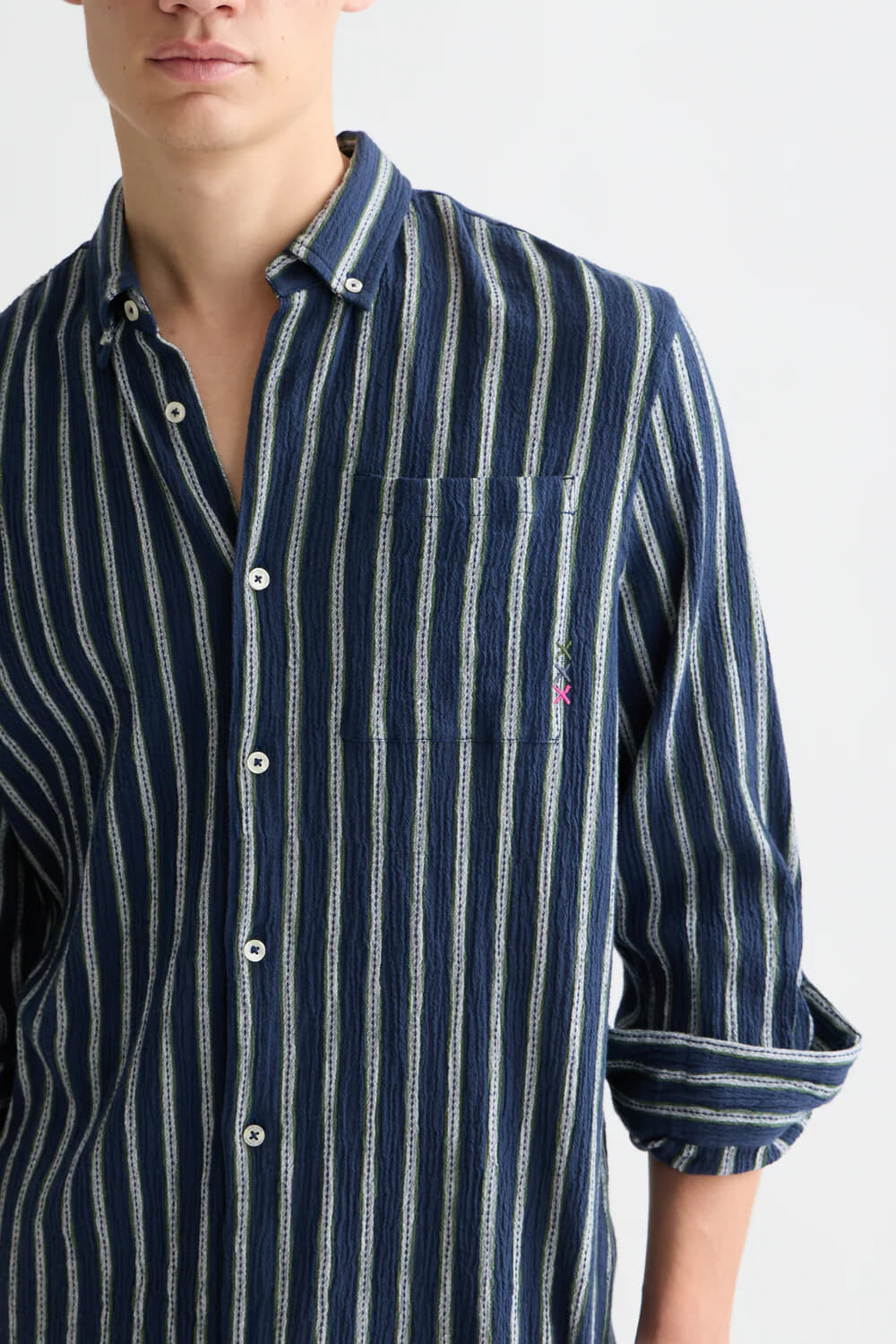 Het Overshirt Striped crinkle structure regular van Scotch & Soda is een stijlvol heren overshirt met een button down kraag, lange mouwen en strepen. Het heeft praktische zakken aan de voorzijde en een comfortabele sluiting met knopen, ideaal voor casual gelegenheden.