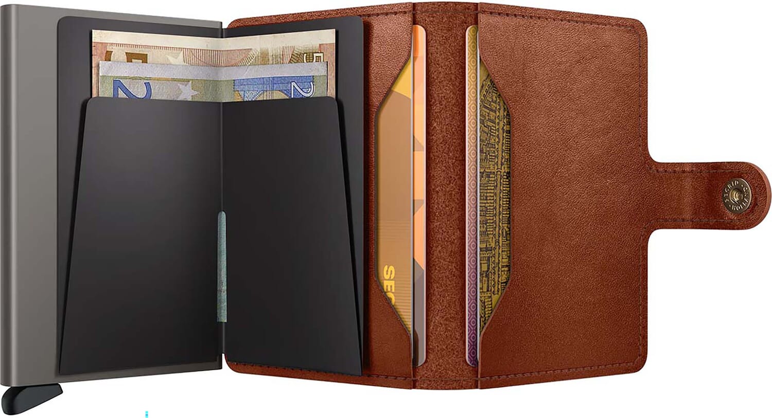 Miniwallet – Compact en verrassend ruim De Miniwallet biedt het beste van twee werelden: klein van formaat, maar met een indrukwekkende opbergruimte. Aan de buitenkant berg je eenvoudig bankbiljetten, bonnetjes en extra pasjes op. De aluminium Cardprotector maakt het mogelijk om met één simpele beweging je kaarten tevoorschijn te halen, terwijl ze beschermd zijn tegen buigen, breken en ongewenste draadloze communicatie. Capaciteit: Maximaal 4 pasjes met reliëf of 6 vlakke pasjes in de Cardprotector Tot 4 extra pasjes in de leren omslag Bankbiljetten Visitekaartjes Bonnetjes