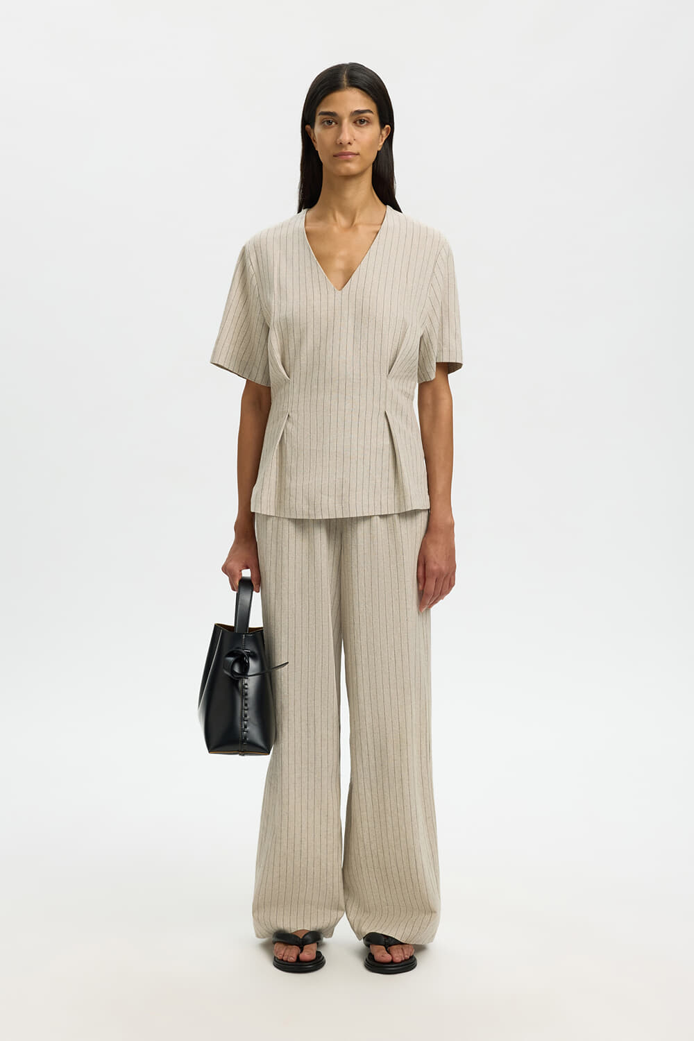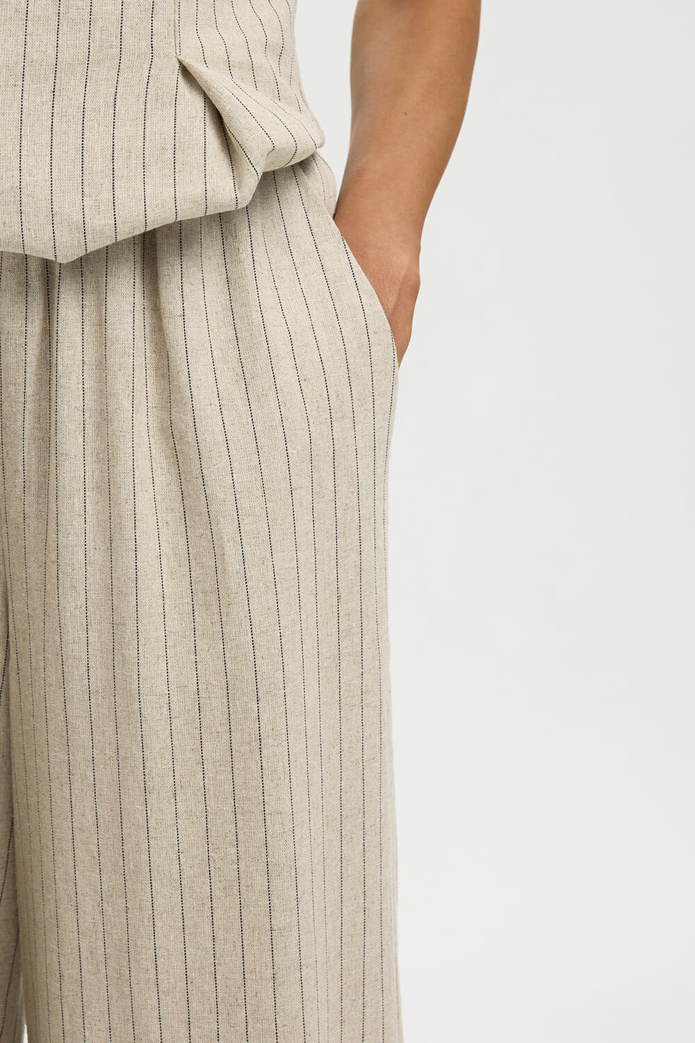 De Pantalon Mariam Wide Linnen Blend van Selected Femme is een dames lange broek met een minimalistisch design. Deze broek heeft een elastische taille en een losse pasvorm, voorzien van zijzakken en een elastische band. De streepjes geven een elegante touch.