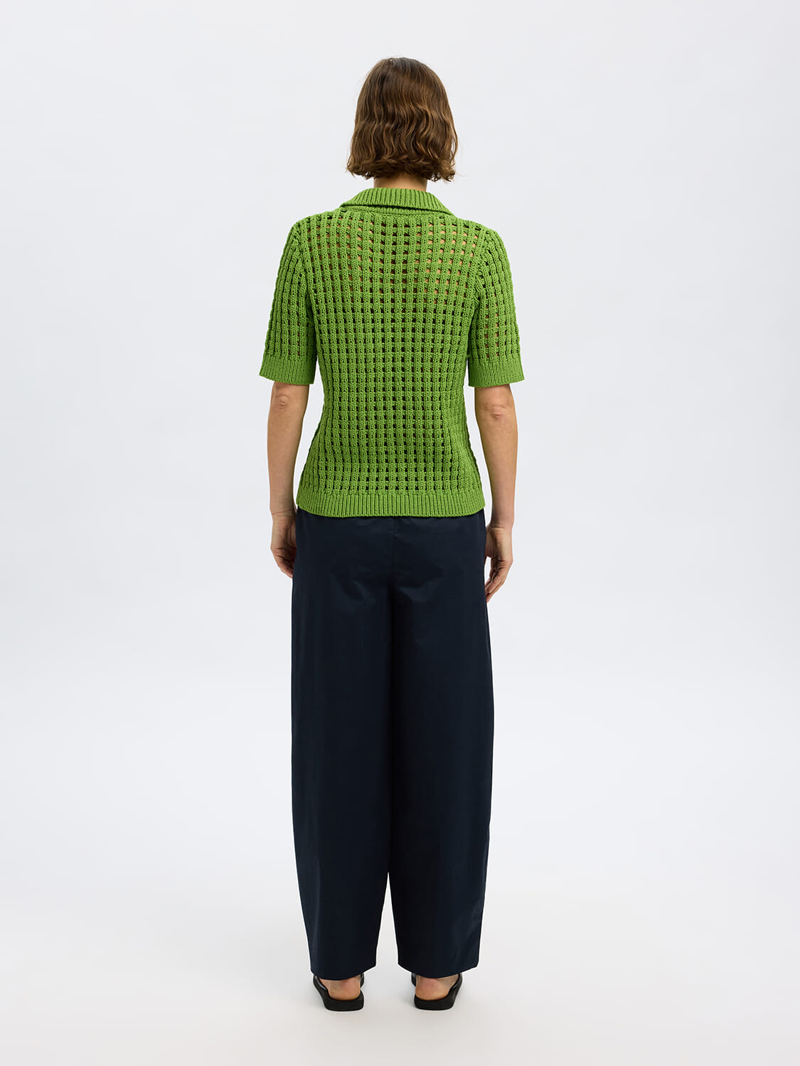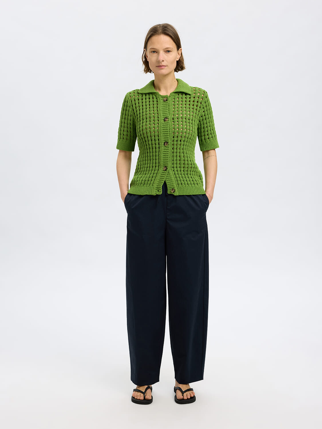 Vest Ellen van Selected Femme is een elegant dames vest, gemaakt van katoen met een gaatjespatroon. Het heeft een overhemd kraag, knoopsluiting, korte mouwen en een getailleerde pasvorm, ideaal voor casual gelegenheden.