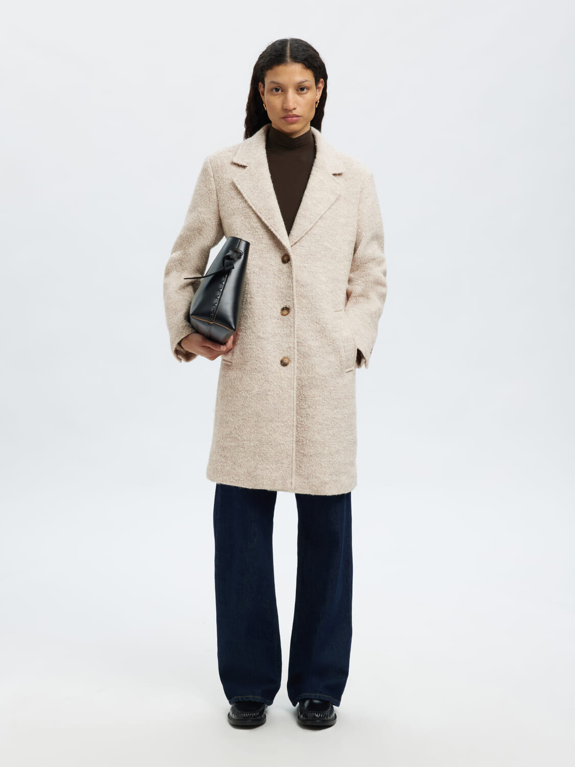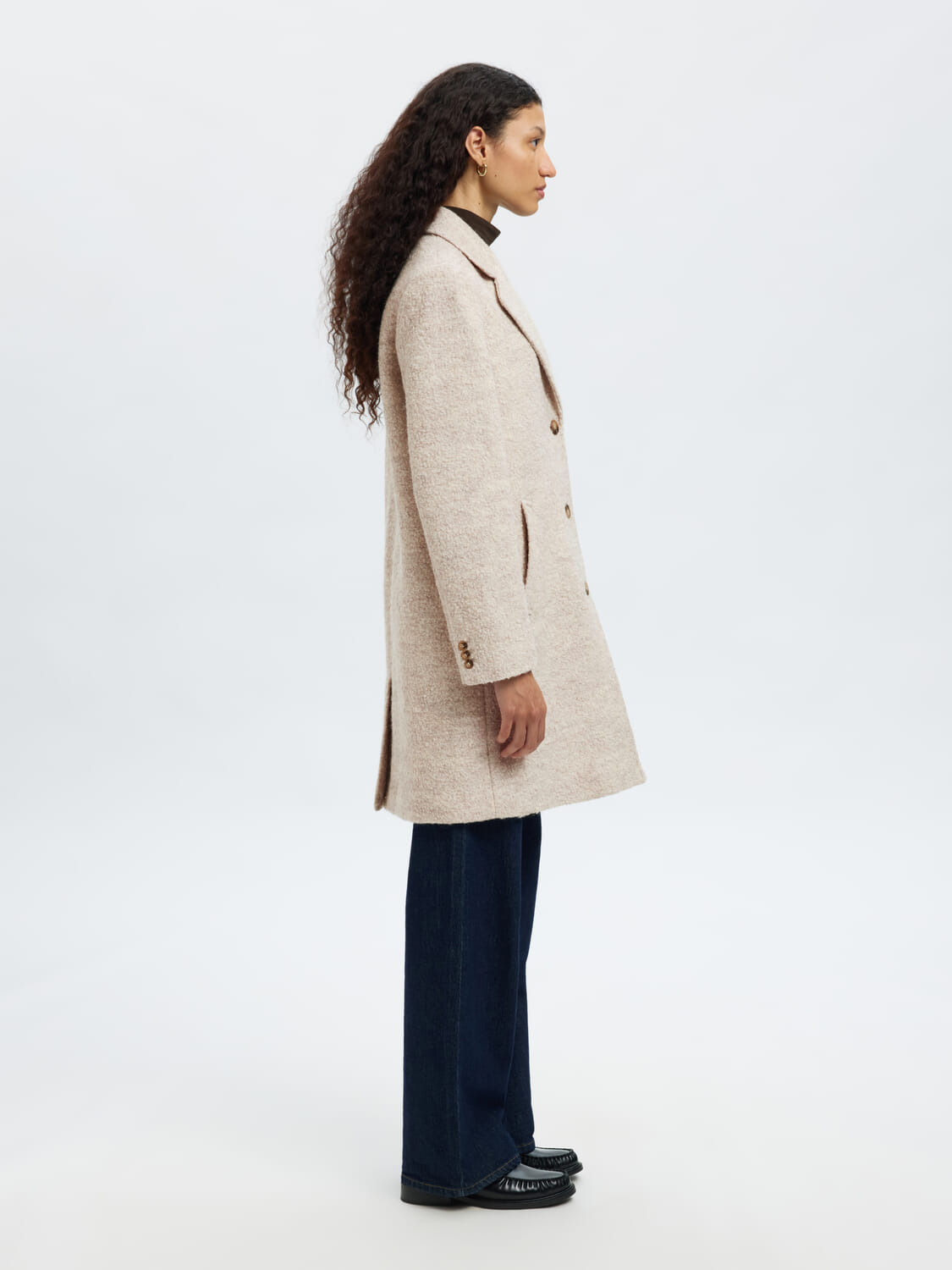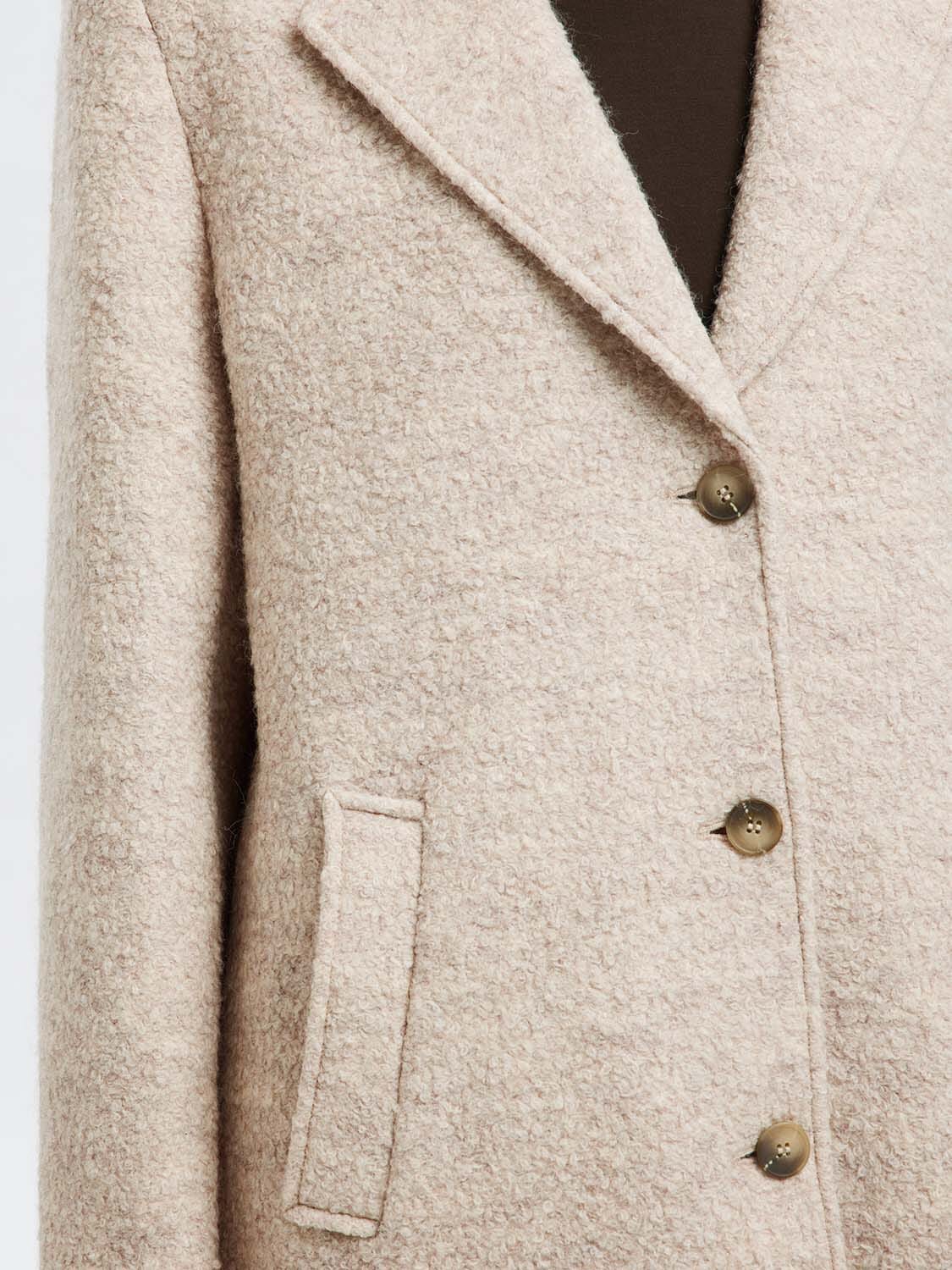 De Wollen Jas Sasia Boucle van Selected Femme is een stijlvolle tussenjas met een sophisticated uitstraling. De spreidkraag, manchetten met knopen, en omkeerbare halslijn geven deze minimalistische jas een elegante touch. Perfect voor nette gelegenheden met lange mouwen en knoopsluiting.