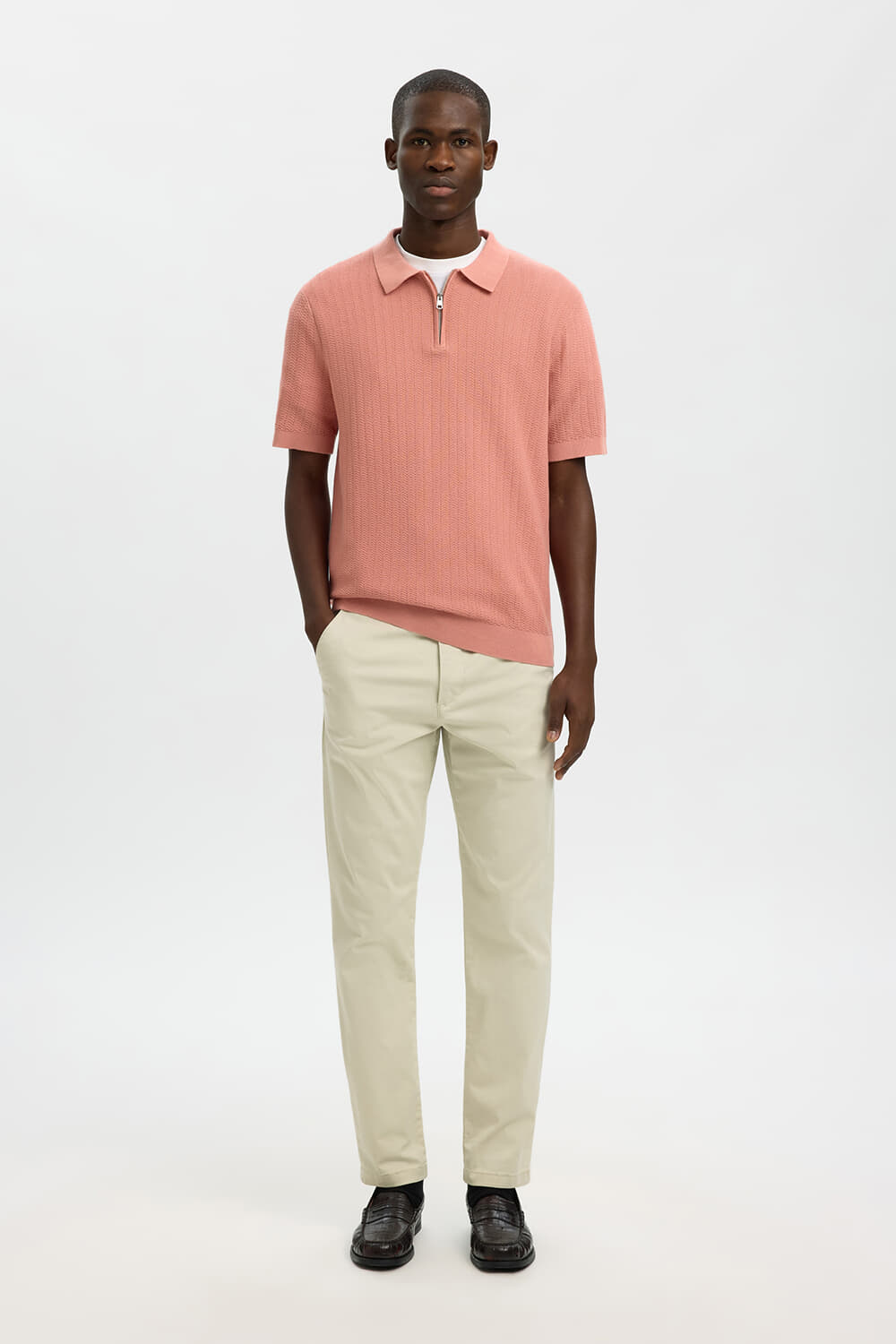 De Polo Cran Zip van Selected Homme is een stijlvolle herenpolo met een casual uitstraling. De opstaande kraag en polokraag met ritssluiting geven een moderne touch. Het effen patroon en de ribgebreide mouwboorden maken het geheel compleet.