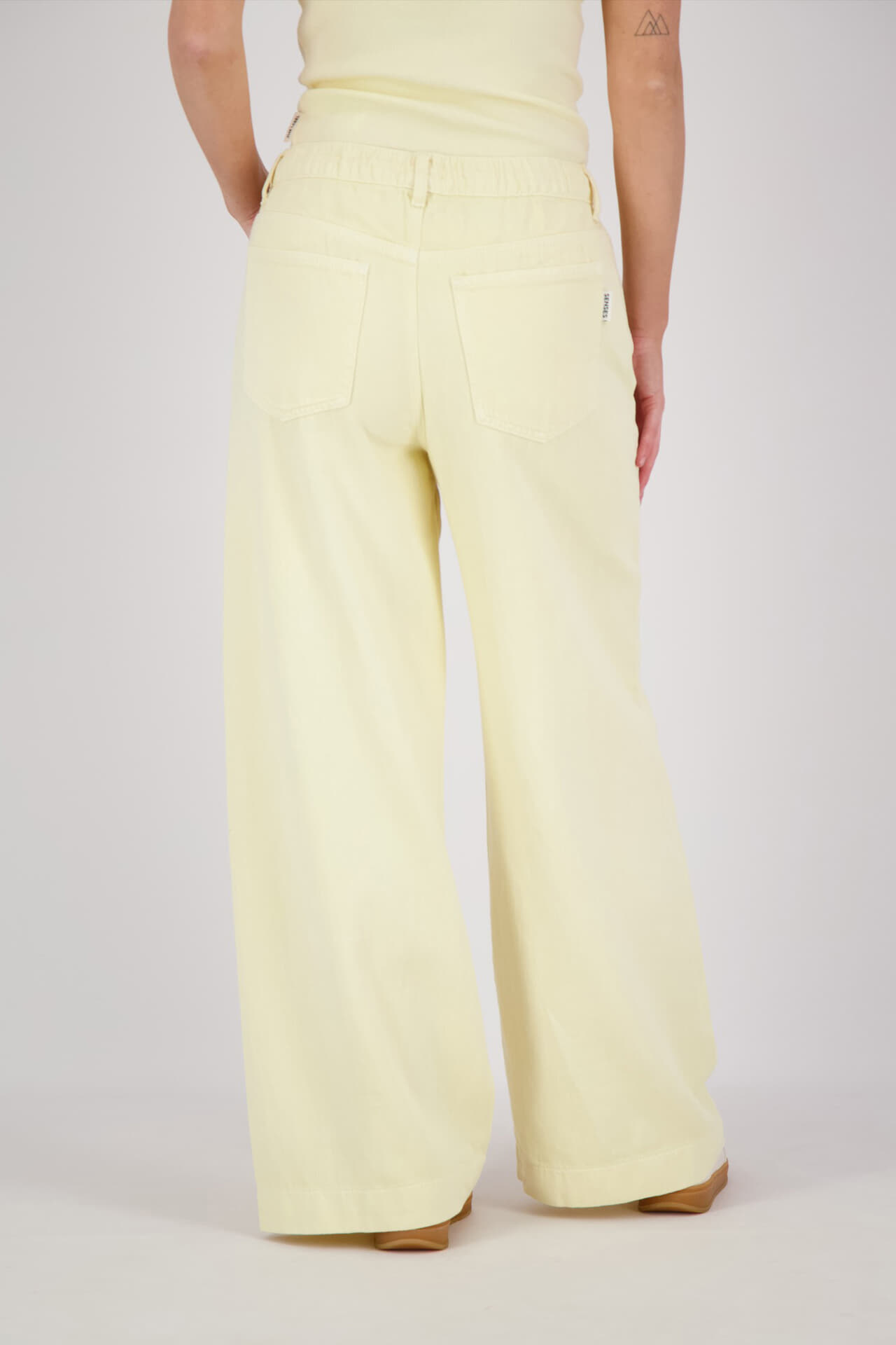 Jeans dames jeans van Senses The Label met wijde pijpen en effen, lichtgele tint. De elastische taille met koord zit comfortabel, terwijl voor- en achterzakken praktisch zijn. Casual model met rechte, soepele vallende broekspijpen en nette afwerking voor dagelijks dragen.