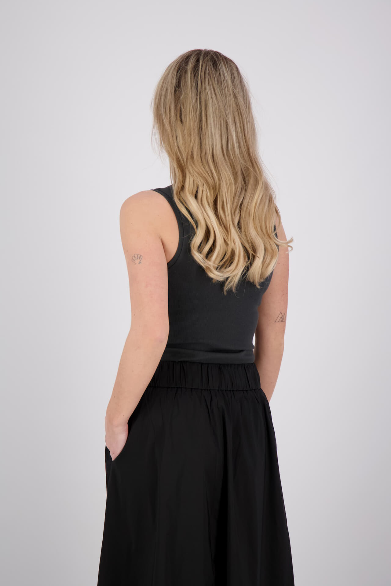 Top korte mouw van Senses The Label met U-hals en strakke pasvorm. Mouwloos model in casual, minimalistische stijl, uitgevoerd in een effen, donkergrijze ribstof met subtiel logodetail op de borst. Afgewerkt met een klein label bij de zoom, prettig voor alledaags gebruik.