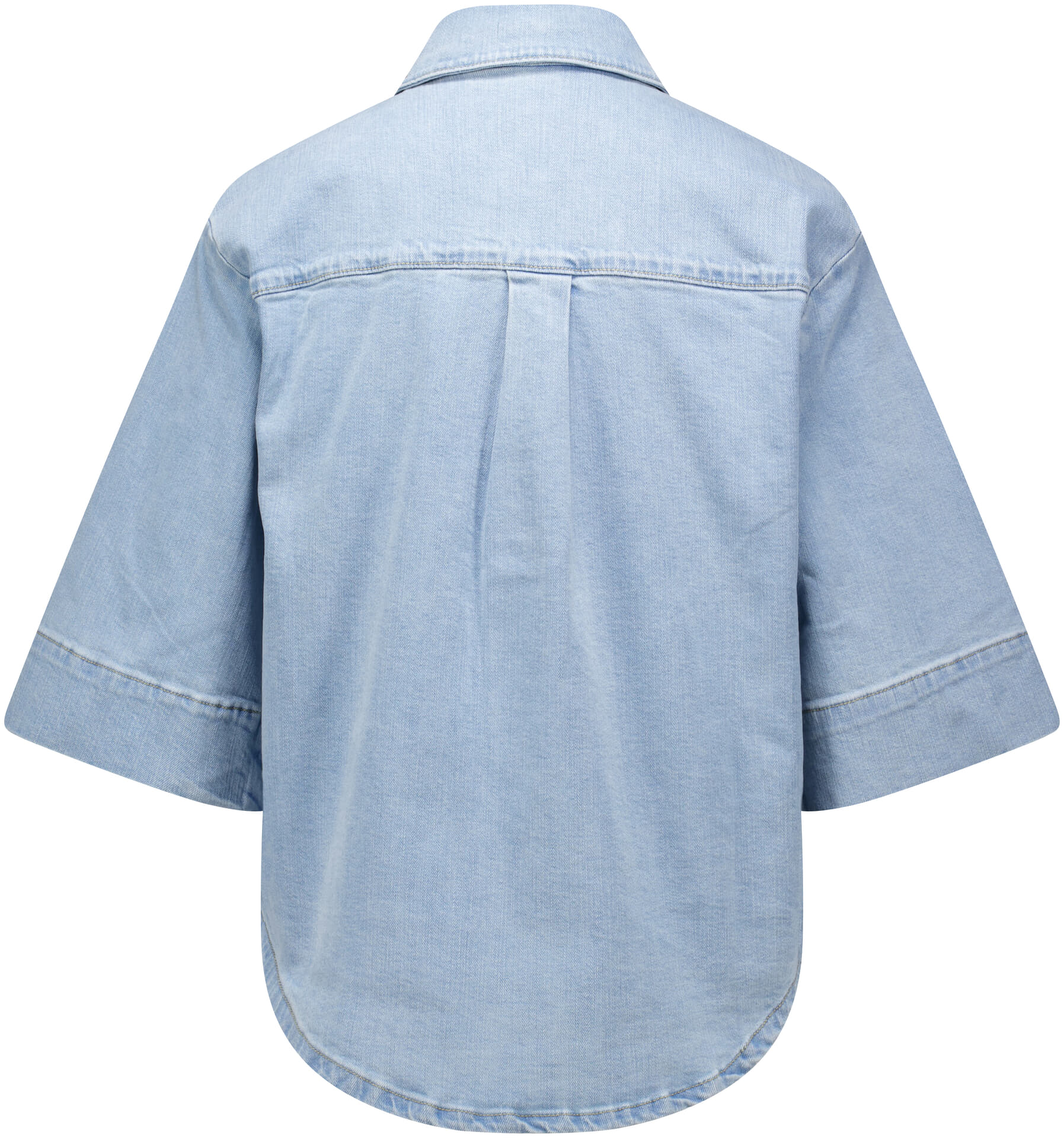 Blouse Olea-JA van Sisters Point is een overshirt met casual uitstraling. Het effen, lichtblauwe ontwerp heeft een spreidkraag, knoopsluiting en opgestikte zakken voor. De boxy, losse pasvorm en korte mouwen met brede omslag dragen luchtig. Combineer met een jeans of pantalon.
