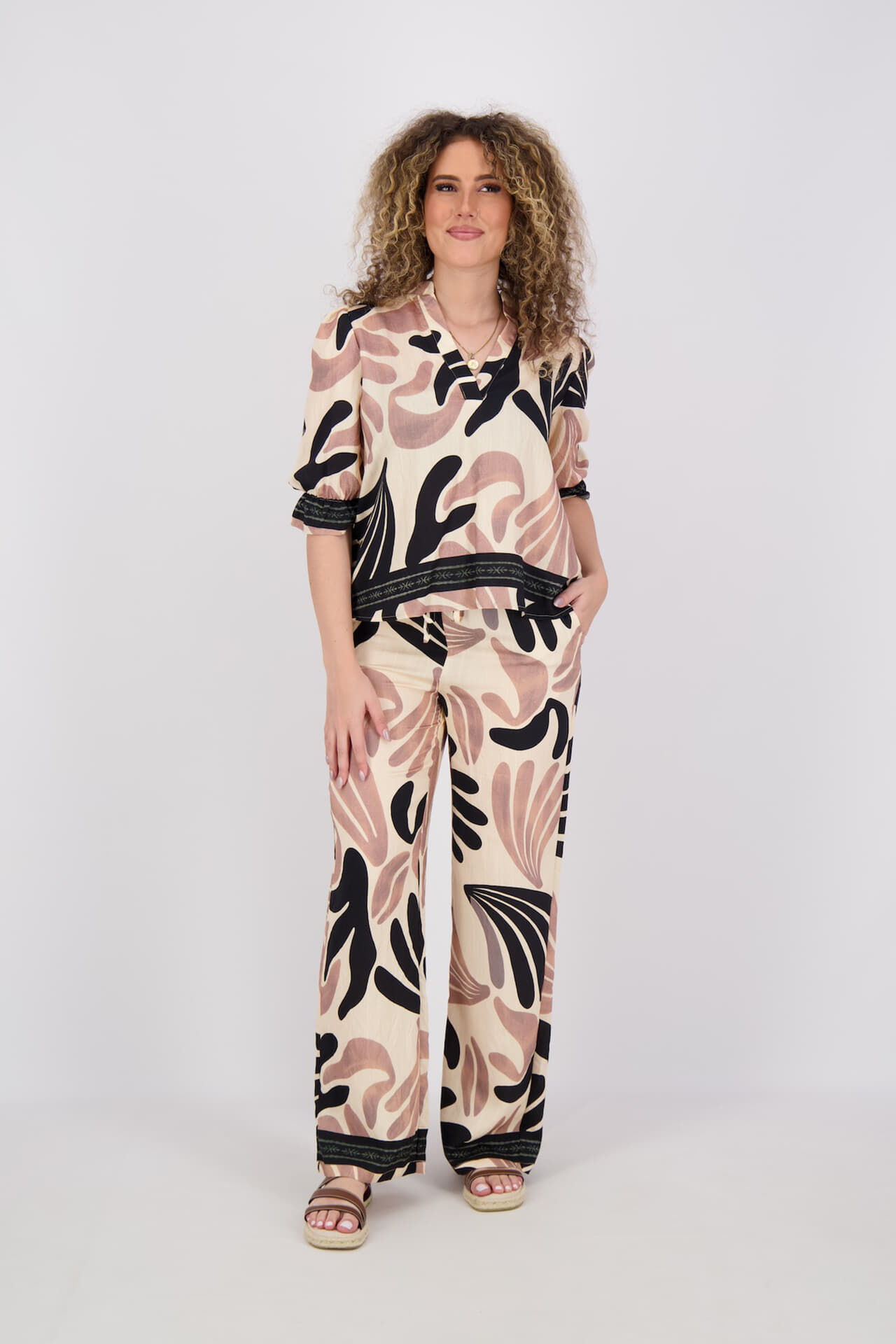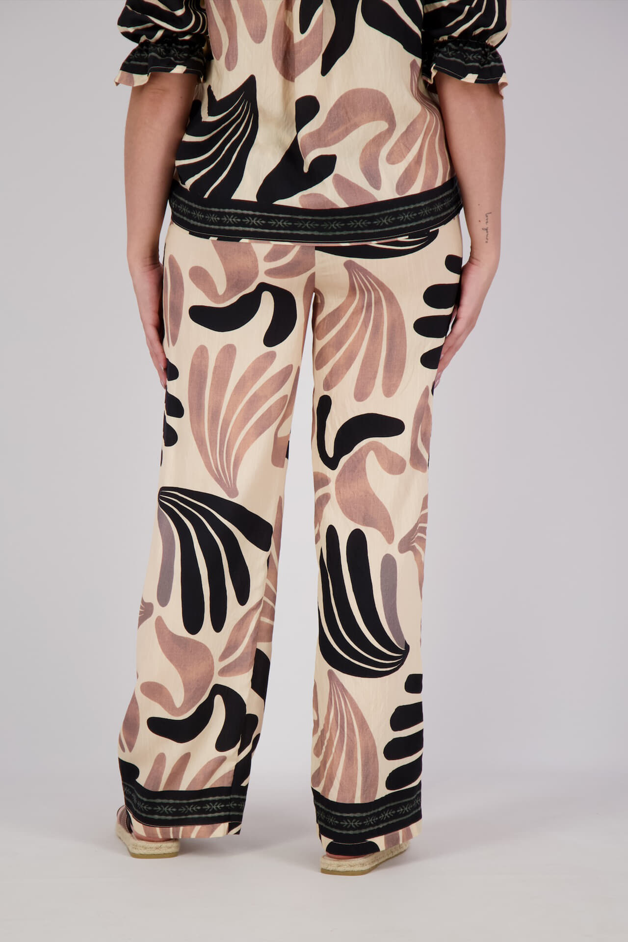 Broek Ella van Sisters Point is een lange broek met bohemian uitstraling. De elastische taille met koord zit comfortabel, de wijde pijpen vallen soepel. Het grafische patroon in contrasttinten geeft karakter. Met achterzakken en een decoratieve band aan de zoom, ideaal voor casual dagen.