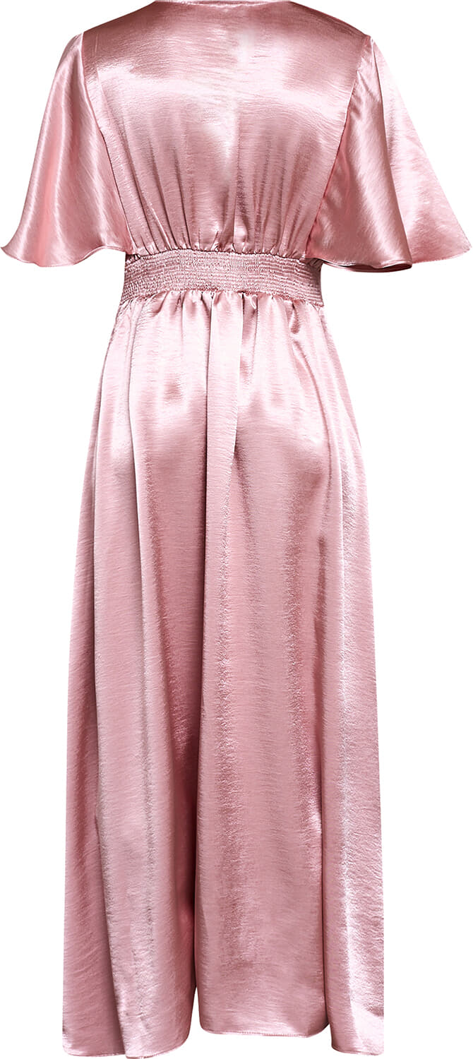 Jurk Gisela van Sisters Point is een effen maxi jurk voor een feest. De V-hals en korte, wijde mouwen geven ruimte, terwijl de hoge taille met elastische inzet de pasvorm ondersteunt. De glanzende, soepelvallende stof beweegt prettig. Combineer met hakken en een compacte tas.