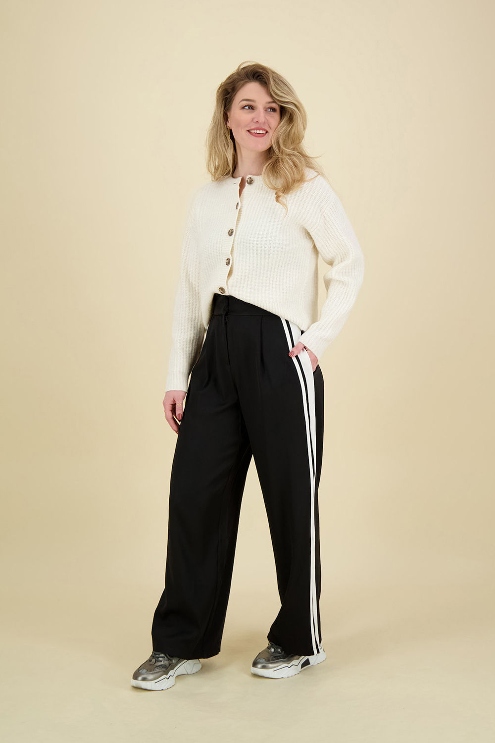 De Pantalon Galya van Sisters Point combineert comfort en stijl. Deze dames pantalon heeft een losse pasvorm met een elastische tailleband en opvallende witte zijstrepen. Gemaakt van hoogwaardige materialen, ideaal voor een casual of chique uitstraling. Perfect te combineren met diverse tops.