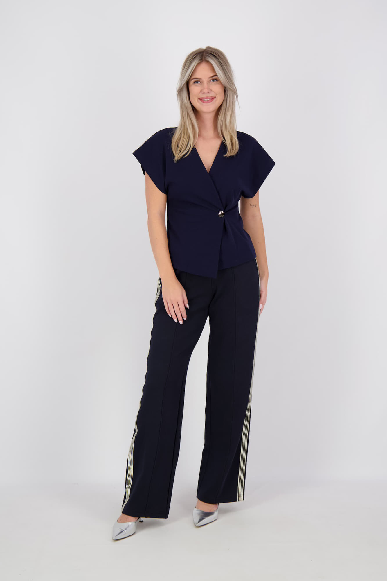De Top Gevela van Sisters Point is een elegante dames top korte mouw met een verfijnde uitstraling. De V-hals en getailleerde pasvorm accentueren subtiel de vrouwelijke lijnen, terwijl de korte mouwen en effen patroon een tijdloze charme toevoegen aan elke garderobe.