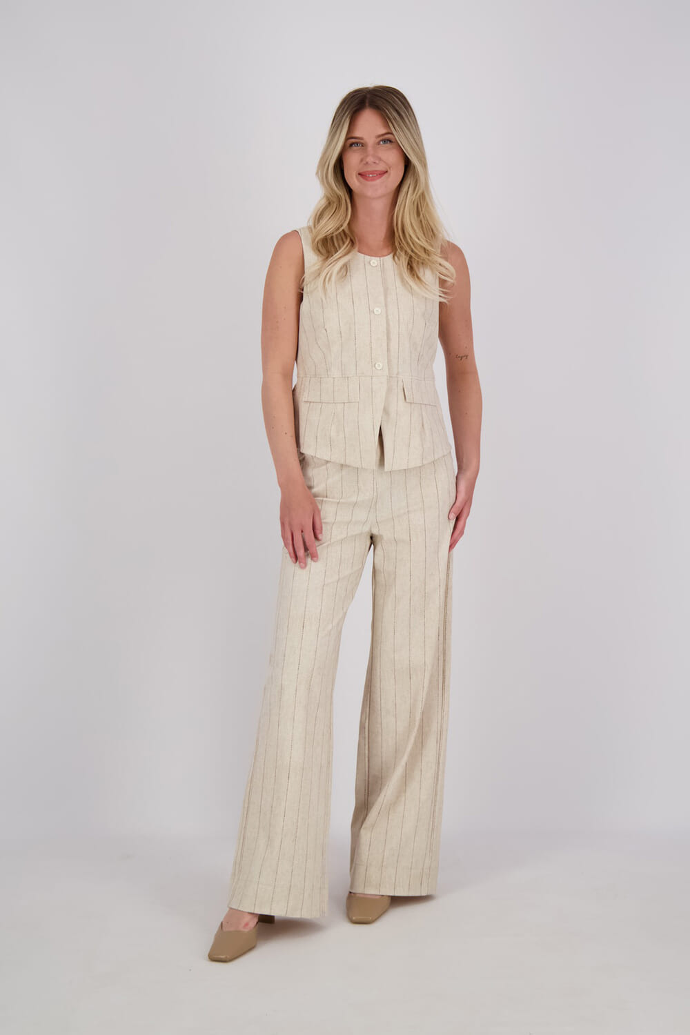 De Gilet Rebekka Pinstripe van Studio Anneloes is een stijlvol dames gilet met een getailleerde pasvorm. Het ontwerp heeft een ronde halslijn, knoopsluiting en zakken aan de voorzijde. De verfijnde strepen maken het perfect voor nette gelegenheden.