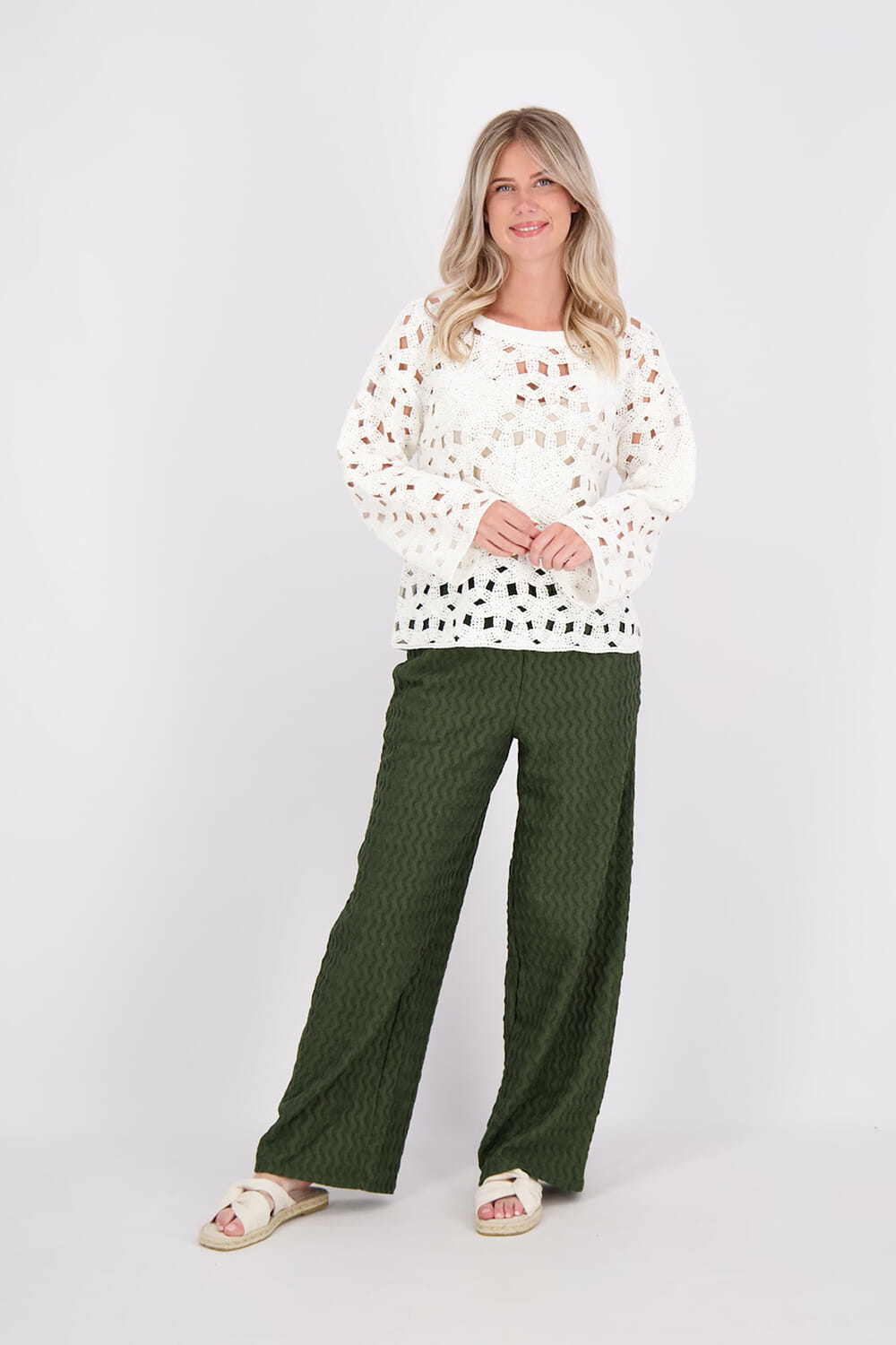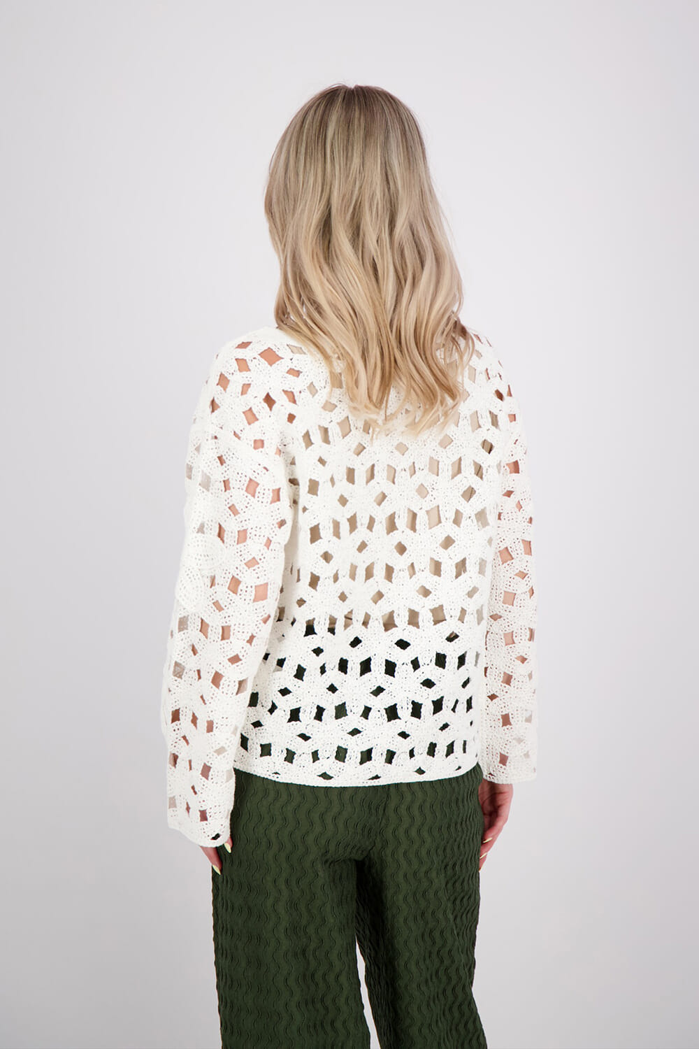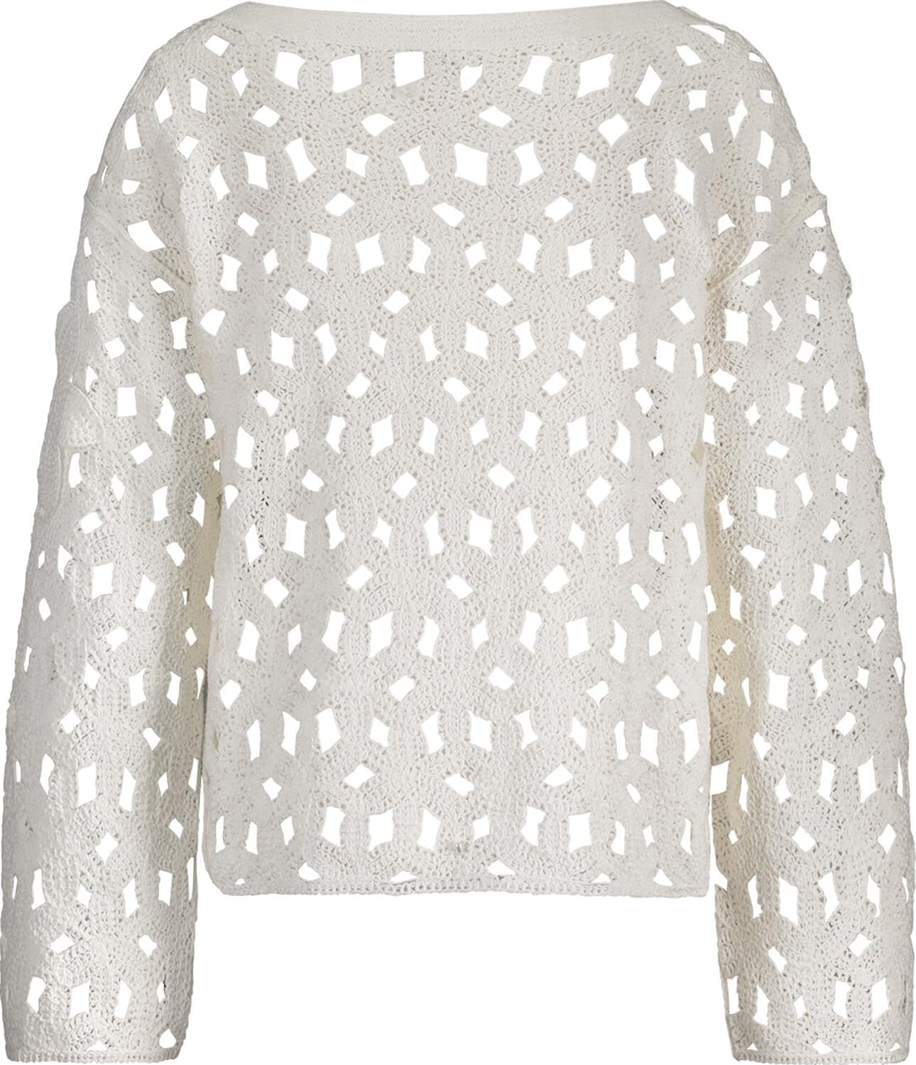 De Pullover Amarey Flower van Studio Anneloes is een stijlvolle dames sweater met een minimalistisch design. Deze gebreide sweater heeft een ronde halslijn en lange mouwen met een uniek gaatjespatroon, wat zorgt voor een luchtige uitstraling en veelzijdige draagbaarheid.