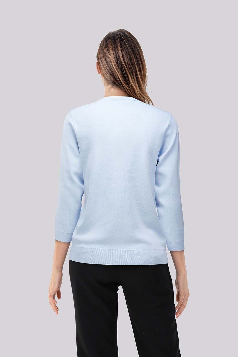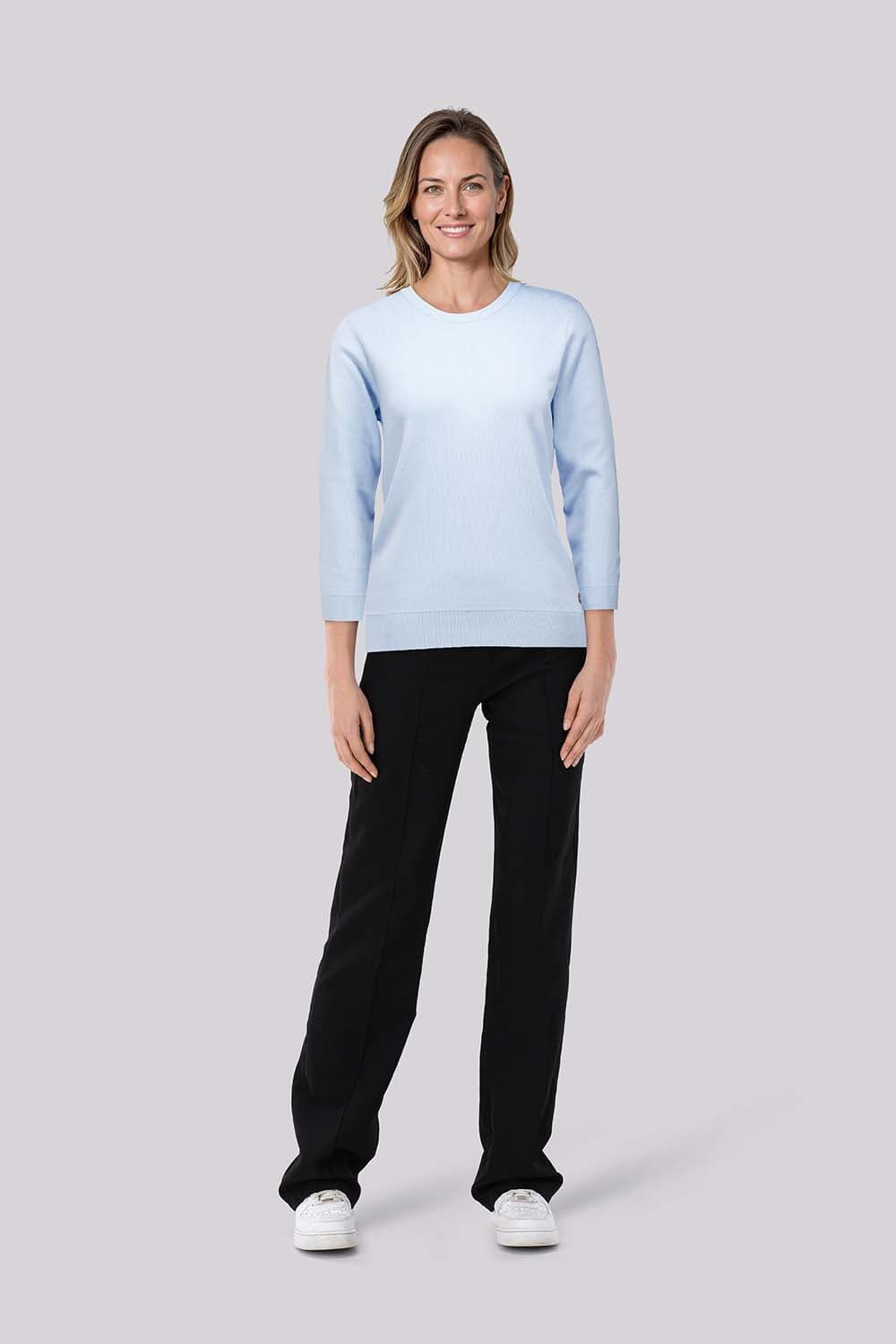 Pullover Luna 3/4 Mouw van Studio Anneloes is een trui met ronde hals, regular pasvorm en effen, lichtblauwe kleur. De lange mouwen hebben ribgebreide boorden voor een nette afwerking. Draag casual op een pantalon of jeans voor een rustige, minimalistische stijl.