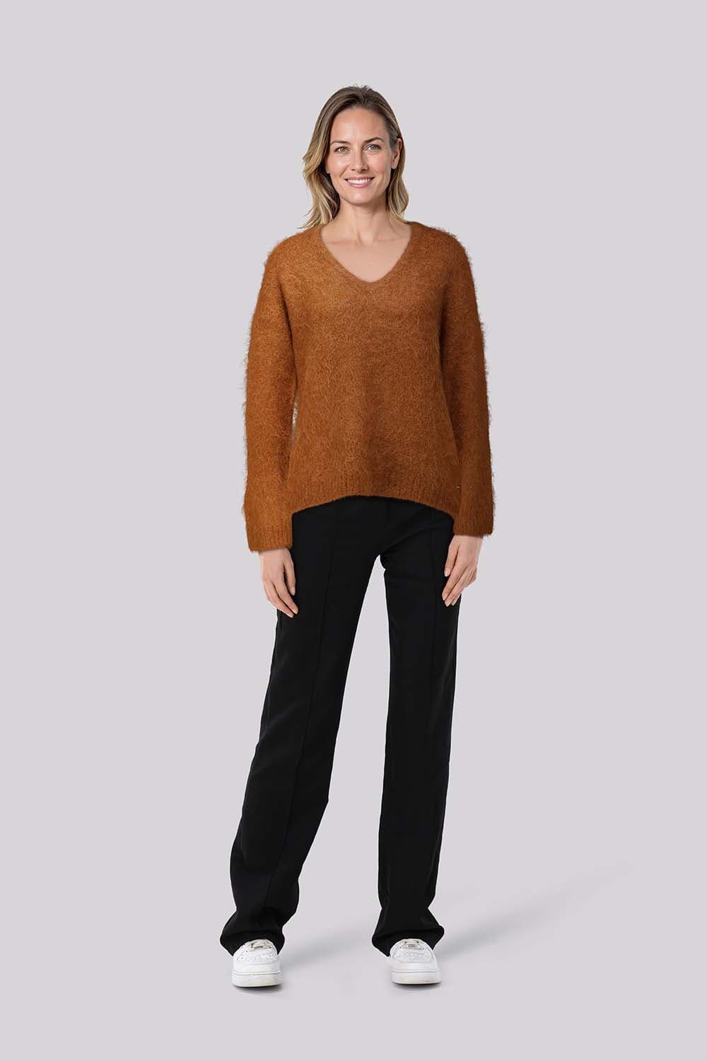 De Sweater Liana van Studio Anneloes is een casual dames sweater met een v-hals en lange mouwen. Het effen patroon en de zachte textuur zorgen voor een stijlvol en comfortabel kledingstuk dat gemakkelijk te combineren is met diverse outfits voor elke gelegenheid.