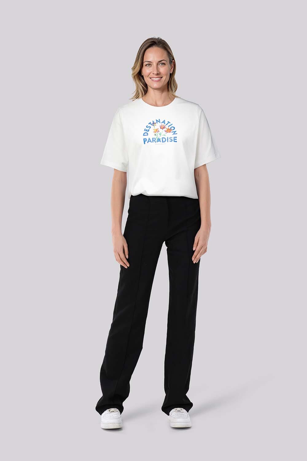 Het T-shirt Paradise van Studio Anneloes is een casual dames top korte mouw met een ronde hals. Het heeft een opvallend bloemenpatroon en een logo opdruk, perfect voor een ontspannen en modieuze uitstraling. Ideaal voor informele gelegenheden en veelzijdig in stijl.