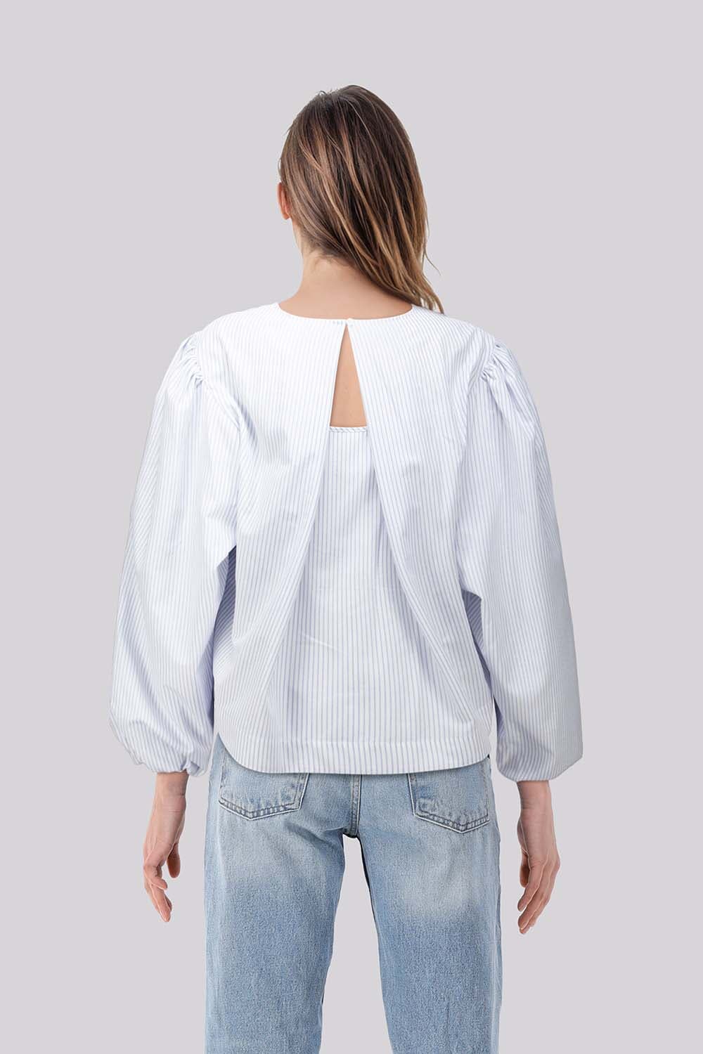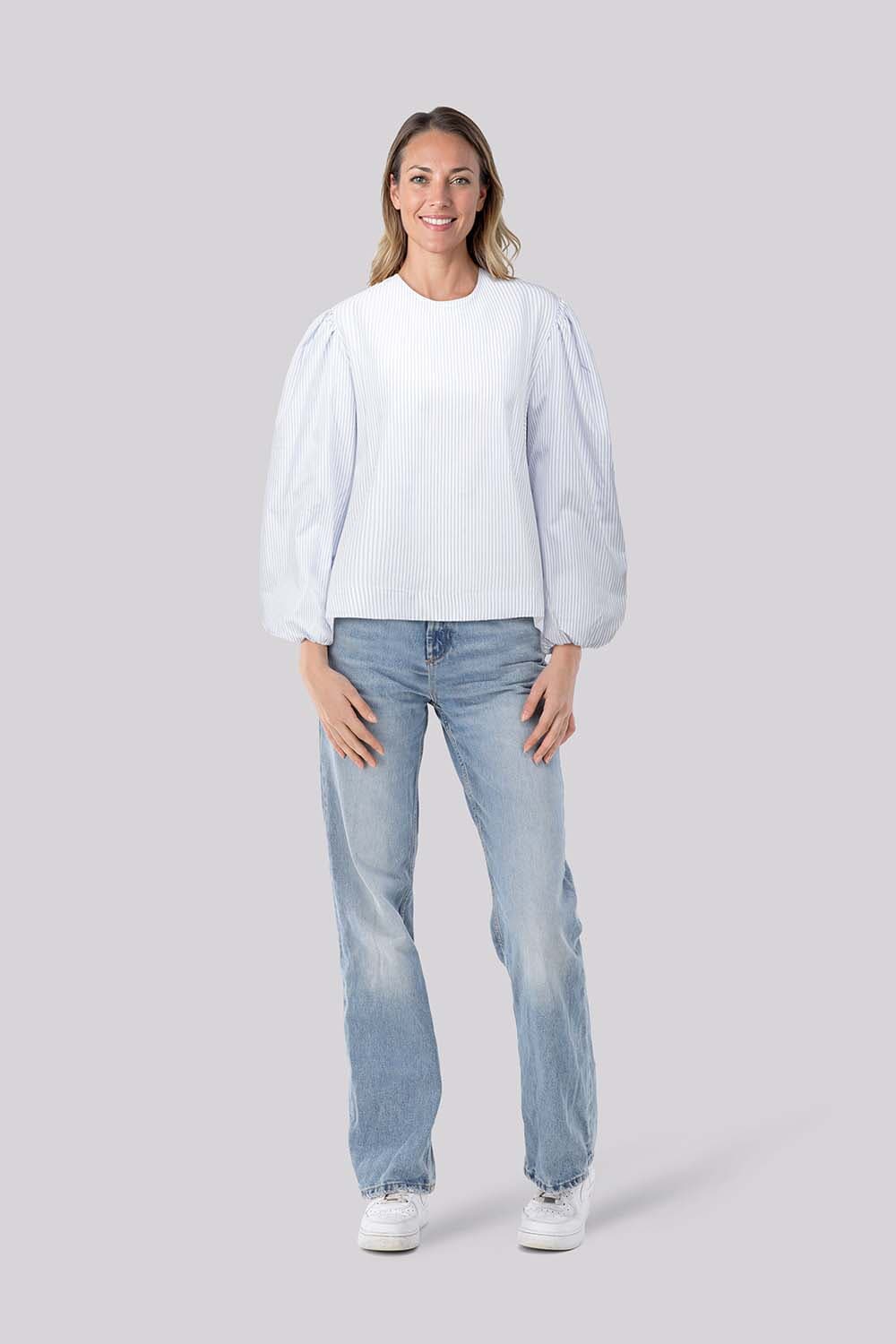 Top Florence Stripe, top lange mouw van Studio Anneloes, heeft een ronde hals, streeppatroon en een regular, losse pasvorm. De lange mouwen zijn licht gepoft met plooidetails. Achter zorgt een split met knoopsluiting voor extra ruimte. Combineer met jeans of een nette broek.