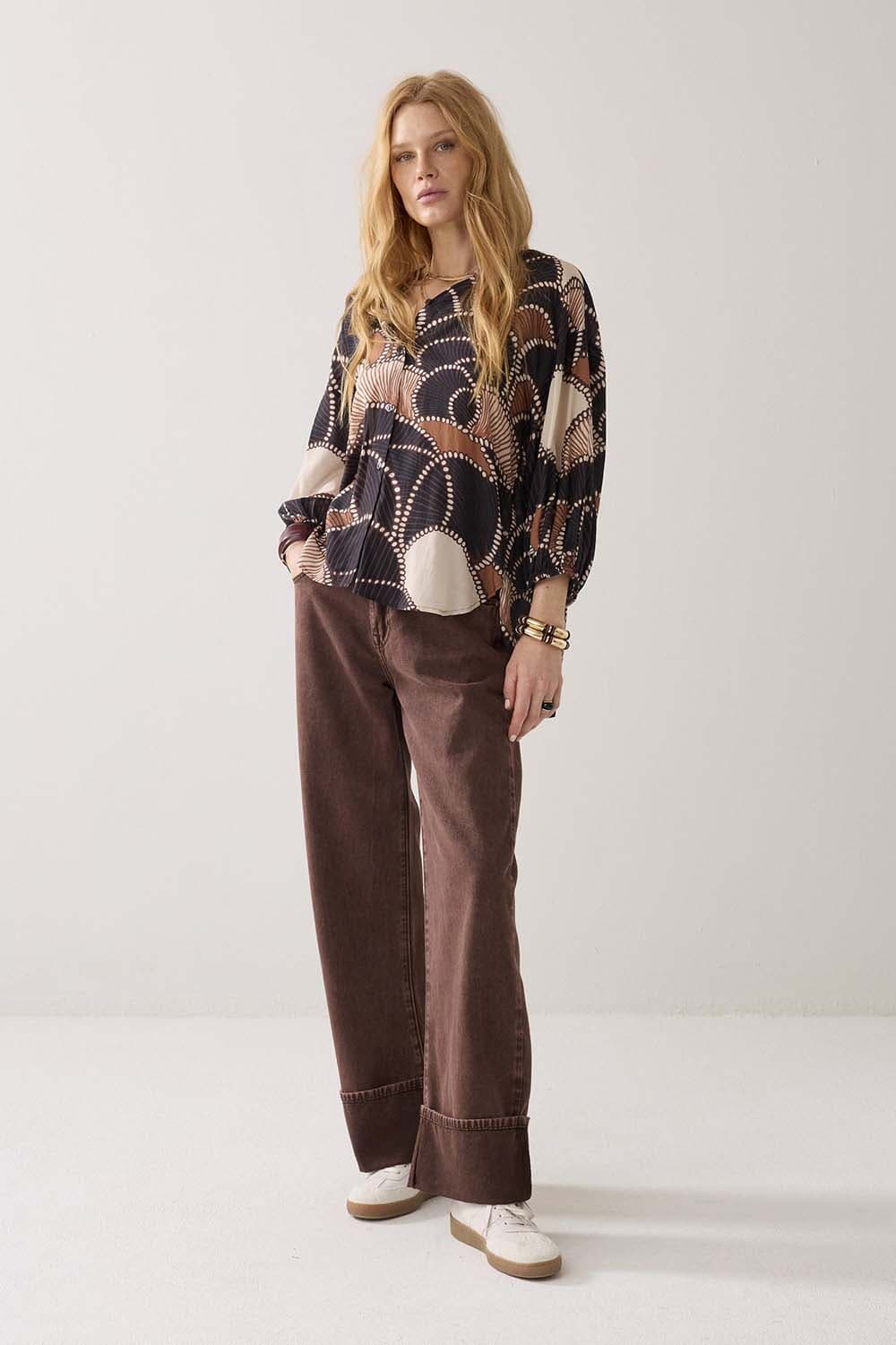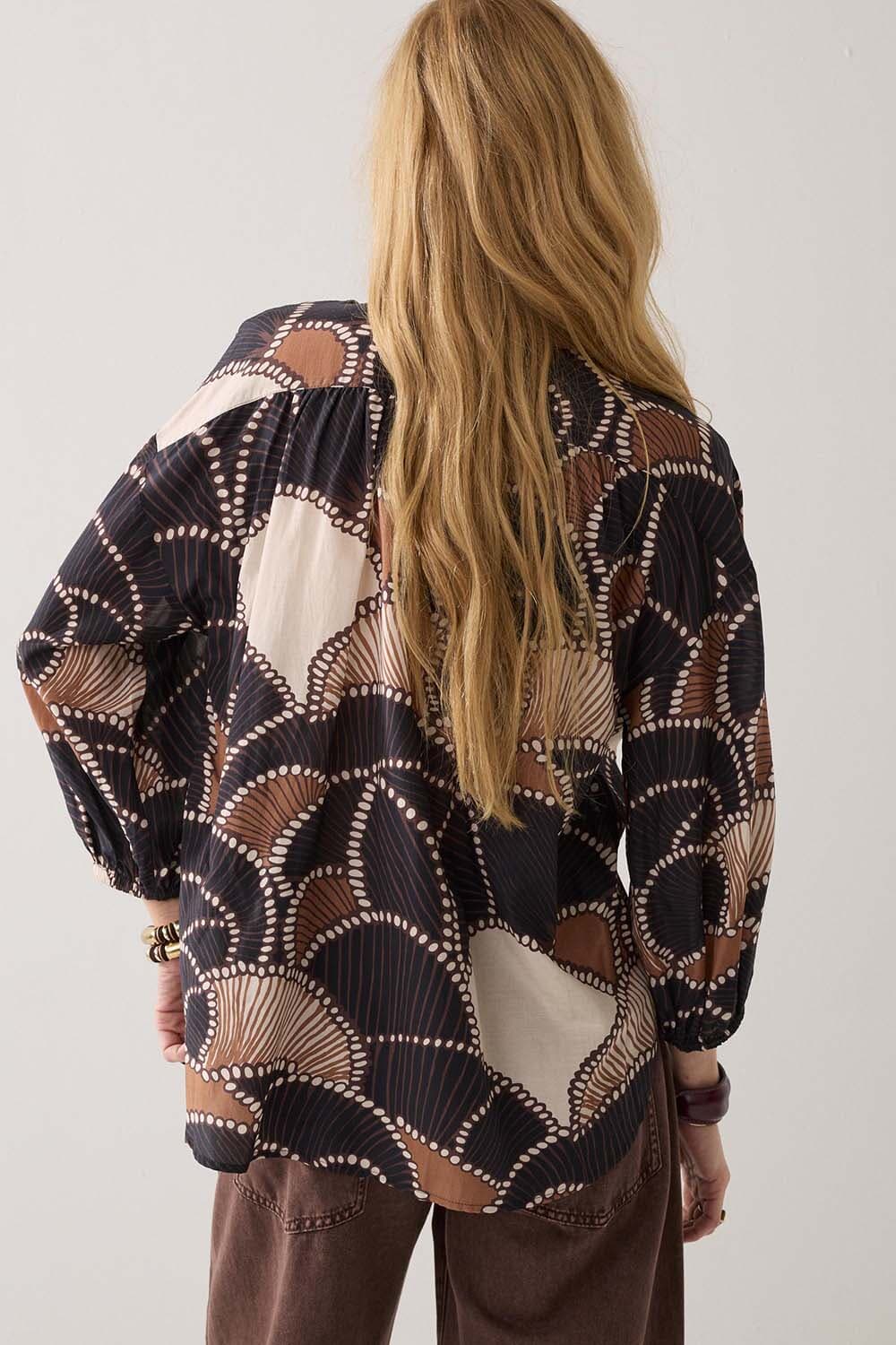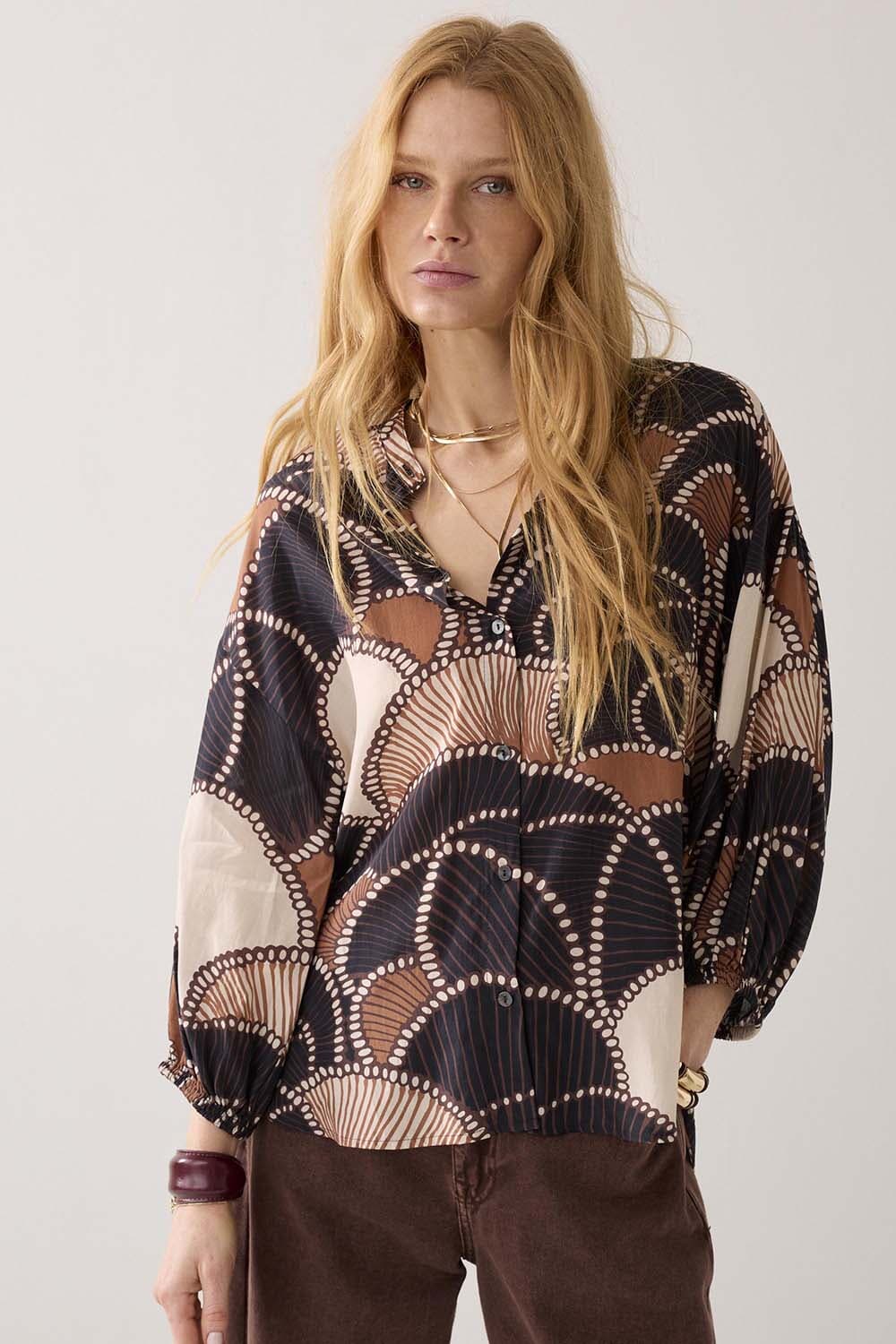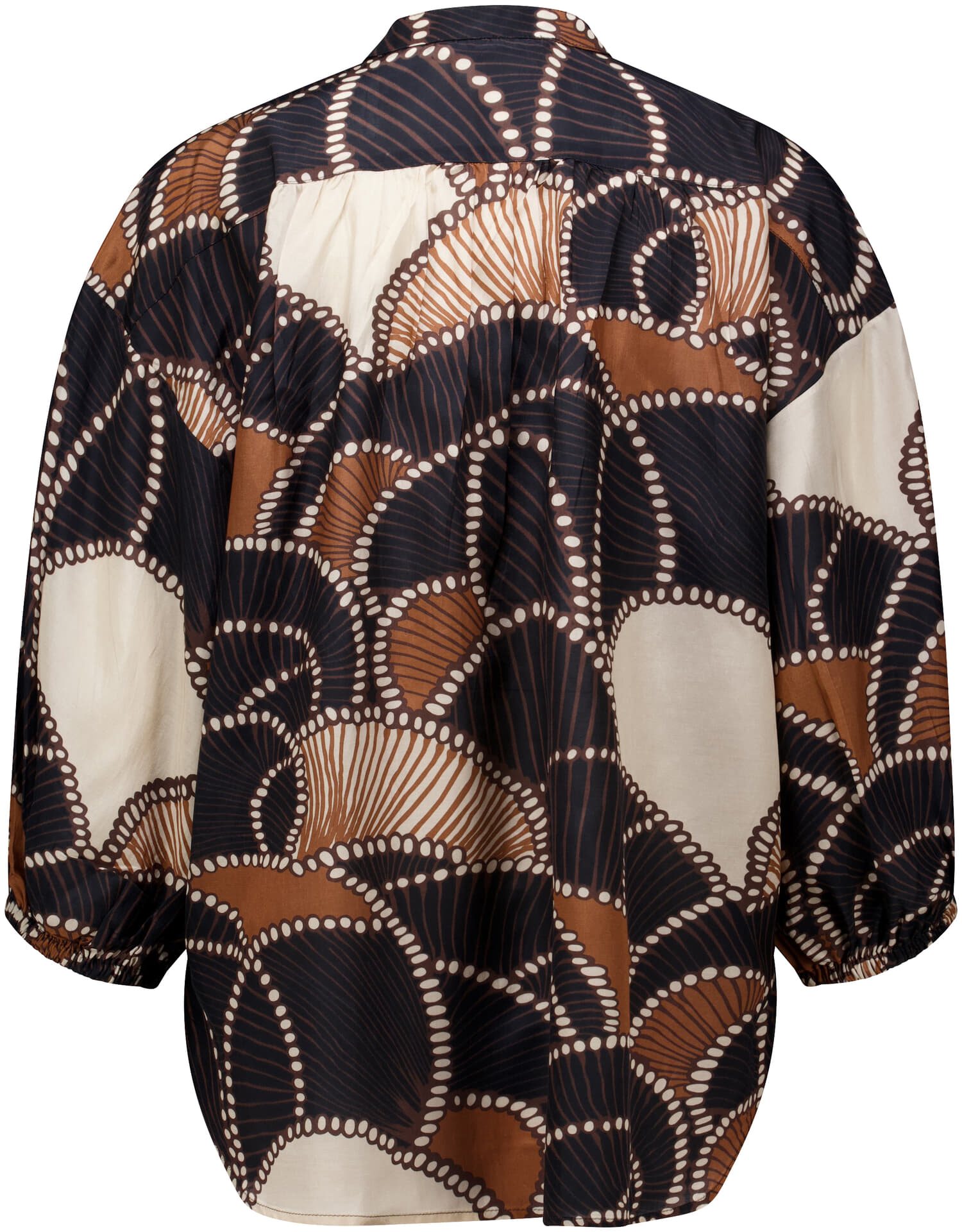 De All Over blouse van Summum is een modieuze damesblouse met een losse pasvorm en een opvallend grafisch patroon dat direct de aandacht trekt. De lange mouwen en de subtiele opstaande kraag geven de blouse een moderne, casual uitstraling.Dit is een comfortabele blouse die perfect is voor dagelijks gebruik, maar ook zeer geschikt voor speciale gelegenheden wanneer je stijlvol wilt opvallen.