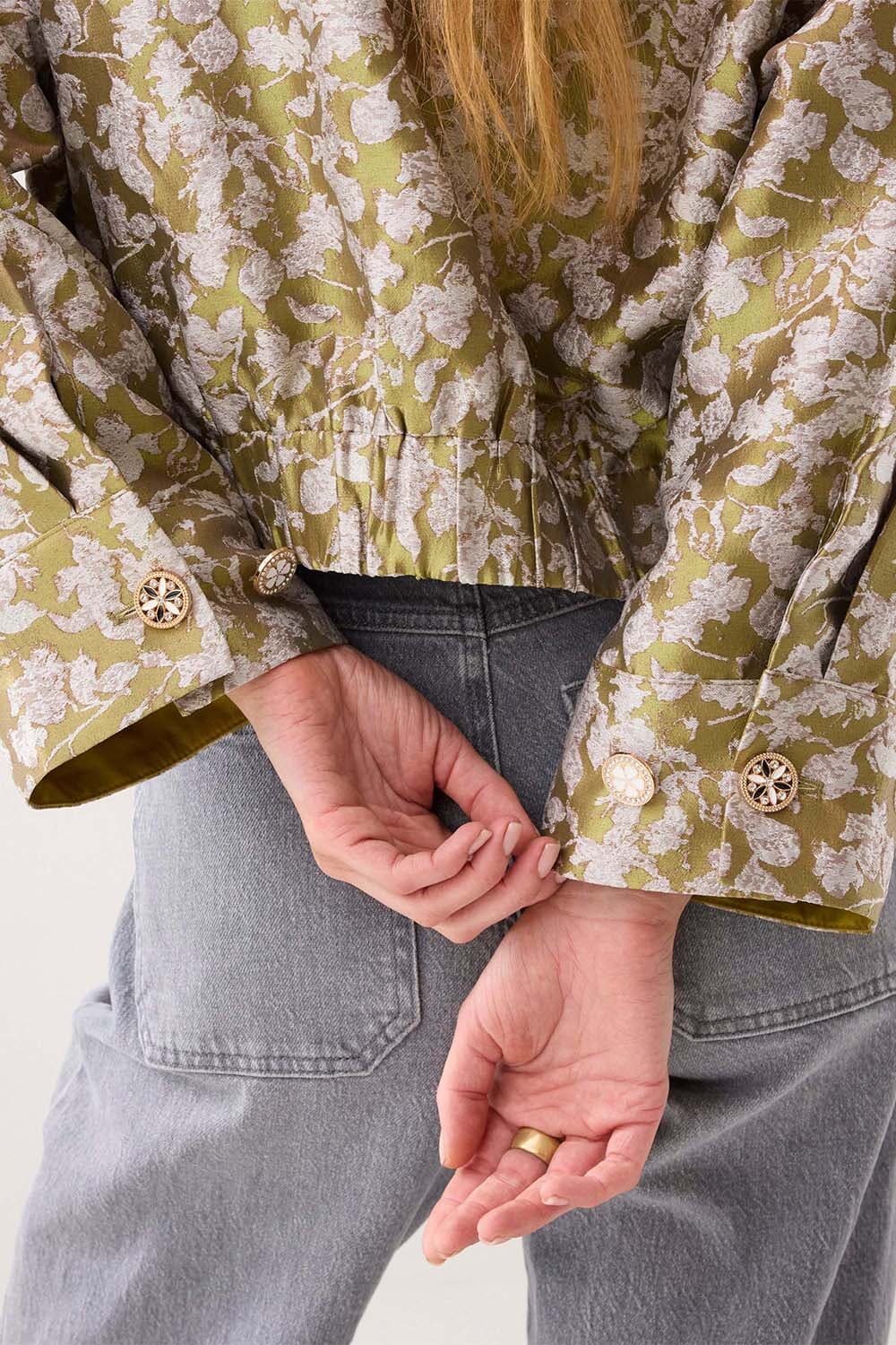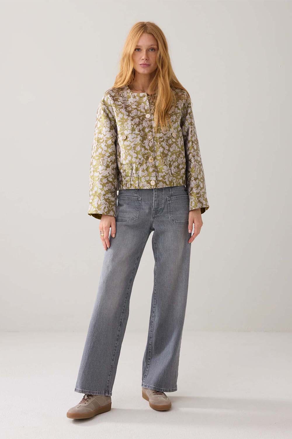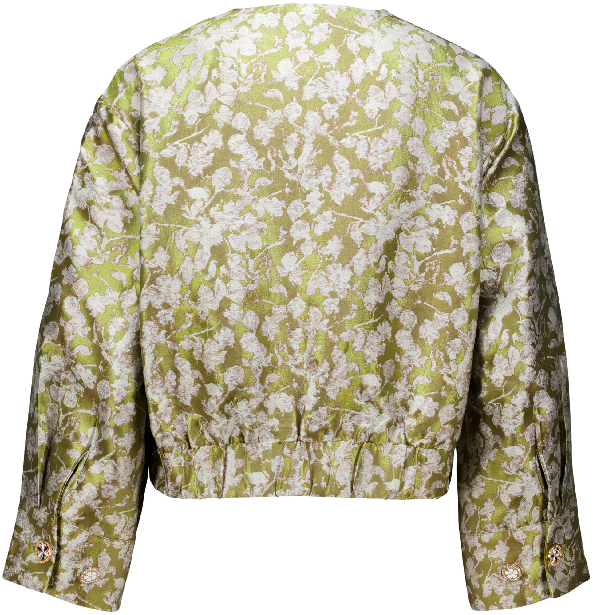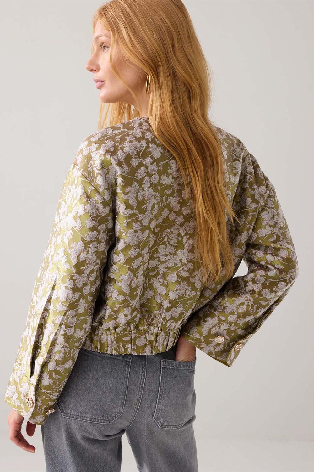 De Bomberjas Leaves Jaquard van Summum is een elegante tussenjas met een button-down kraag en bloemenpatroon. Ontworpen met een cropped fit en lange mouwen, perfect voor casual gelegenheden. De dames blazer sluit met knopen en biedt een stijlvolle uitstraling.