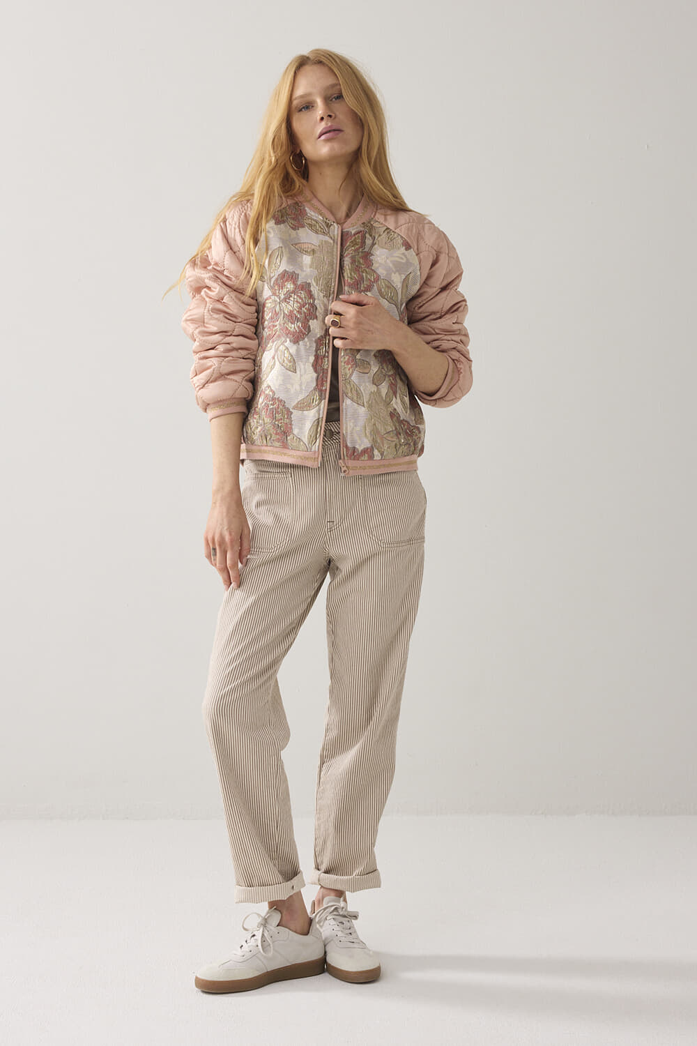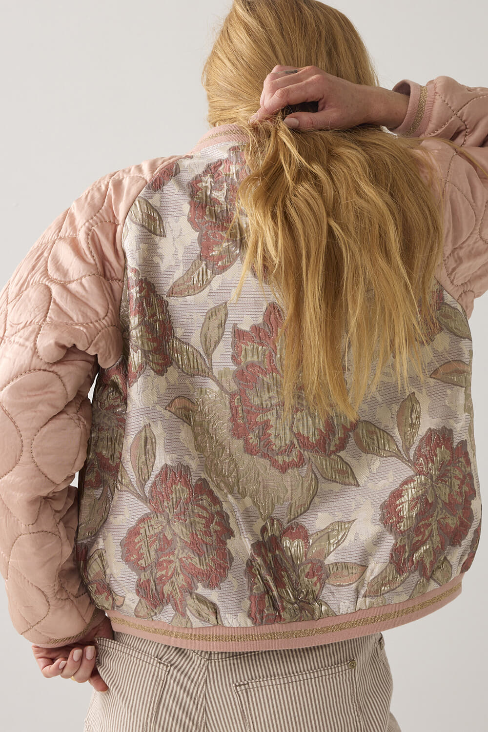Het Bombervest Rose Jacquard van Summum combineert bohemian stijl met comfort. Dit vest heeft een opstaande kraag, rits en zakken aan de voorzijde. De lange mouwen zijn voorzien van ribgebreide boorden, en de bloemen 3D-print voegt een trendy touch toe aan deze oversized fit.