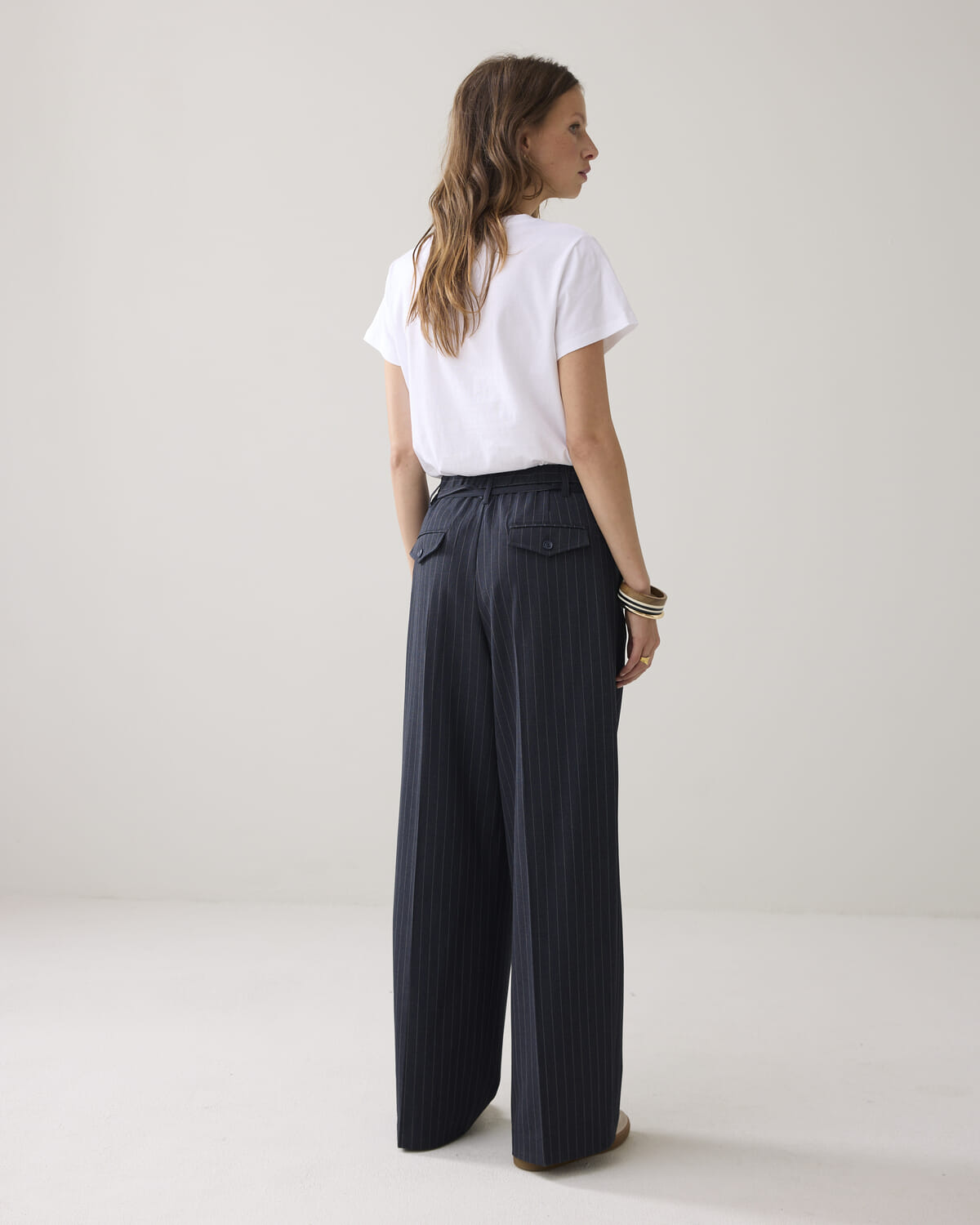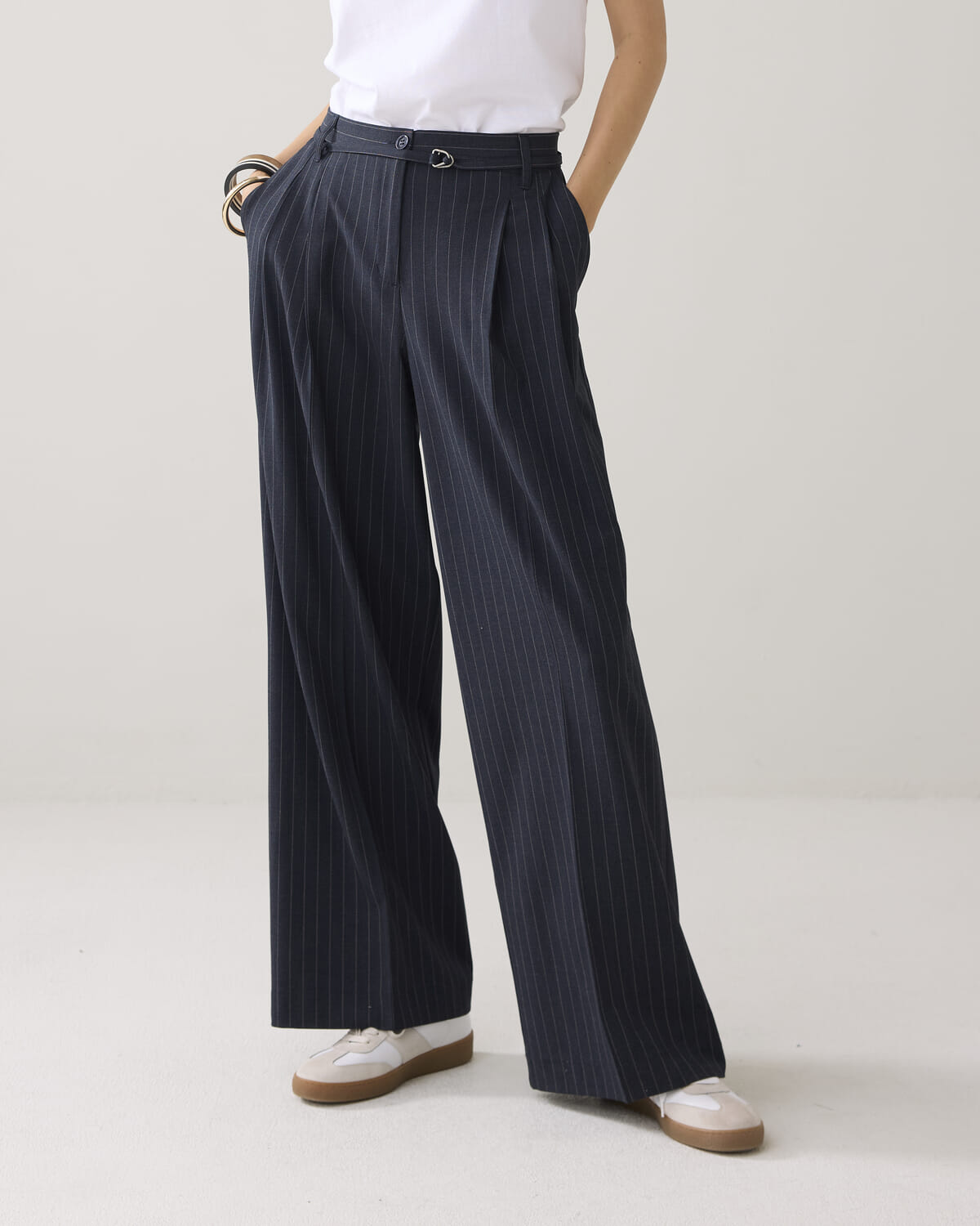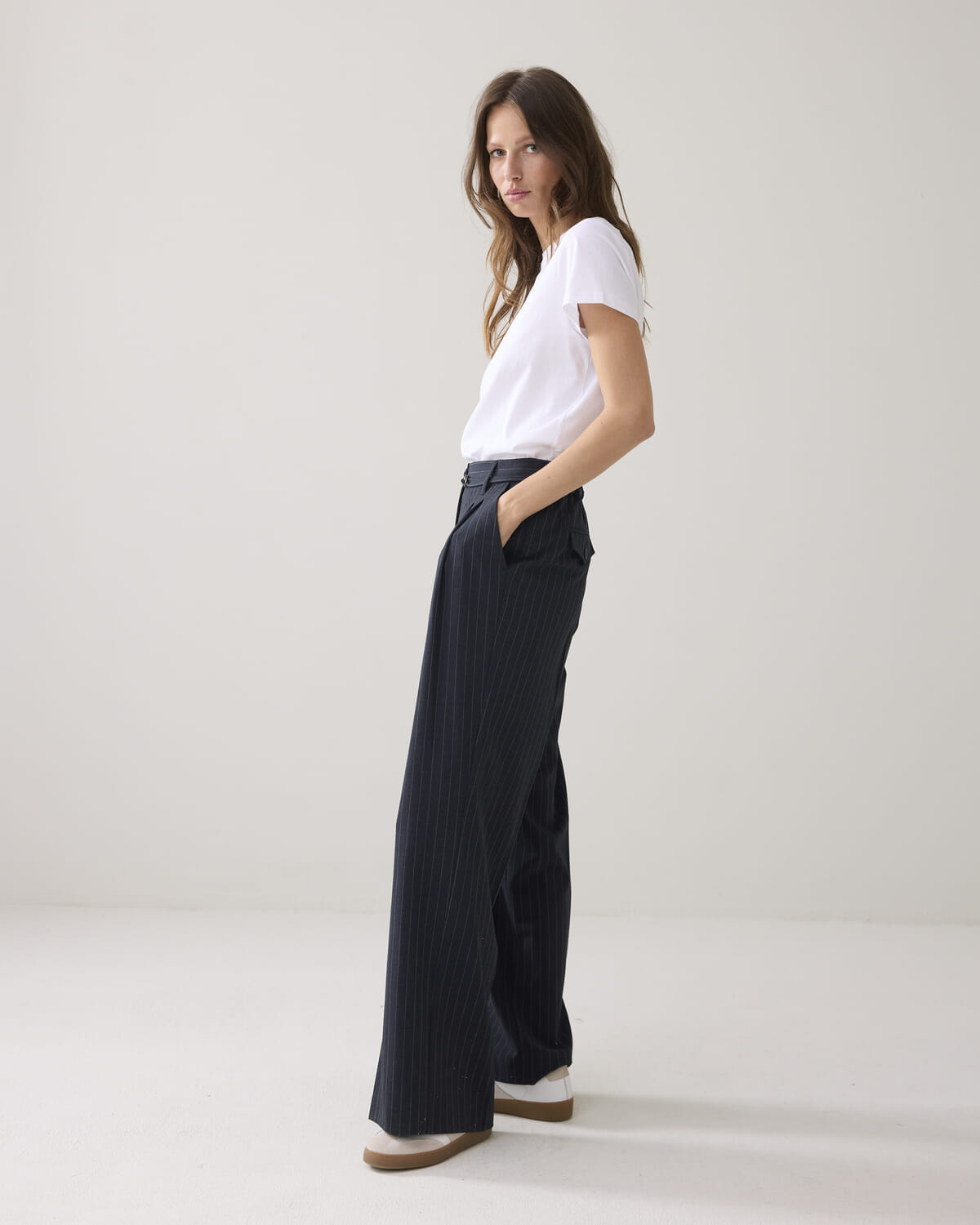 De Pantalon Pinstripe van Summum is een stijlvolle keuze met een zakelijke en verfijnde uitstraling. Deze dames pantalon heeft een normale taille en rechte pasvorm, voorzien van zakken aan de voorzijde en een knoop- en ritssluiting. De wijde pijpen en streep patroon maken het ideaal voor nette gelegenheden.