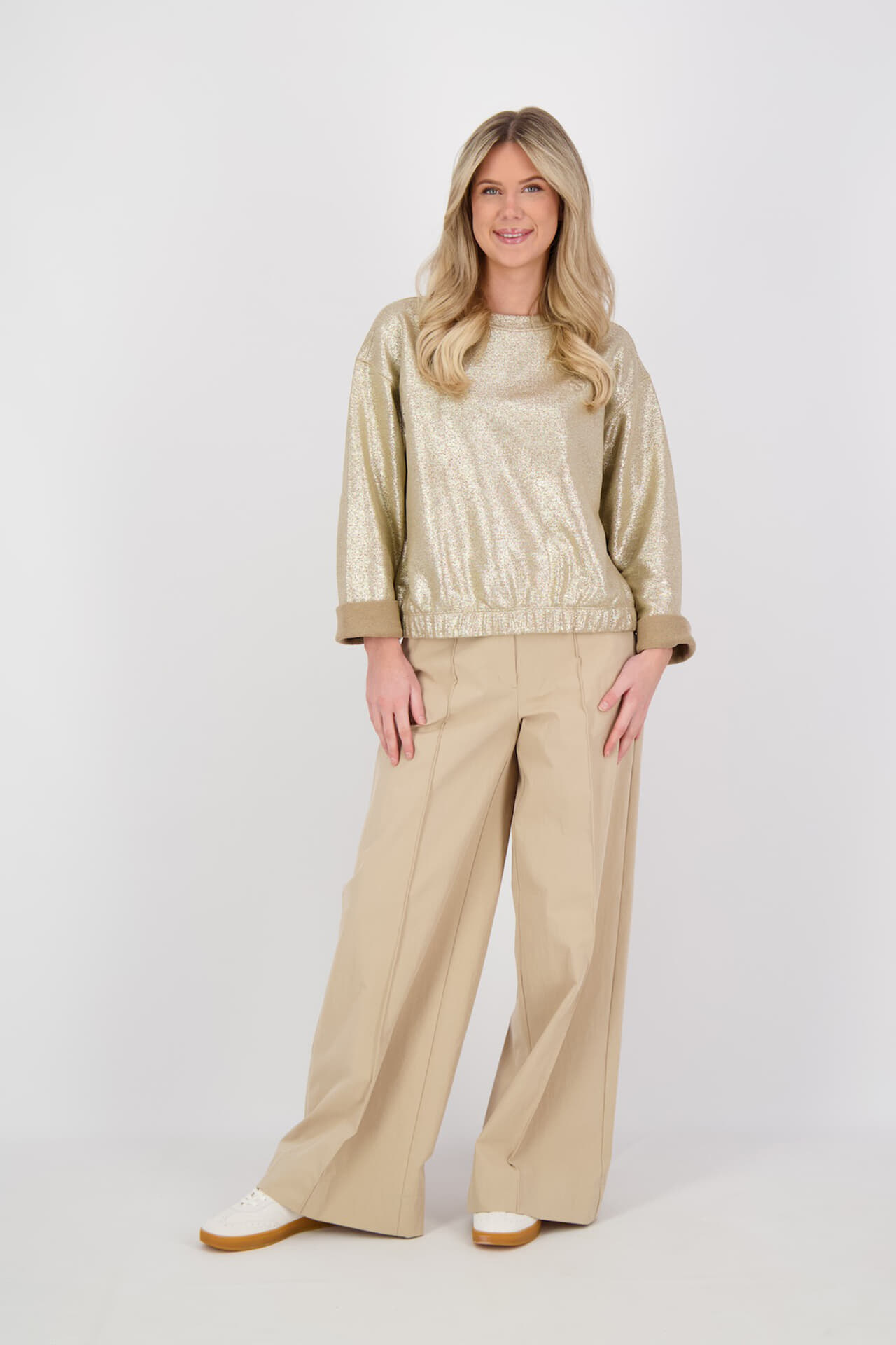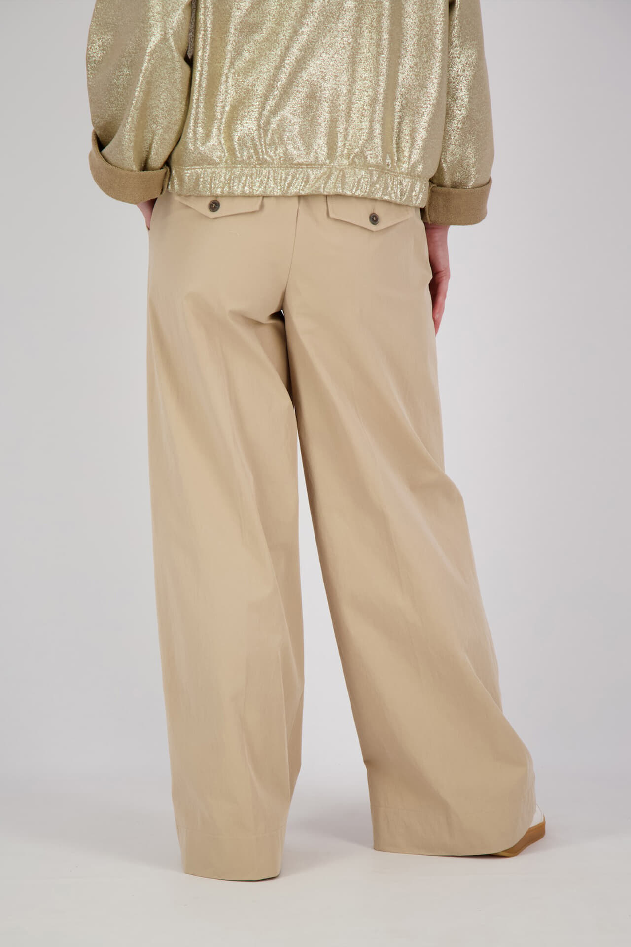 De Pantalon Wide Leg van Summum is een stijlvolle dames pantalon met een minimalistisch design. Deze broek heeft een normale taille, knoopsluiting en zowel voor- als achterzakken. De loose fit en wijde pijpen zorgen voor een comfortabele en modieuze uitstraling.