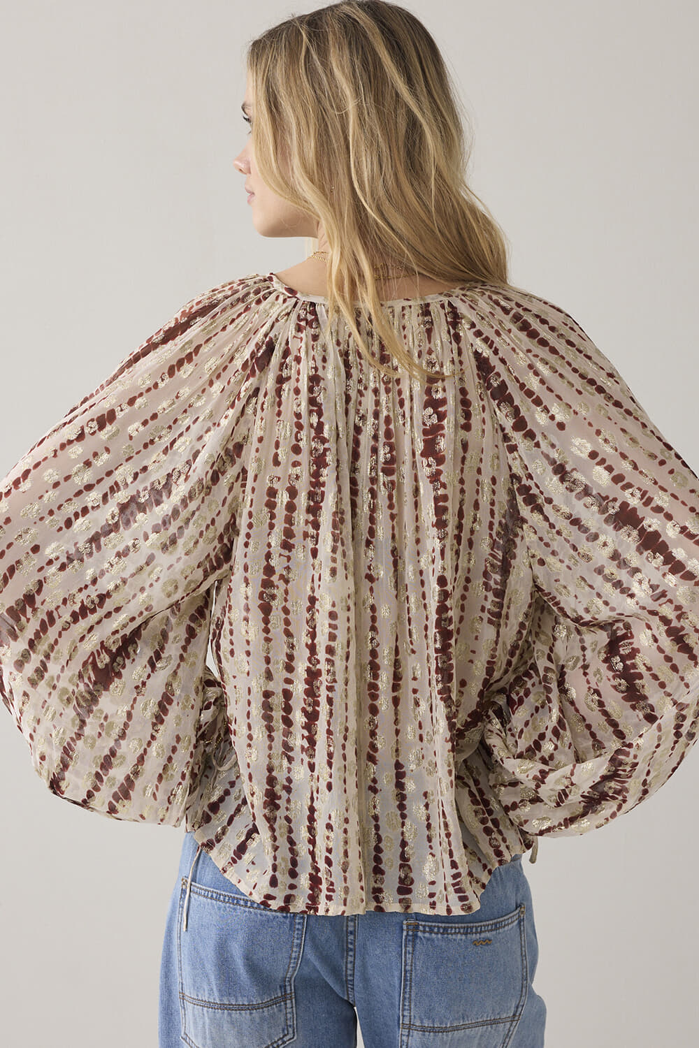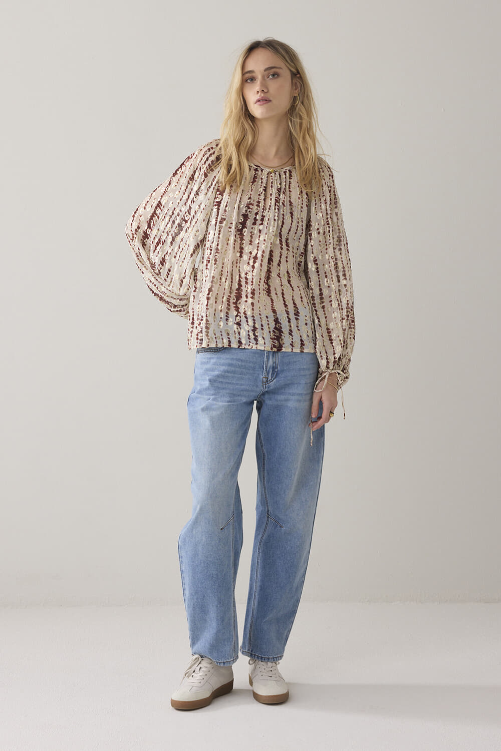 De Top Georgette Tiedye van Summum is een stijlvolle dames longsleeve met een bohemian uitstraling. Deze casual top heeft een ronde hals, lange mouwen zonder knopen, en een opvallend tie-dye patroon. Perfect voor een comfortabele en modieuze casual gelegenheid.