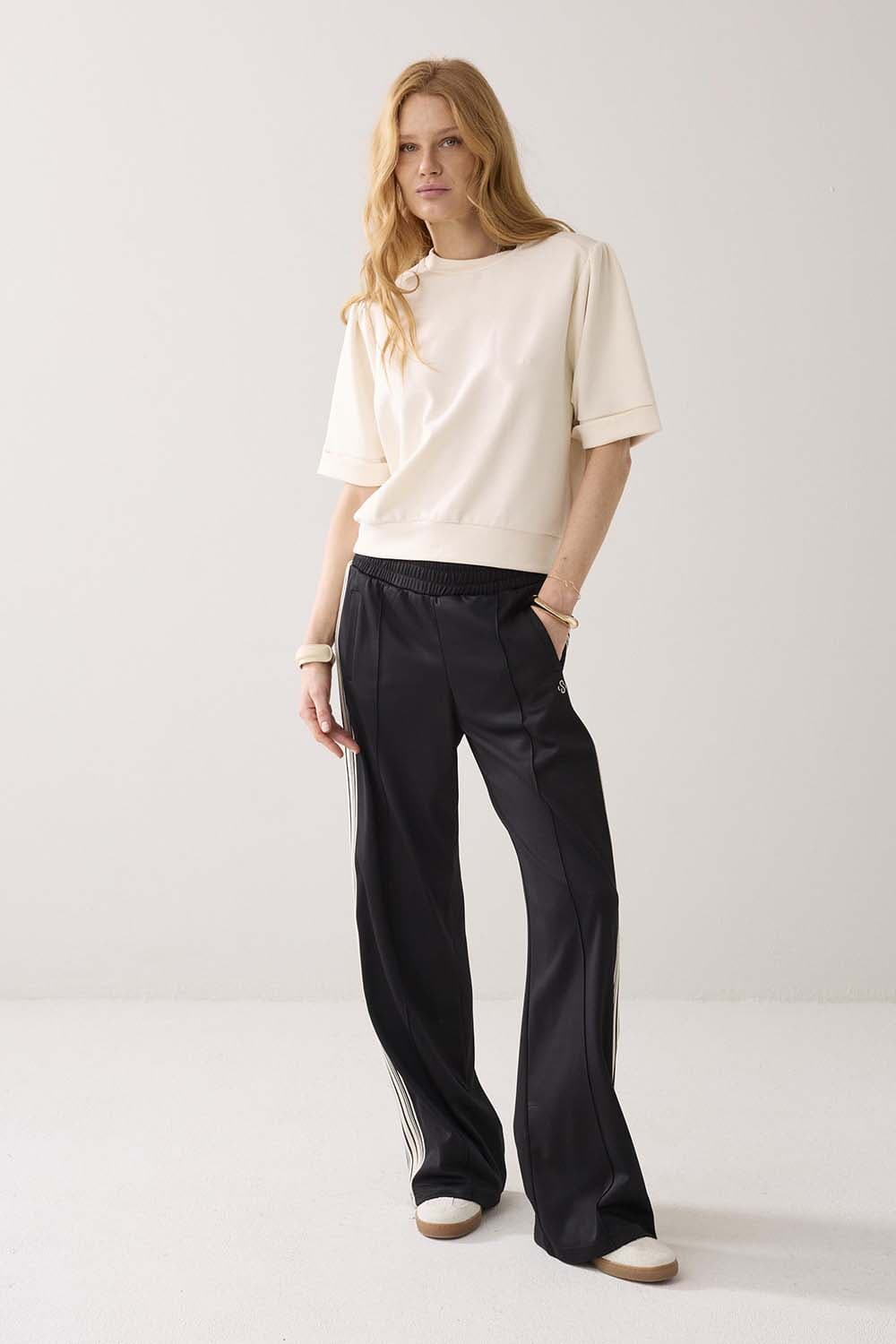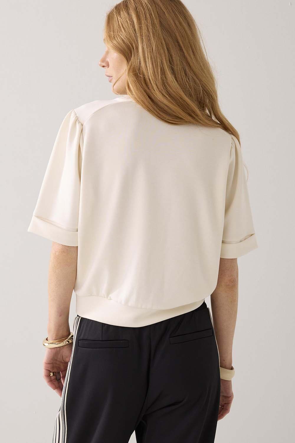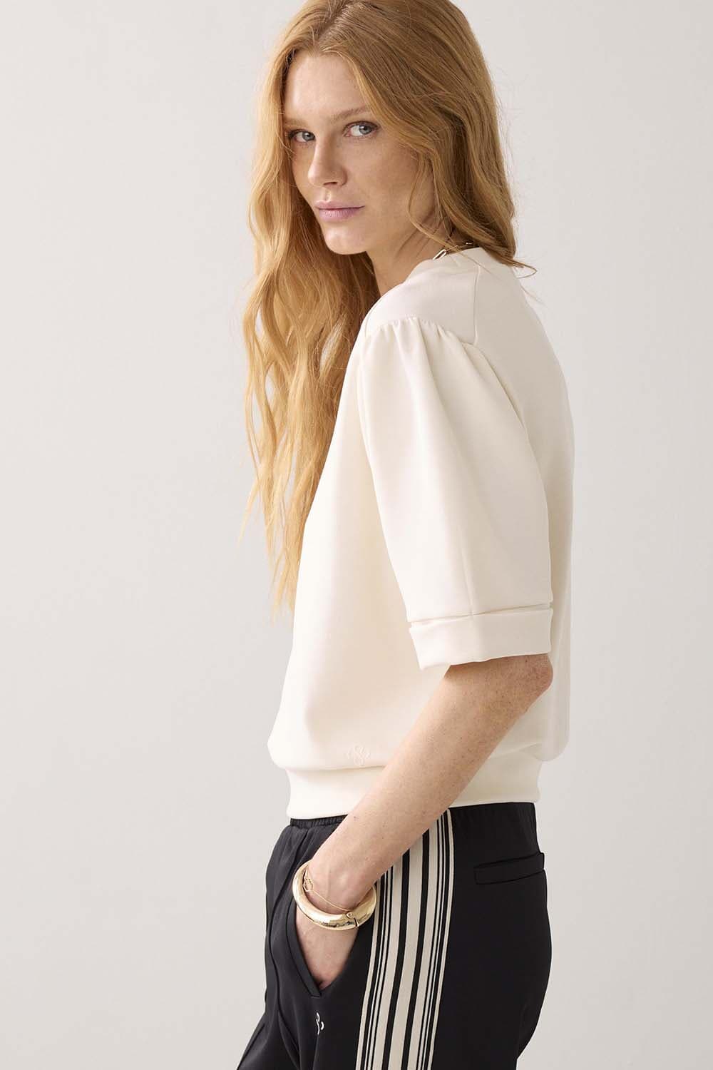 De Top Soft scuba van Summum is een stijlvolle dames top met een minimalistische uitstraling. Deze effen top heeft een ronde halslijn en ribgebreide mouwboorden. De pasvorm is regular, met 3-kwart mouwlengte. Perfect voor een casual gelegenheid.