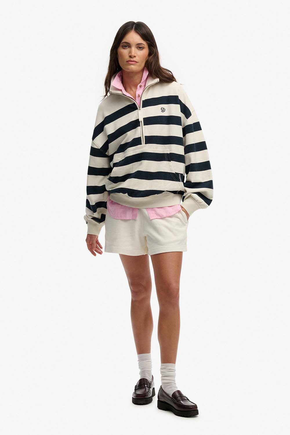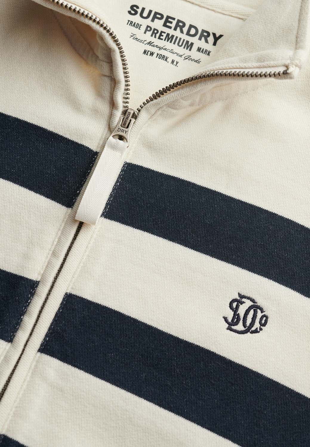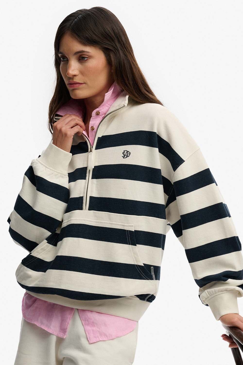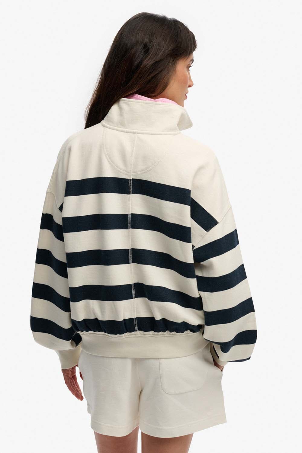 Sweater Studios Stripe van Superdry & Co. heeft een opstaande kraag met rits en hoge hals. De oversized, relaxed pasvorm en lange mouwen met ribgebreide boorden dragen comfortabel. Het streeppatroon met subtiel logo geeft een casual uitstraling. Combineer met een jeans of rok.