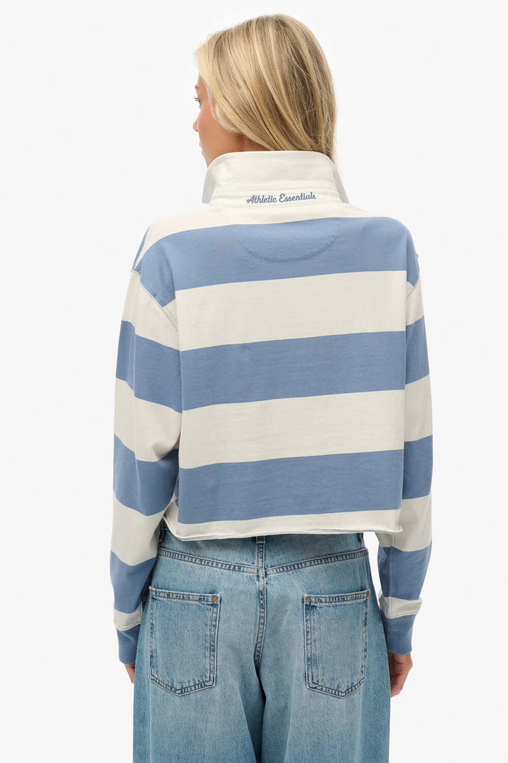 De Rugby Athletic Essential Stripe van Superdry combineert een sportieve stijl met een stijlvolle uitstraling. Met een capuchon, knopen als sluiting, en een polokraag biedt deze cropped, oversized fit zowel comfort als mode. Lange mouwen en een gestreept patroon maken het geheel af.