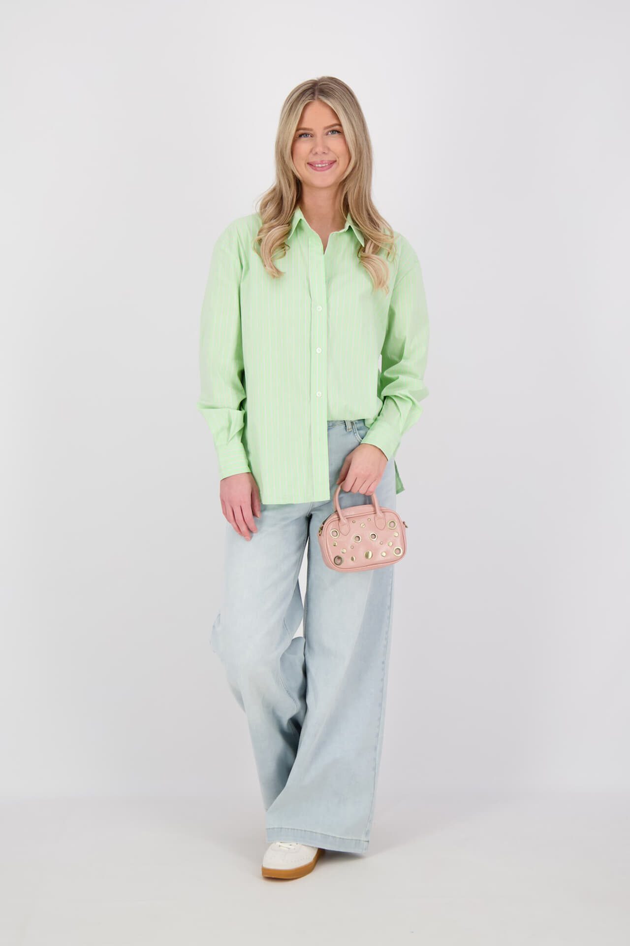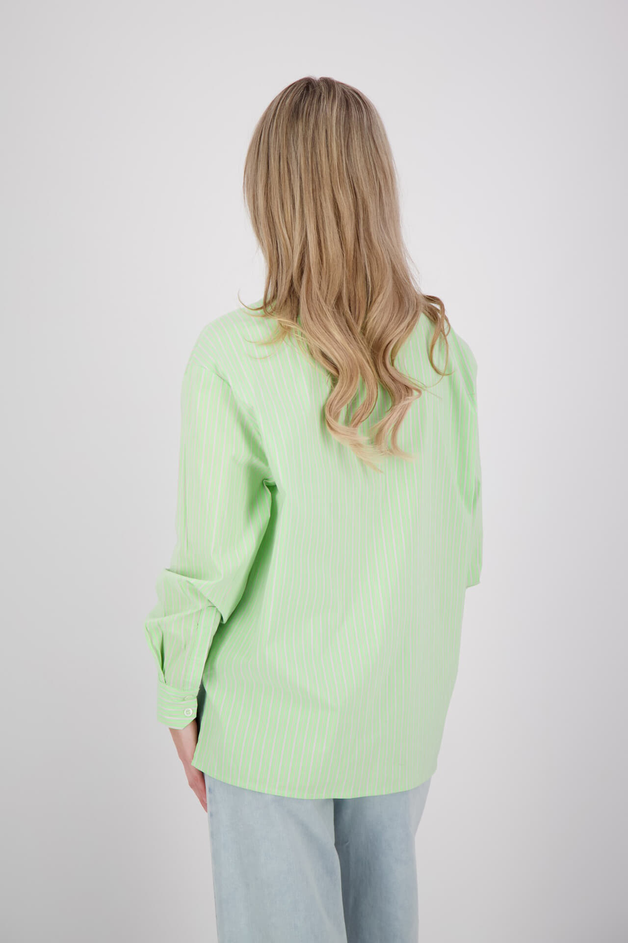 Blouse, dames blouse van The Shirt Project met groene, witte strepen, spreidkraag, knoopsluiting en overhemdkraag. De regular pasvorm en lange mouwen met manchetten met knopen geven een verzorgde, comfortabele uitstraling, geschikt voor casual en netjes. Subtiel logo-detail onderaan.