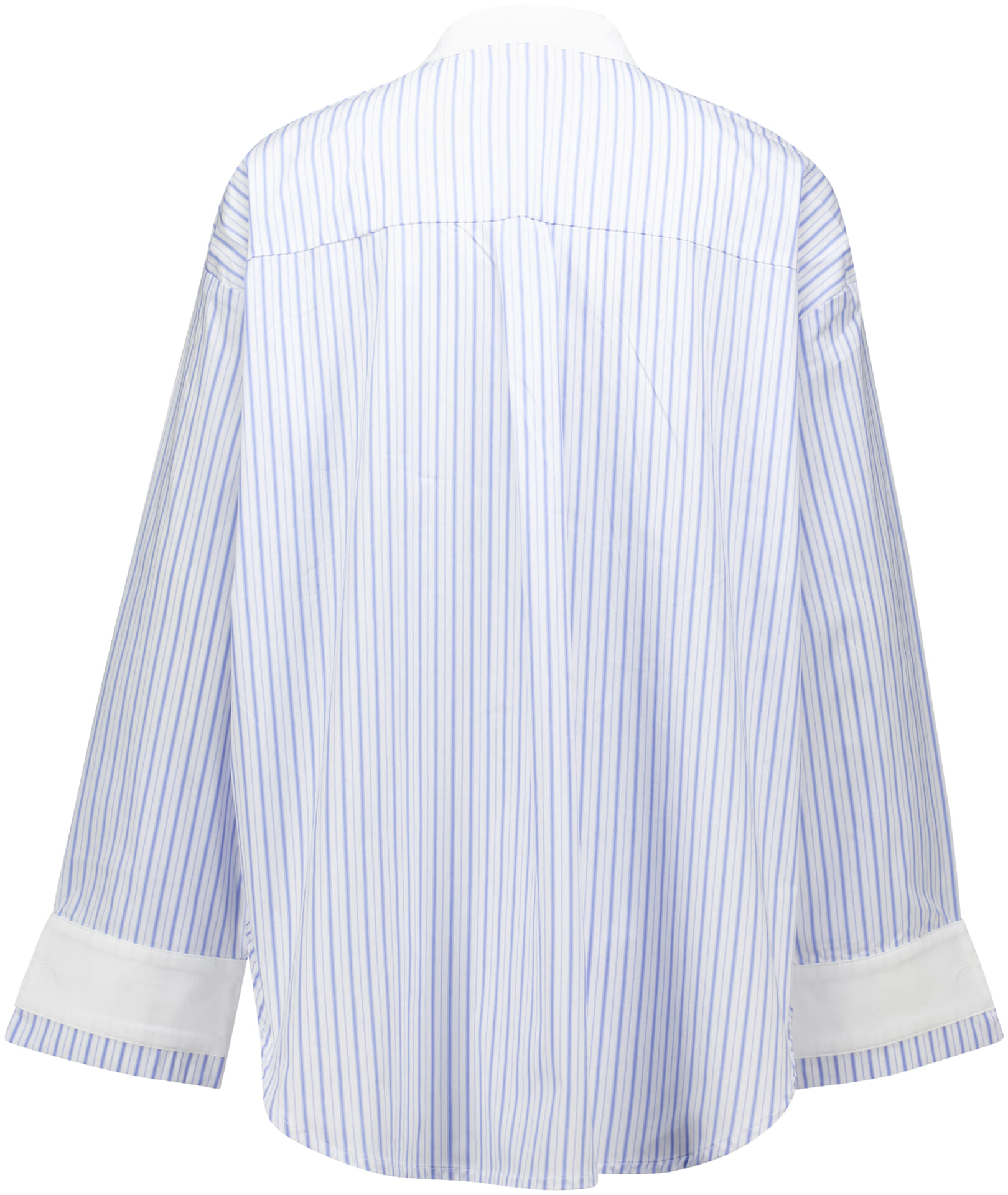 Dames blouse van The Shirt Project met streeppatroon, bandkraag met opstaande kraag en knoopsluiting. De losse pasvorm en lange mouwen zorgen voor comfort, terwijl brede manchetten met knopen een nette afwerking geven. Geschikt voor casual en zakelijke momenten, met contrasterende witte boord en manchetten.
