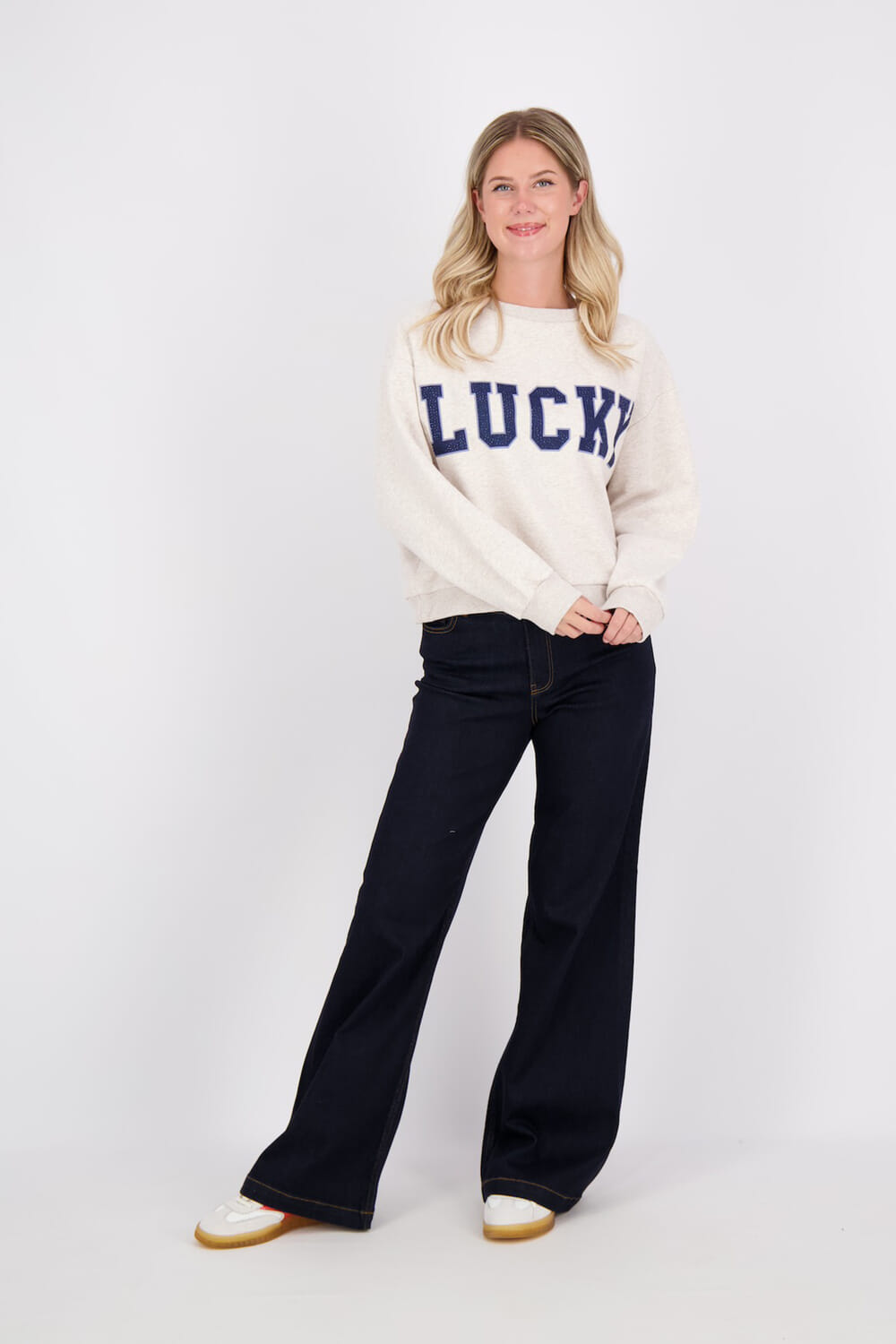 Deze casual sweater van The Shirt Project heeft een oversized pasvorm en een ronde hals. De ribgebreide mouwboorden zorgen voor extra comfort, terwijl het effen patroon met opvallende "LUCKY" tekst een speelse uitstraling geeft. Perfect voor een ontspannen en modieuze look.
