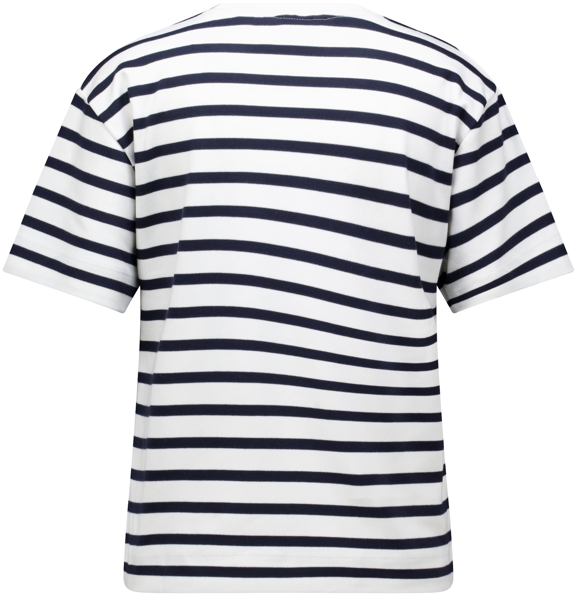 T-shirt van The Shirt Project, casual uitstraling, ronde hals, korte mouwen en streeppatroon. Op de borst staat een grote smileyprint met een klein geel accent, de rechte pasvorm draagt makkelijk en combineert moeiteloos met jeans of een rok.