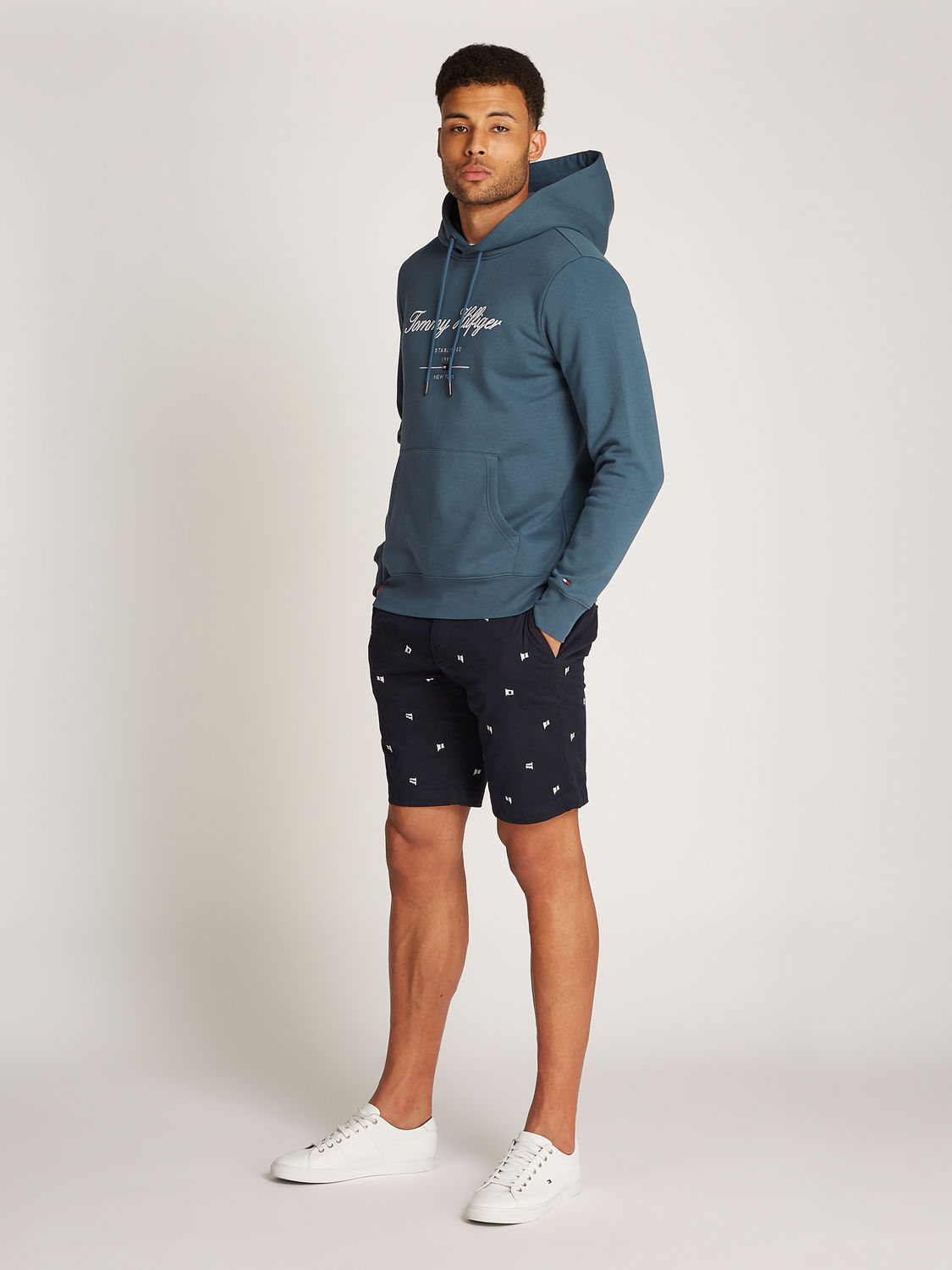 De Hoodie Script Tommy Logo van Tommy Hilfiger is een casual heren hoodie met een ribgebreid mouwboord en koordsluiting. Deze regular fit hoodie heeft een capuchon met koord en een opvallend logo patroon, ideaal voor een ontspannen, stijlvolle look.