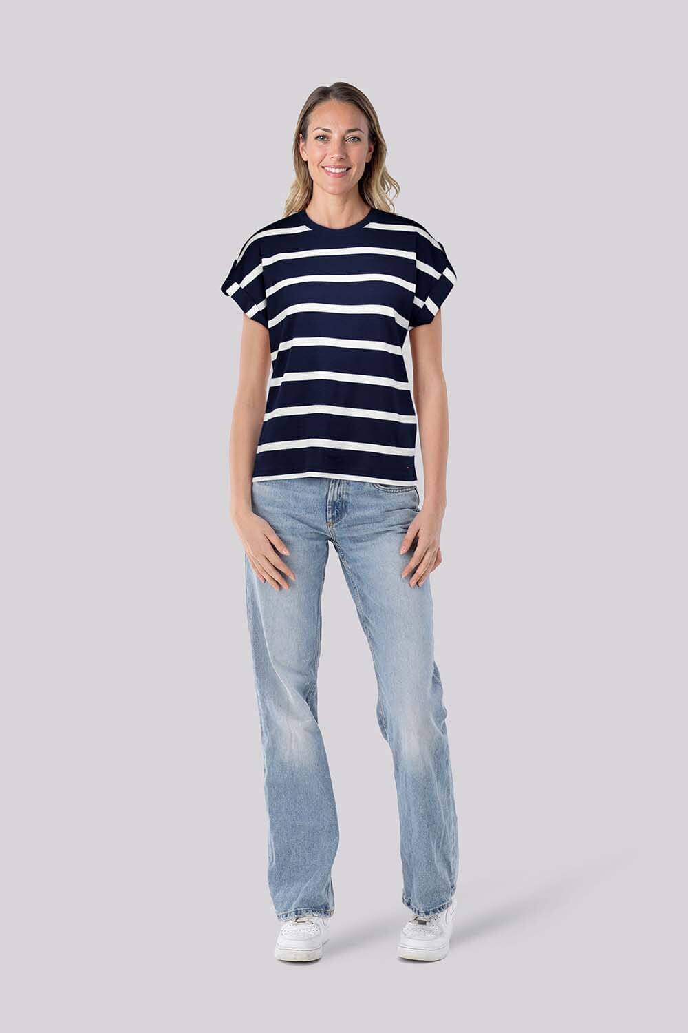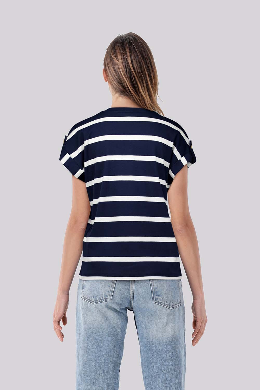 Dit is een casual dames t-shirt met een stijlvolle streep. Het ontwerp met een ronde hals en korte mouwen voorzien van knoopmanchetten maakt dit t-shirt een veelzijdige keuze voor elke gelegenheid.